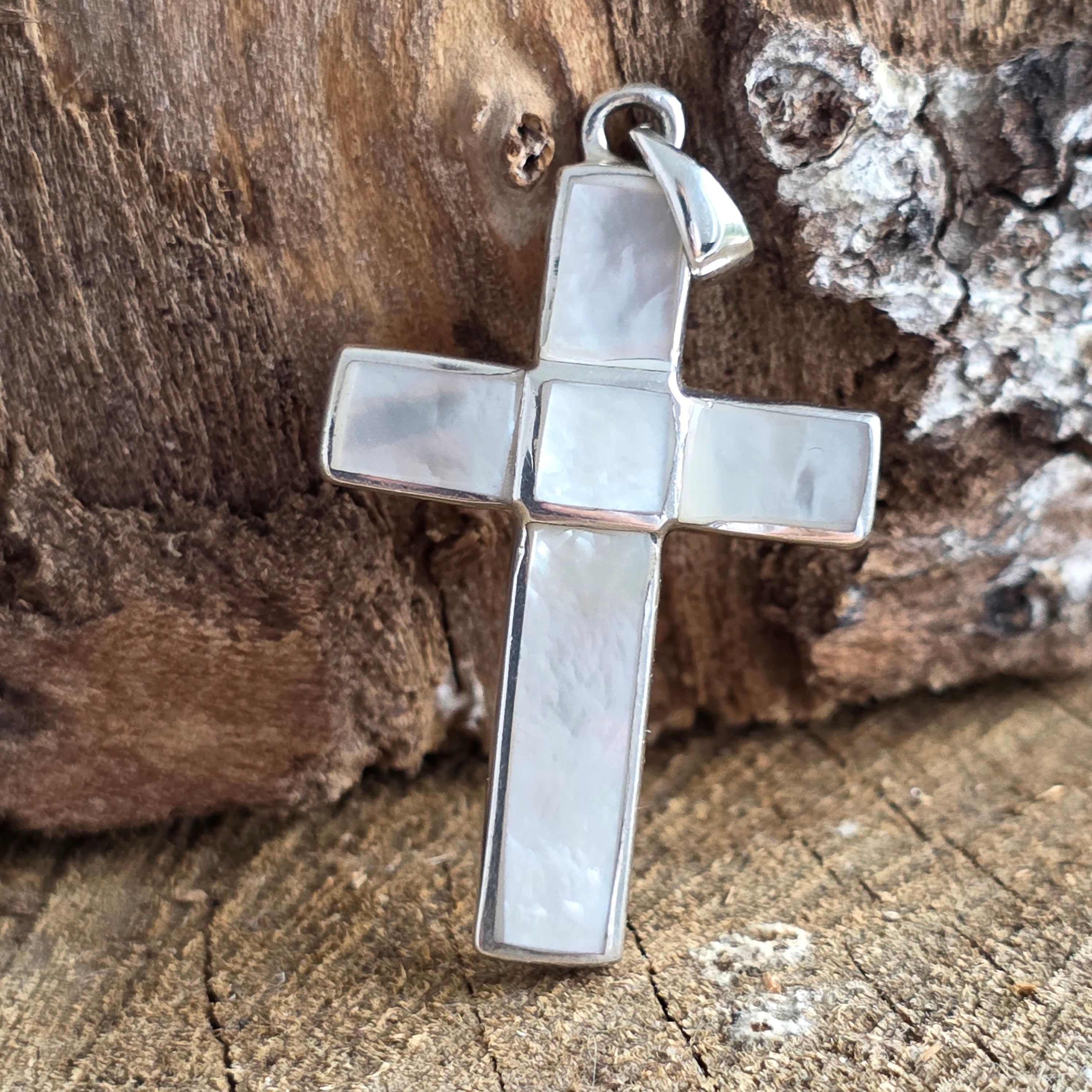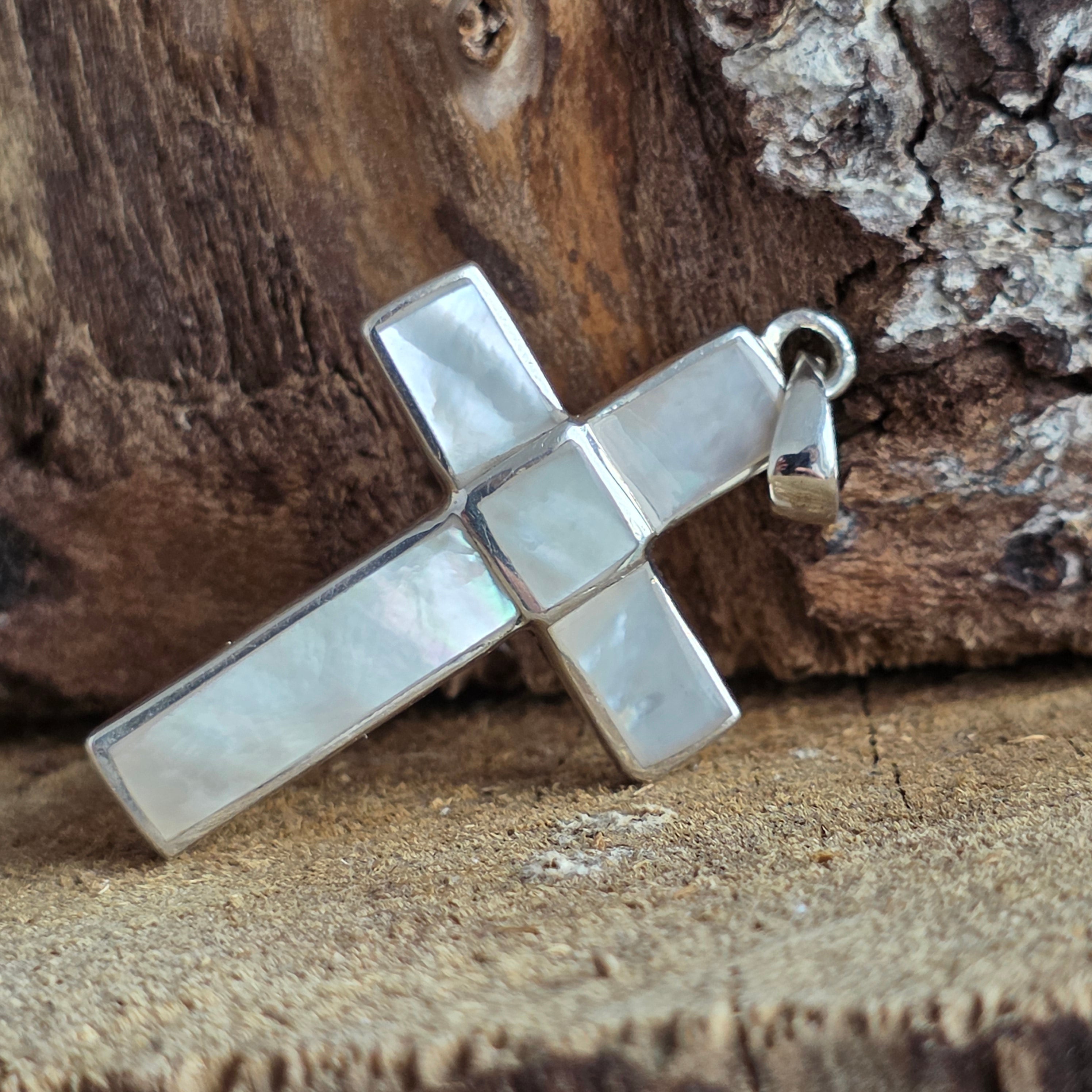 A klasszikus keresztforma a védelmet, a hitet és a belső egyensúlyt szimbolizálja, az egyszerű, letisztult vonalvezetésű keret pedig a gyöngyház szerves fényességét emeli ki.