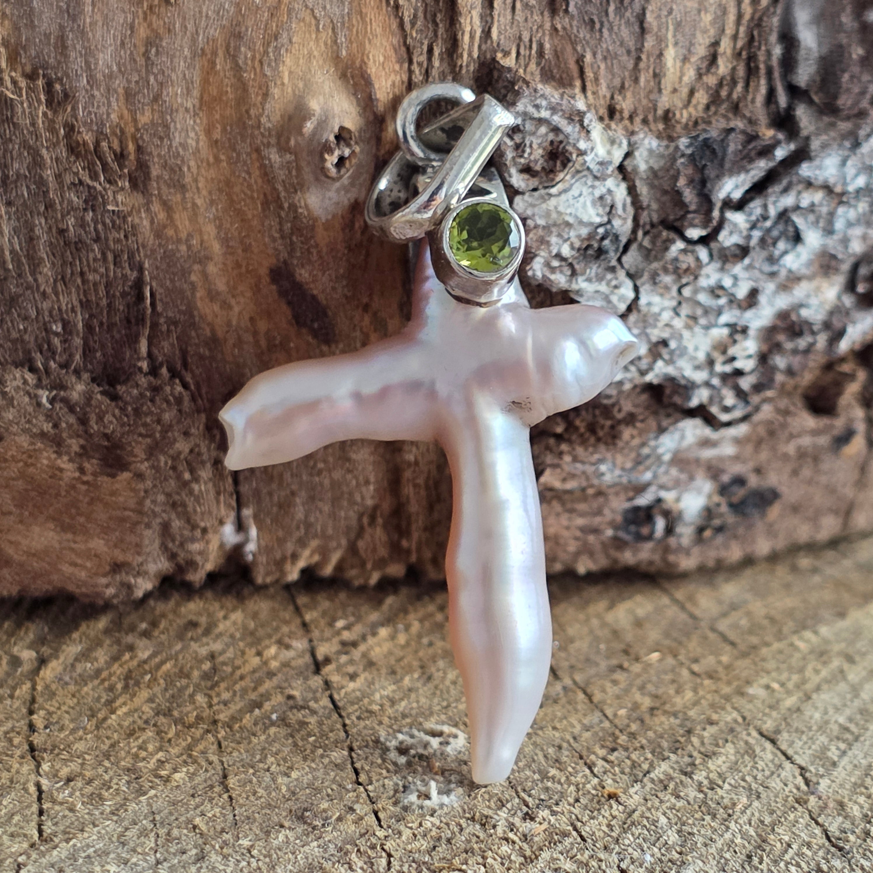 Ez az elegáns medál a természetes gyöngyház szabálytalan kereszt alakjában harmonikusan ötvözi a tenger szépségét a föld energiájával.
