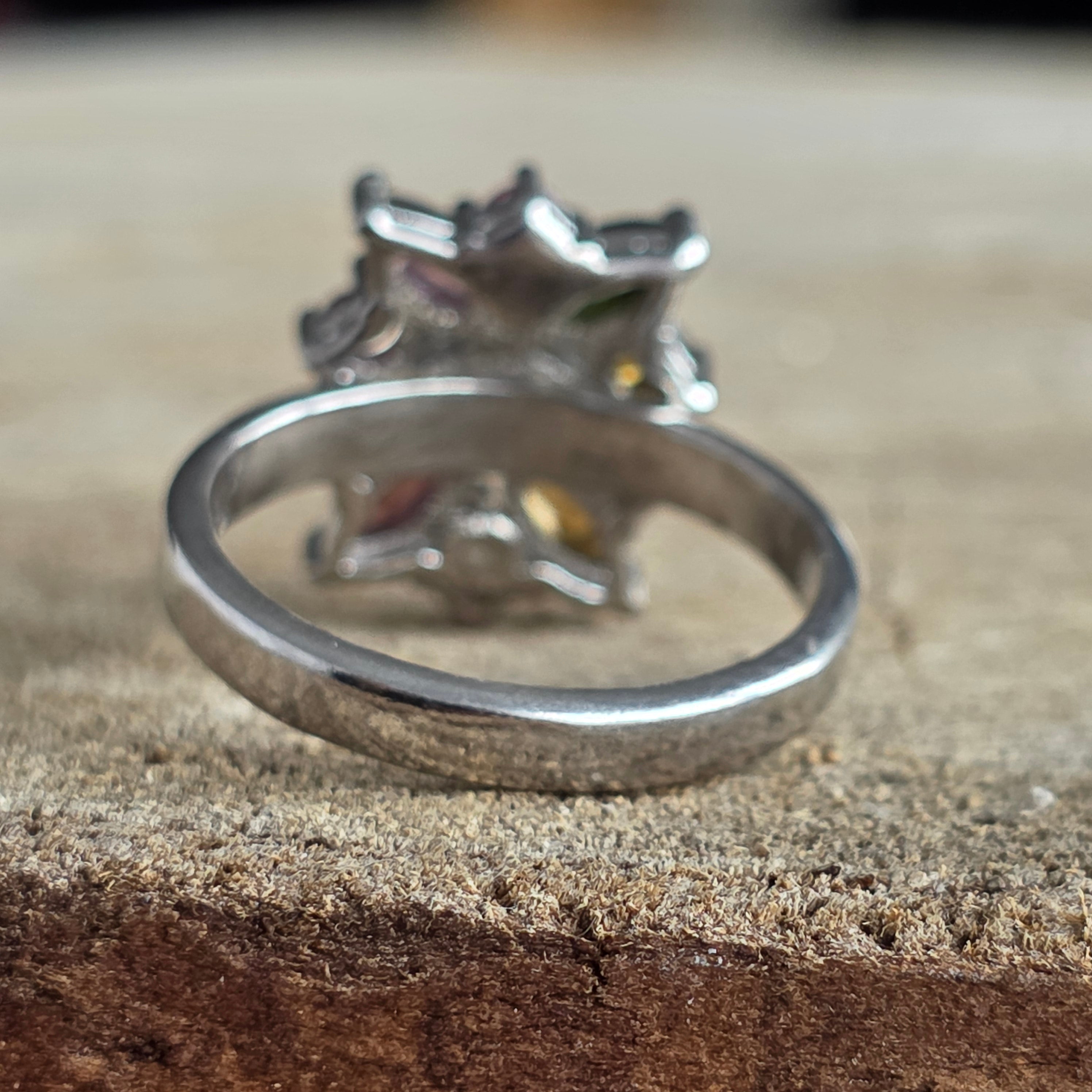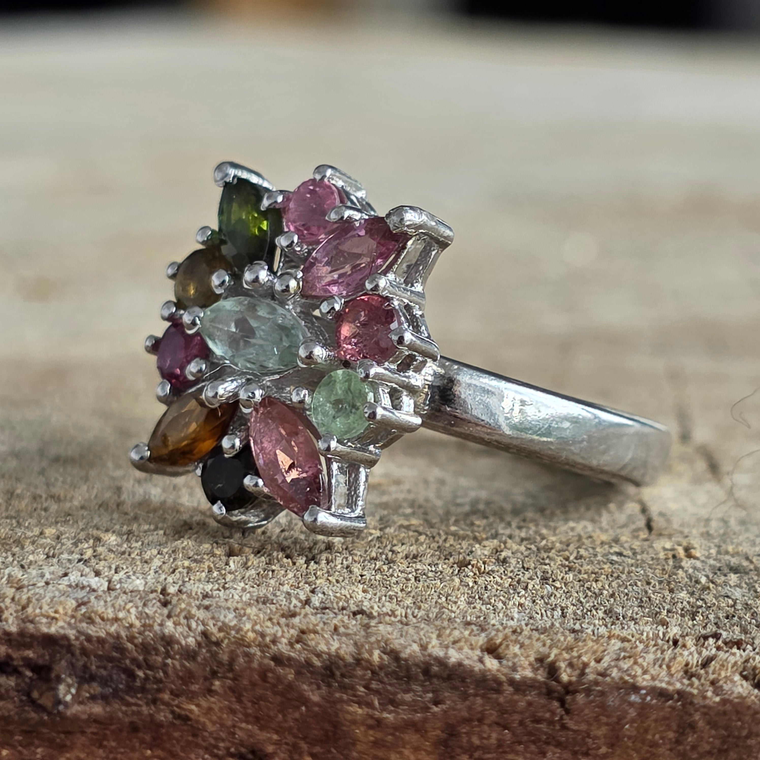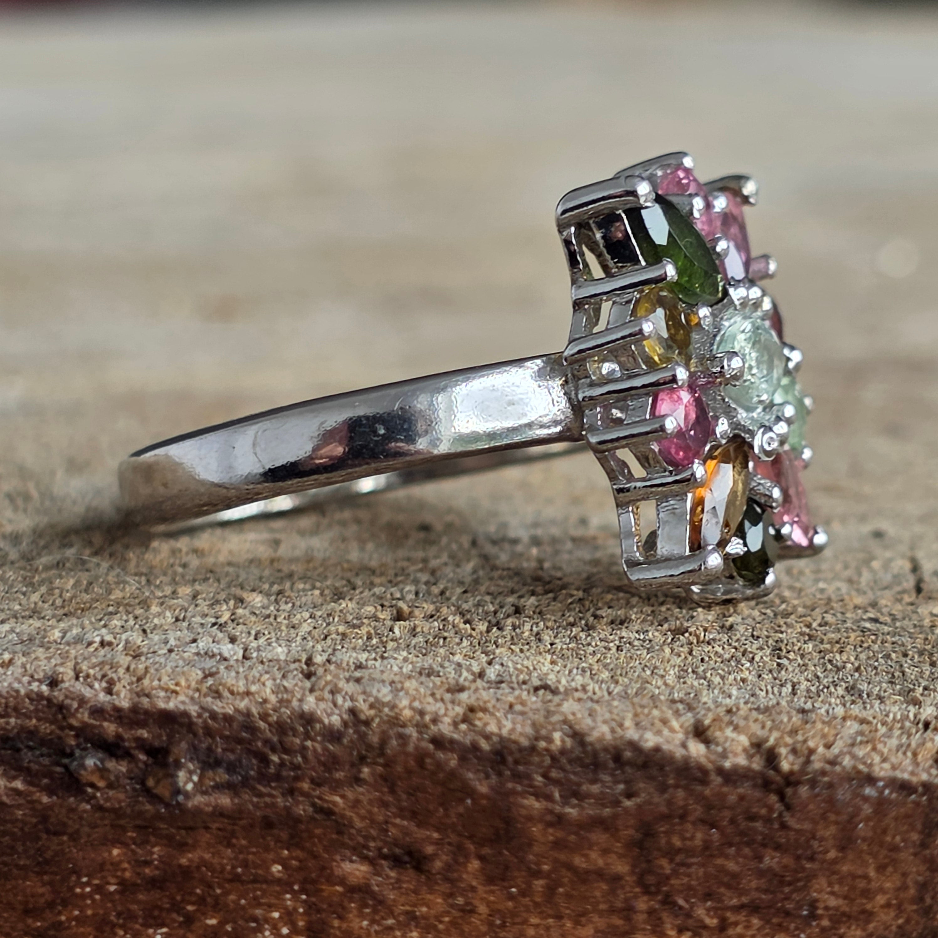 A színek és a kifinomultság robbanása – ez 925 ezüst ródiummal bevont gyűrű életre kelti a vibráló spektrumát természetes turmalinok, elegáns virágmintával rendezve.