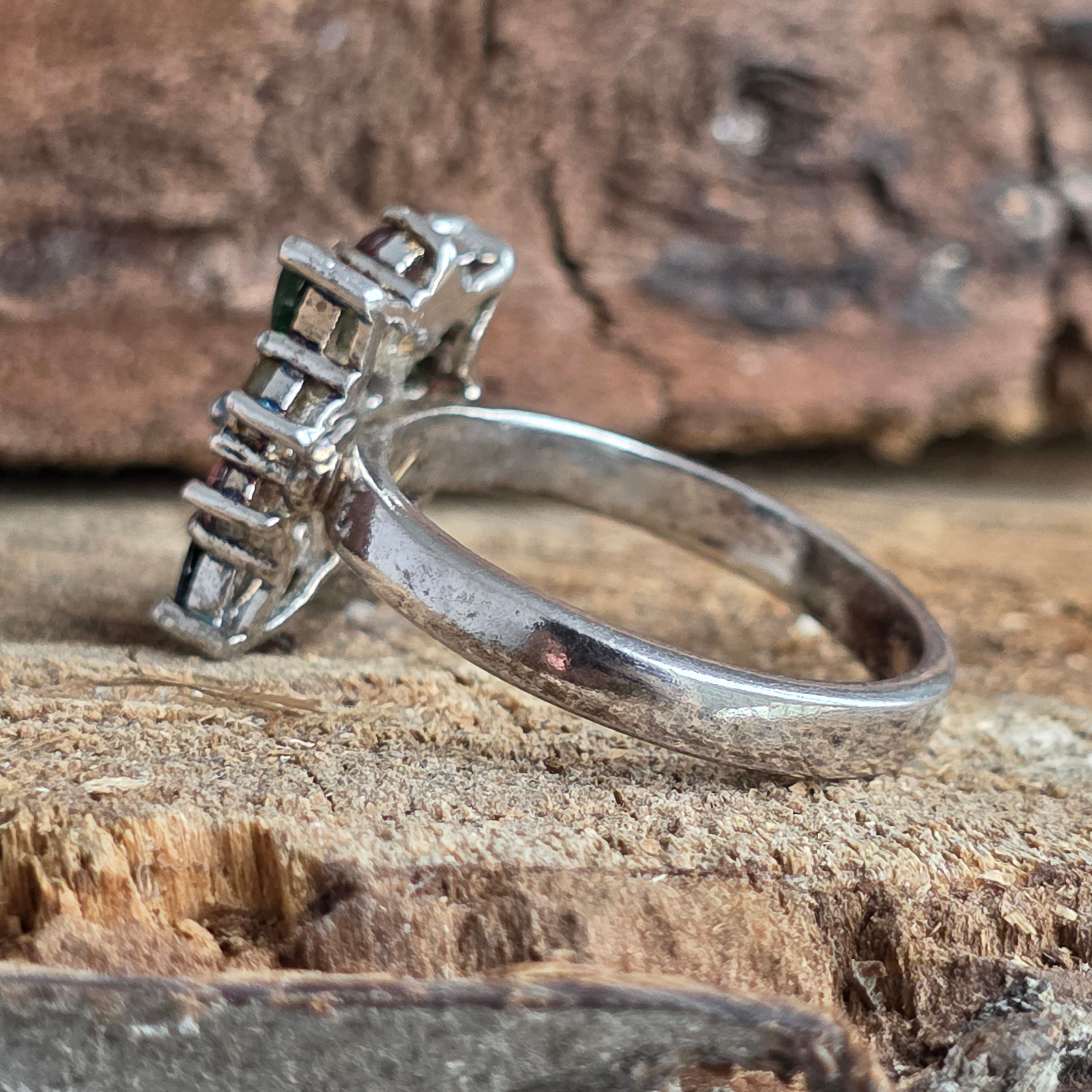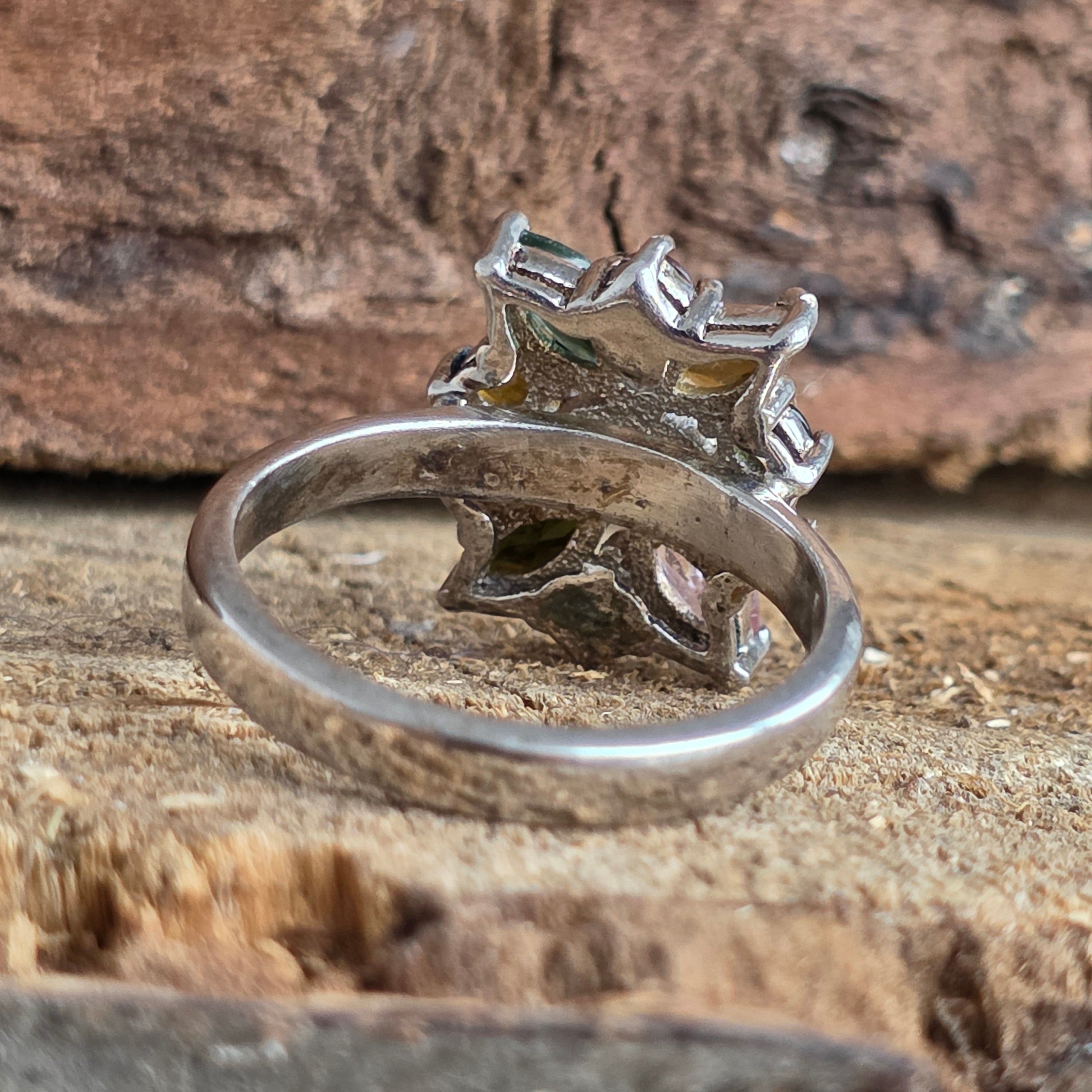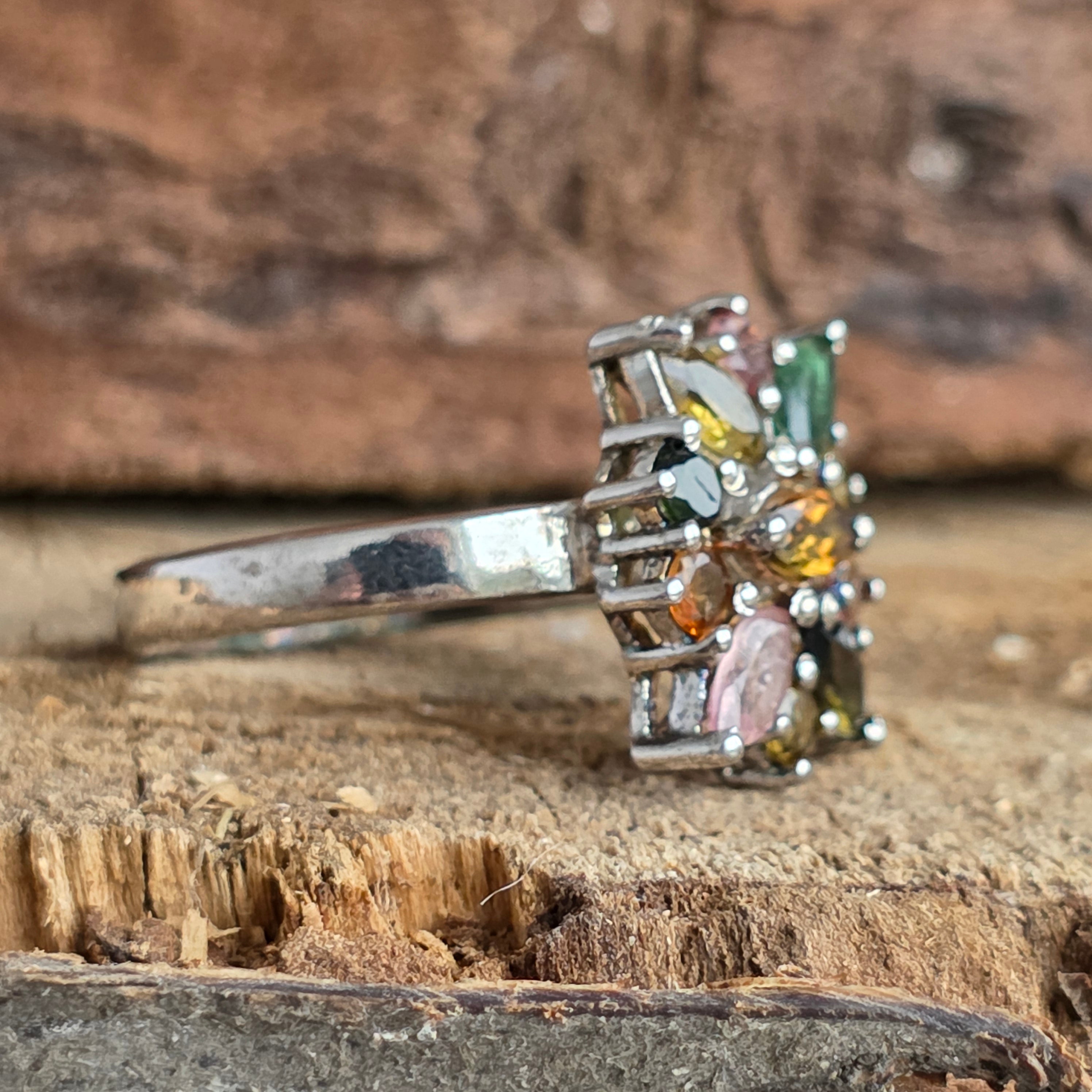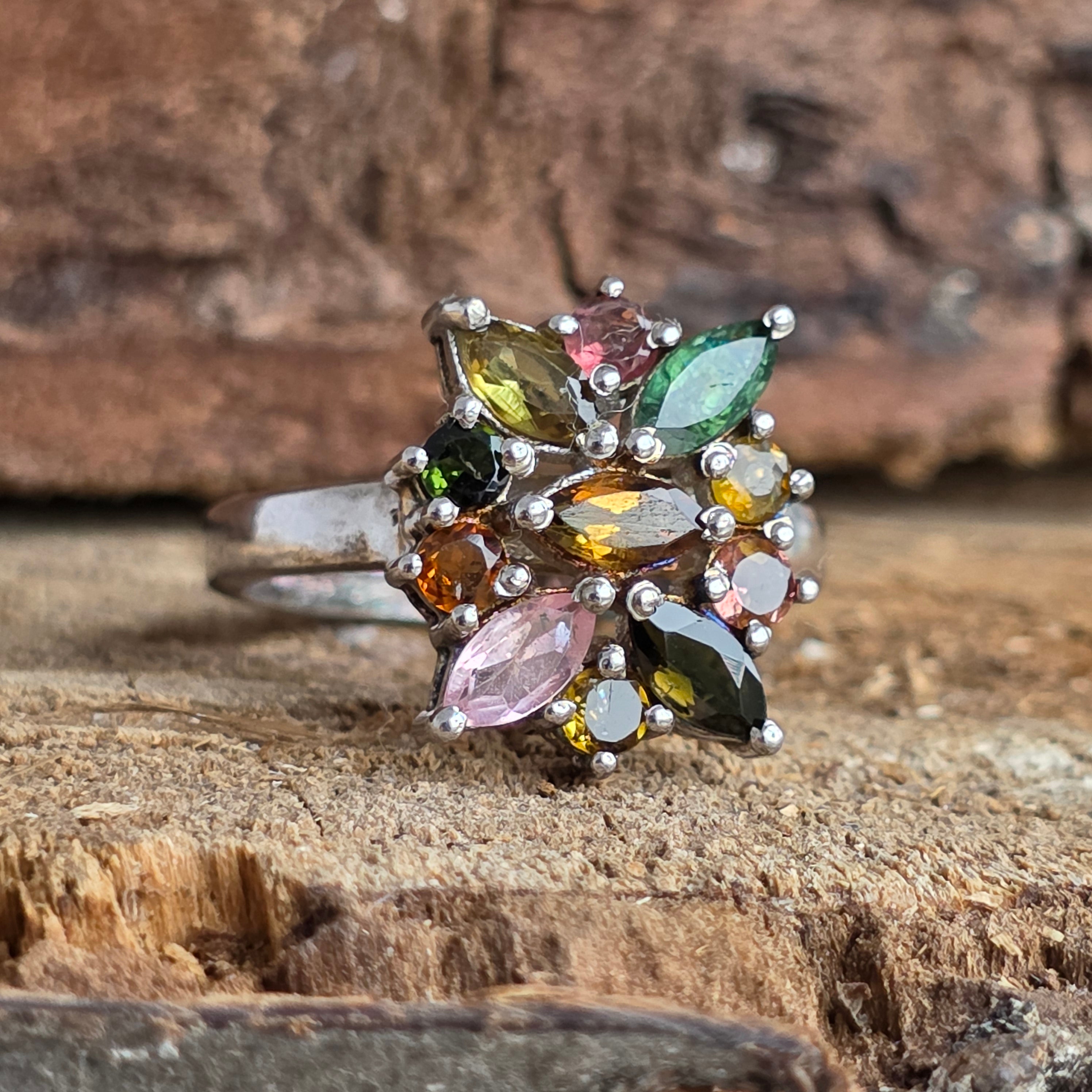 A színek és a kifinomultság robbanása – ez 925 ezüst ródiummal bevont gyűrű életre kelti a vibráló spektrumát természetes turmalinok, elegáns virágmintával rendezve.