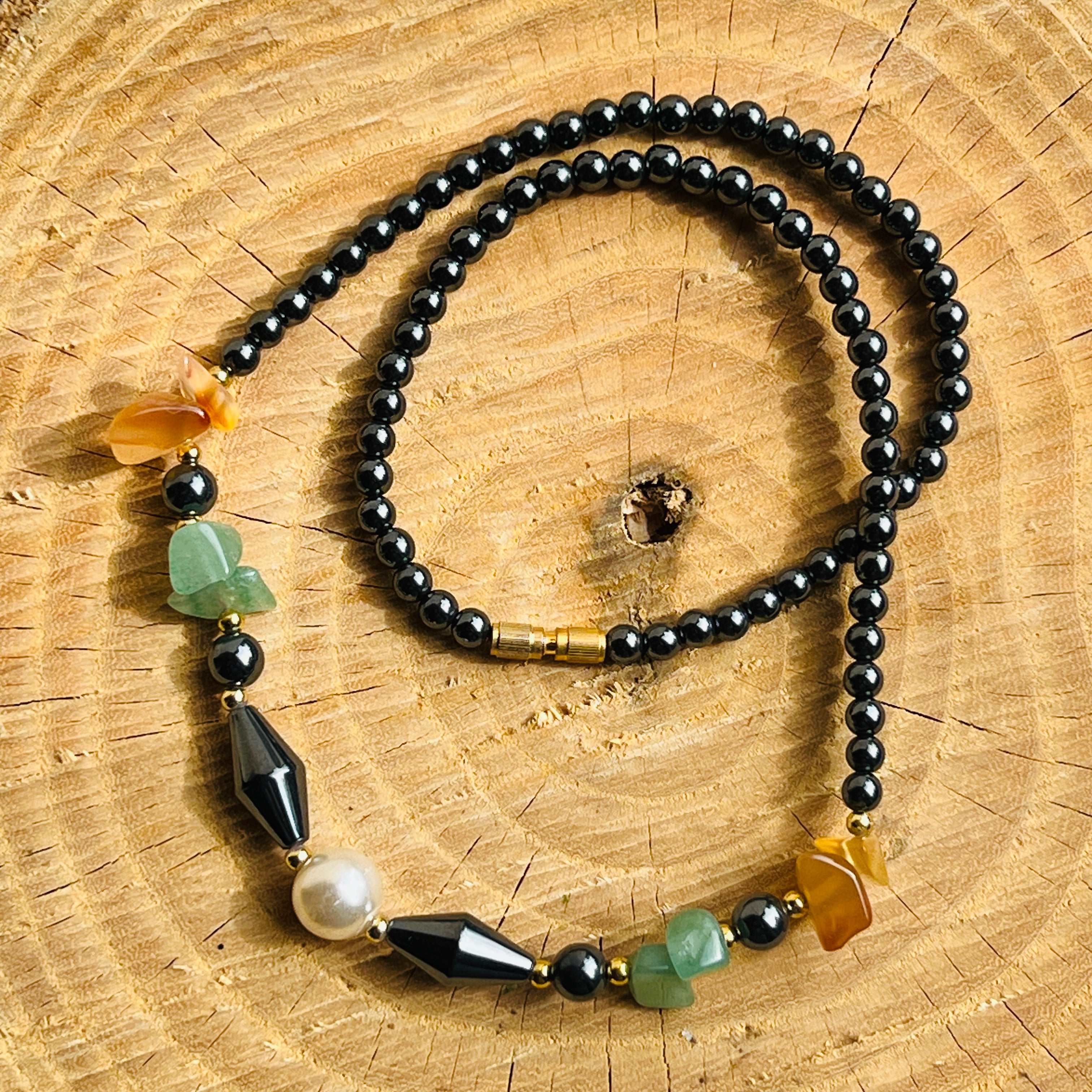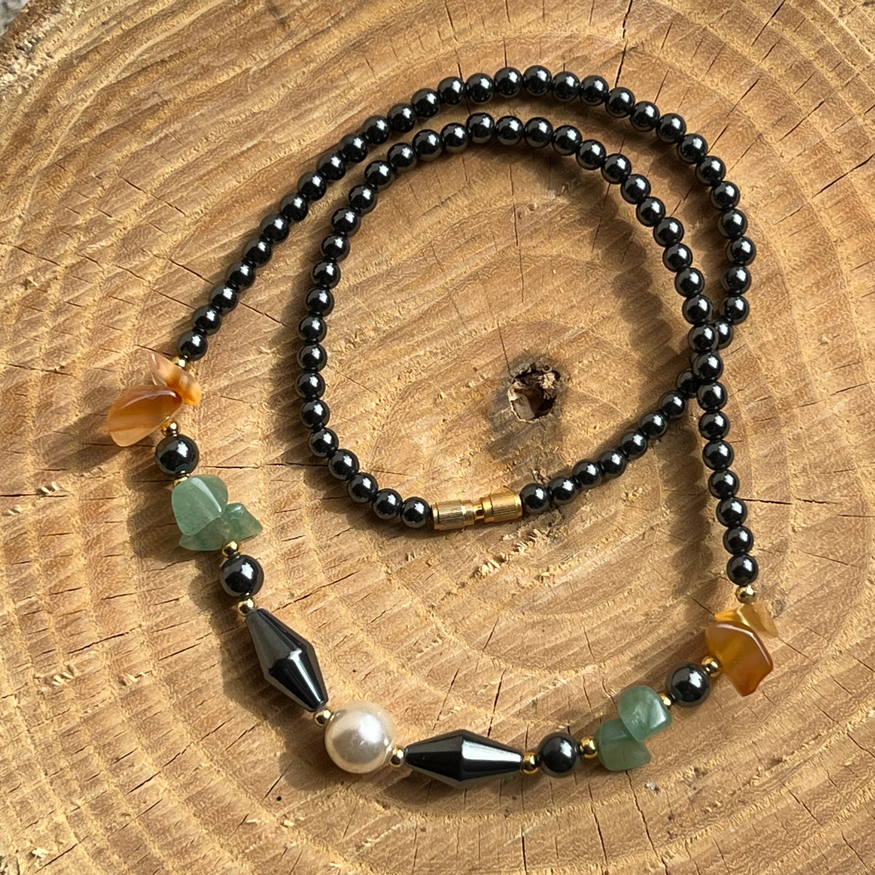 Hematit nyaklánc karneollal, aventurinnal és gyöngyökkel – egyensúly, vitalitás és női báj