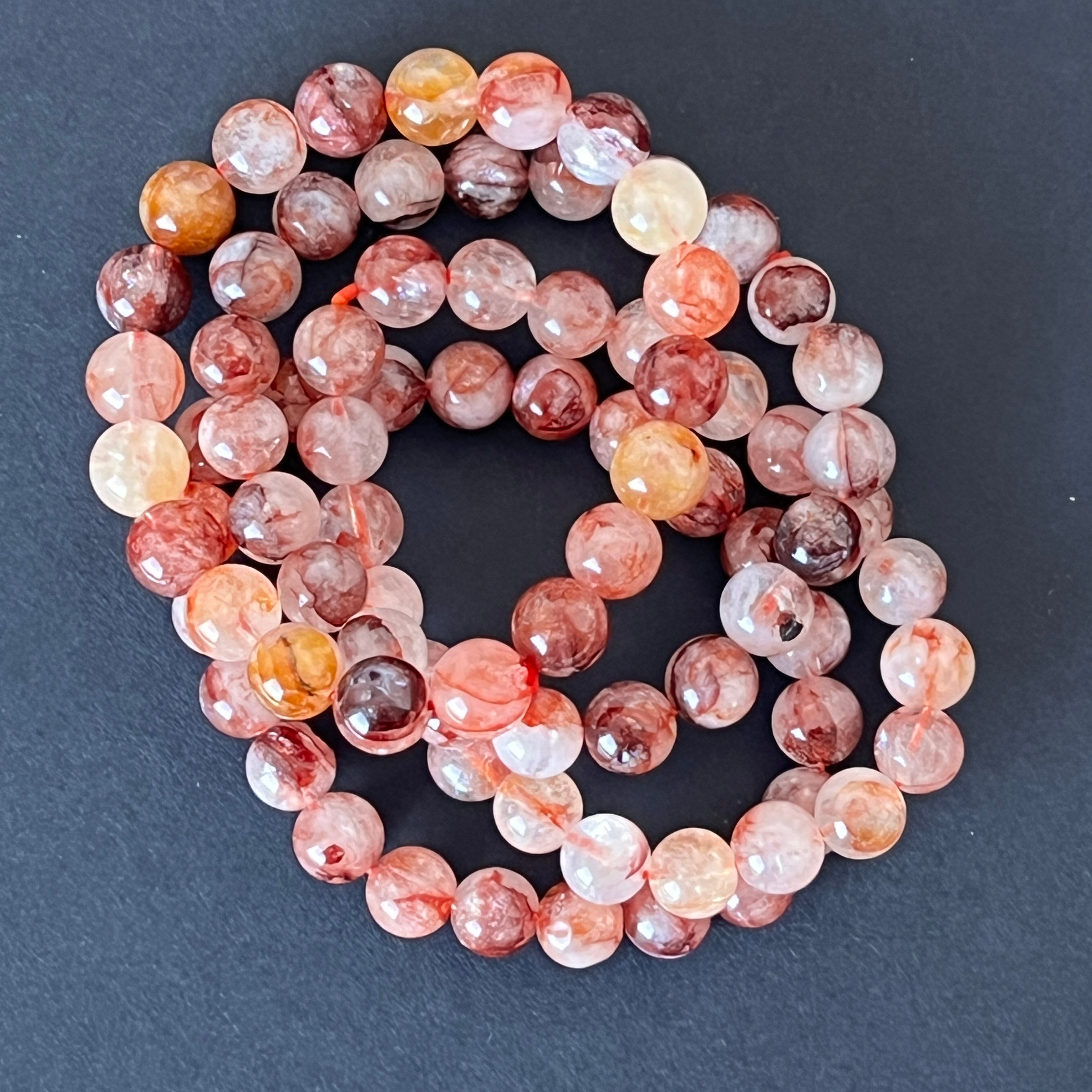 Ez a hematitvörös kvarcból készült karkötő, 9–10 mm-es gömb gyöngyökből áll, látványos ékszer, amely ötvözi a kvarckristály tisztaságát a hematit inklúzióiból származó szenvedélyes vörös és arany árnyalatokkal. Minden gyöngy egyedi, lenyűgöző szín- és fényjátékkal.