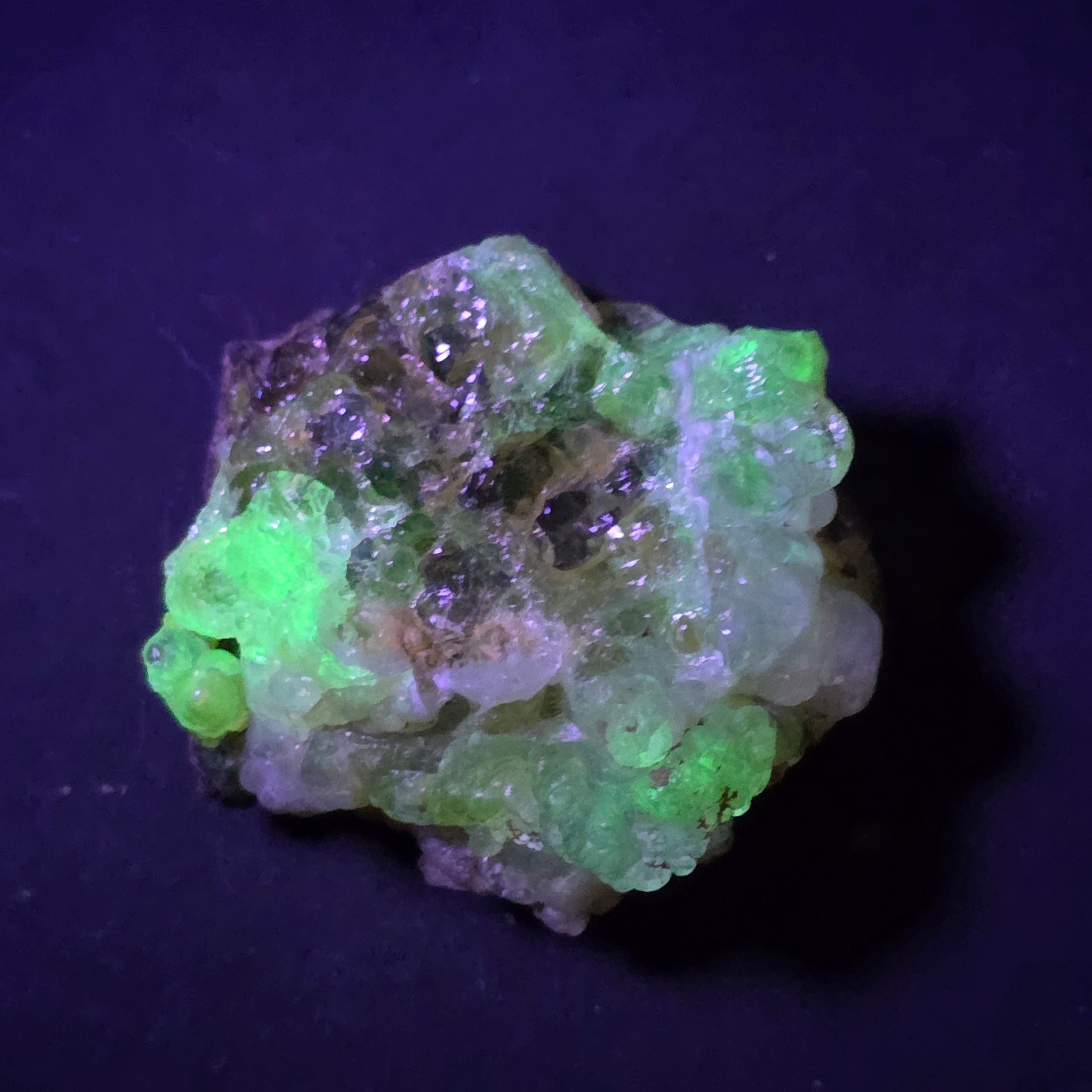 Természetes fényben a hialit opál színtelen vagy fehér áttetsző, diszkrét és elegáns megjelenésű. UV fény alatt azonban az ásvány teljesen átalakul, neonzöld fénytbocsát ki, erőset és egyenleteset, ami rendkívül keresetté teszi a gyűjtők körében. Ez a fluoreszcencia a természetes uránnyomoknak köszönhető a szerkezetében, amelyek nagyon kis mennyiségben és stabil formában vannak jelen.
