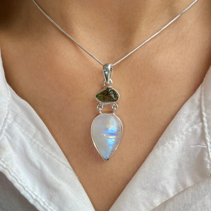 Válassza ezt az ezüst medált holdkővel és természetes moldavittal, egy látványos kombinációját a holdfényes színek finomságának és a moldavit intenzív energiájának. A két kő közötti kontraszt olyan ékszert hoz létre, amely különleges varázslattal bír, ahol a fény és a mélység harmonikusan találkozik.
