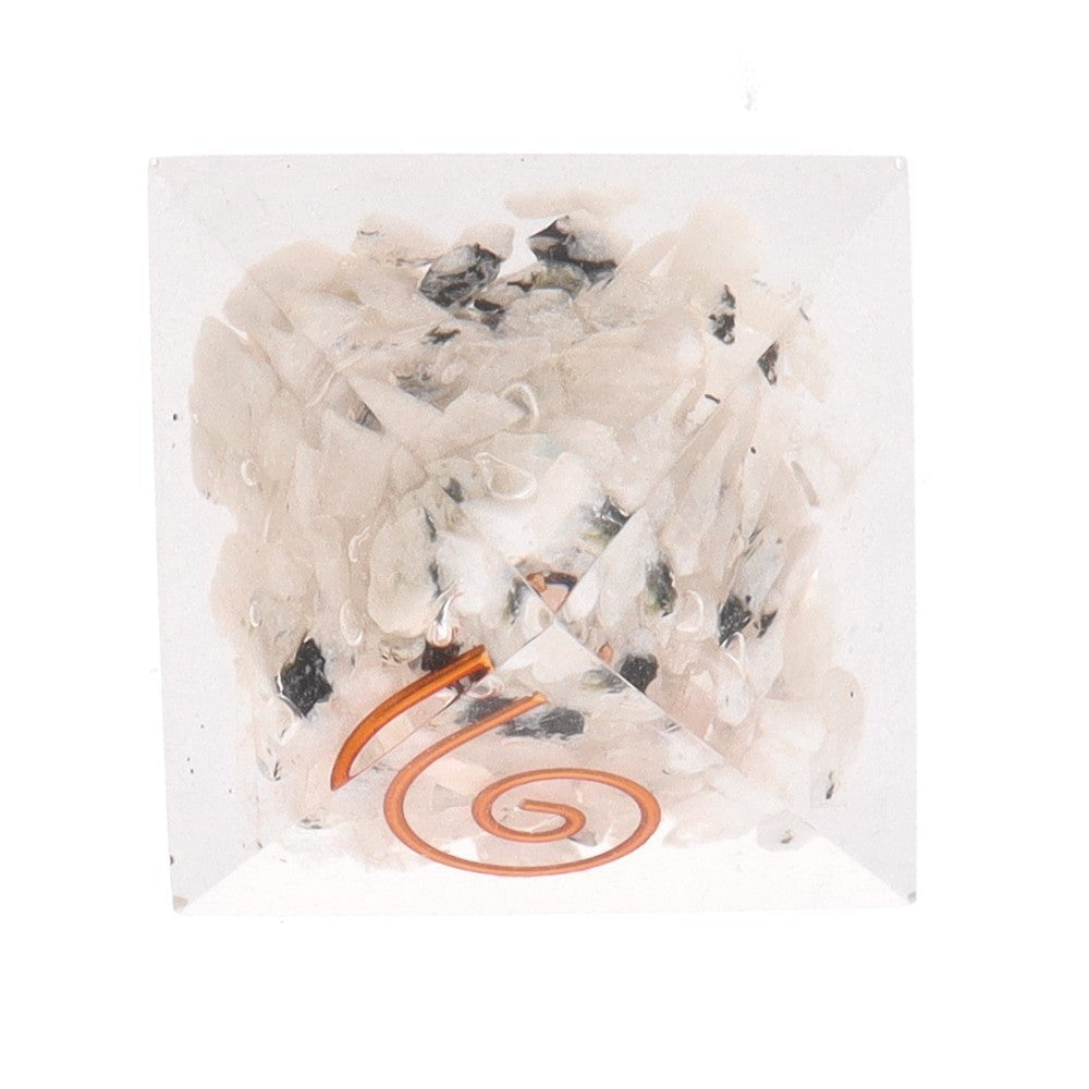 A gyantába ágyazott holdkő piramis elragadó gyöngyházfényű reflexeivel, mintha a holdfényt hozná a tenyeredbe.