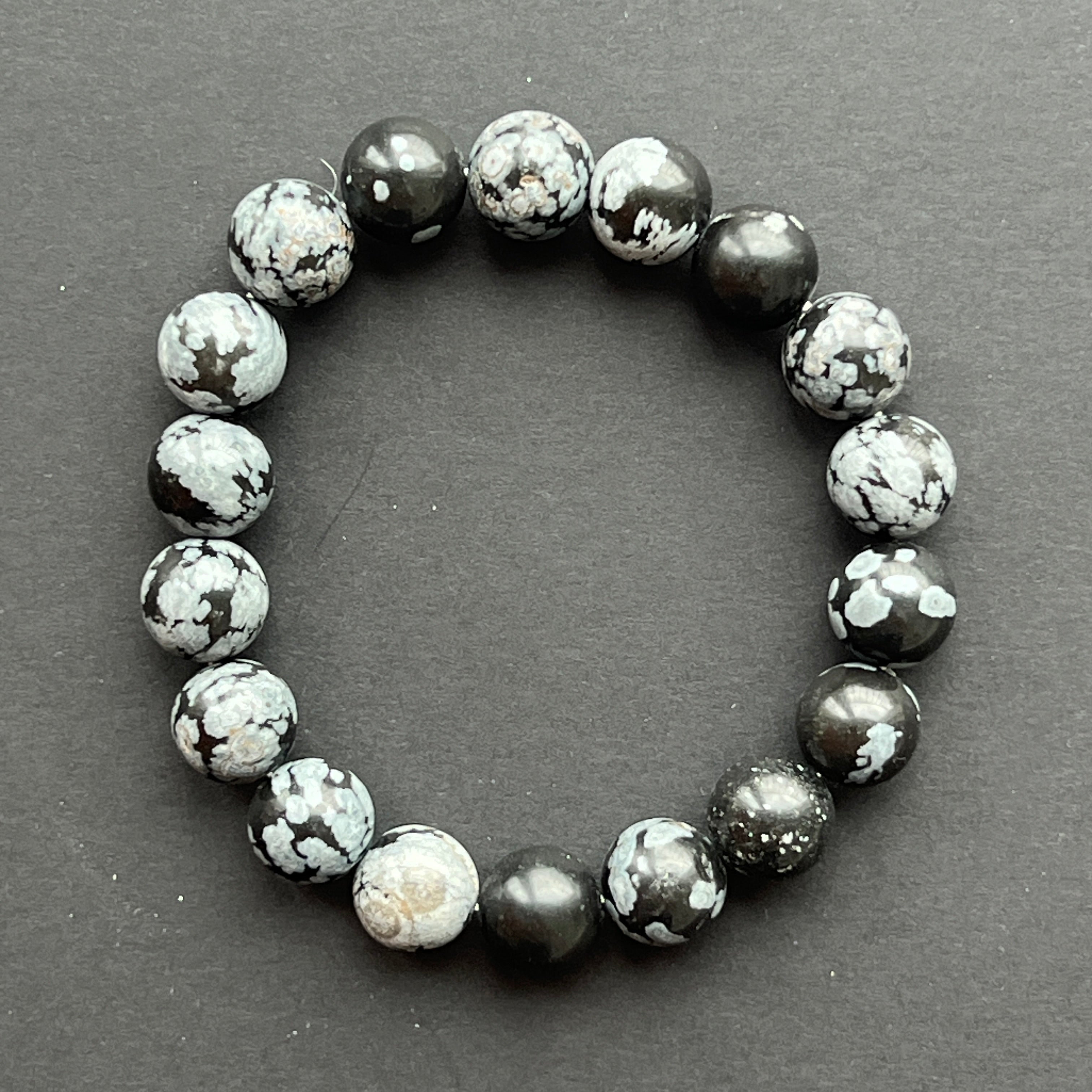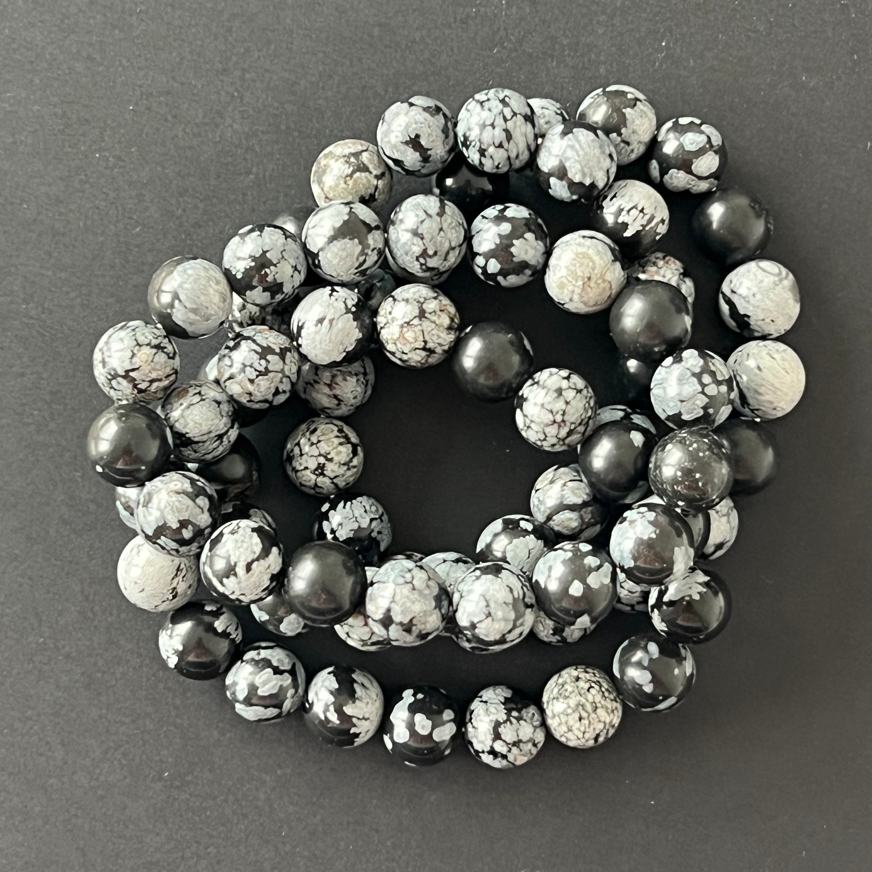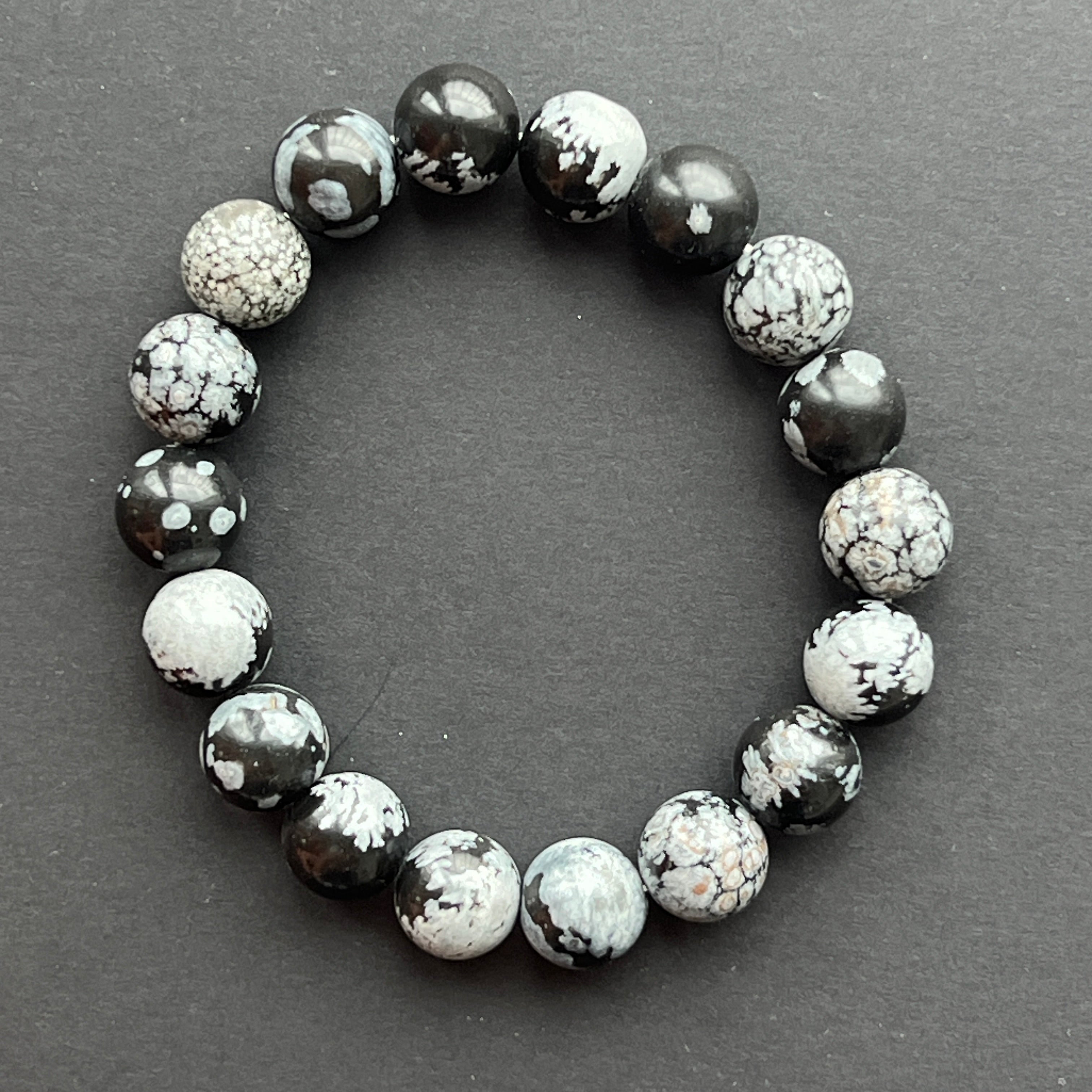 Ez a 10 mm-es gömb gyöngyökből készült hópehely obszidián karkötő feltűnő a mély fekete és a fehér pöttyök erős kontrasztja miatt, amelyek a hópelyhek éjszakai táncát idézik. Minden karkötő egyedi, a természetes mintázat eltérő.