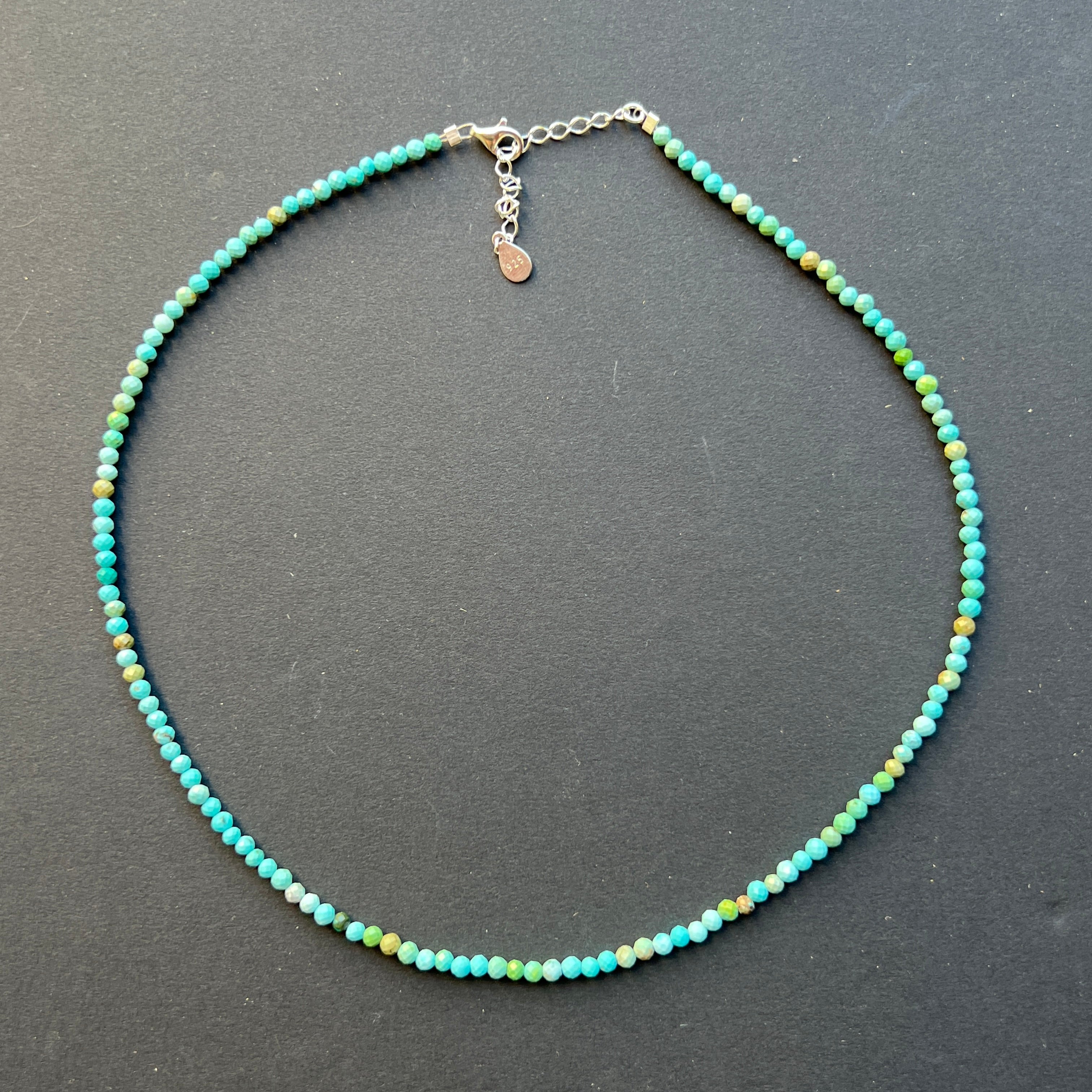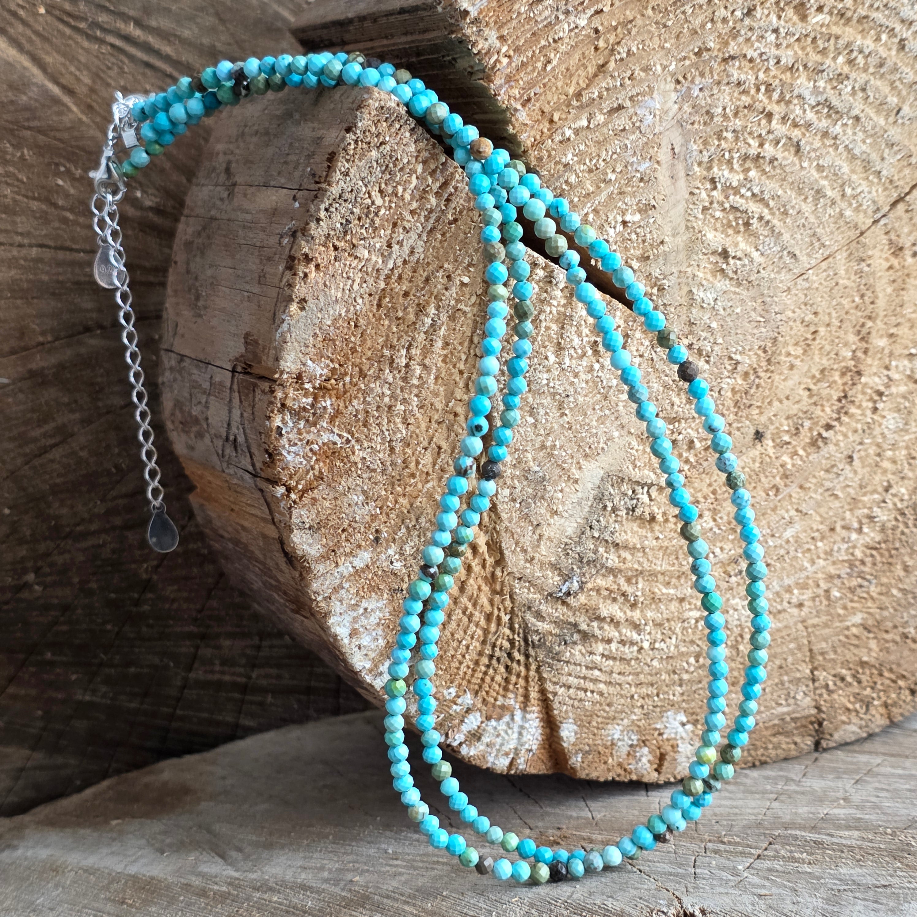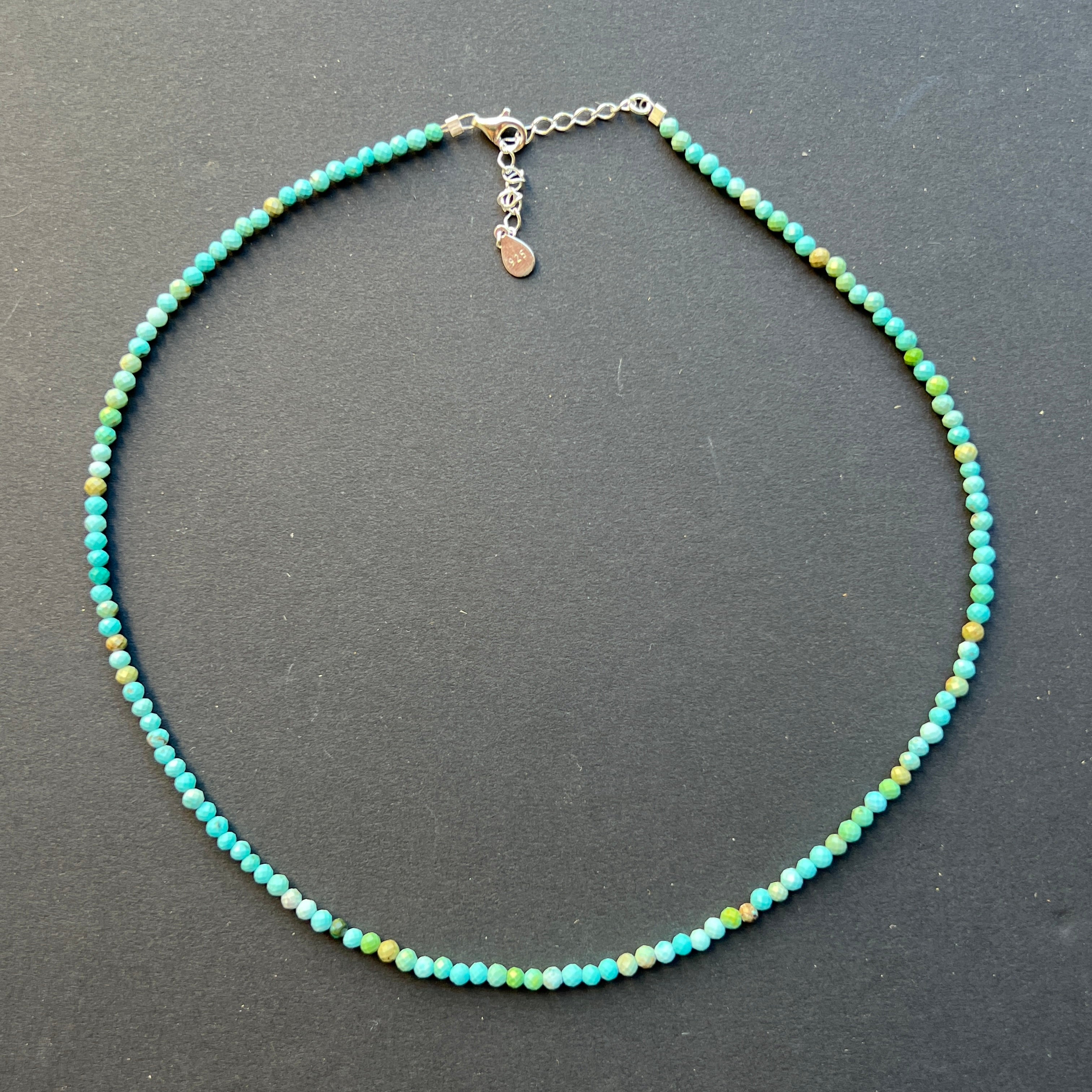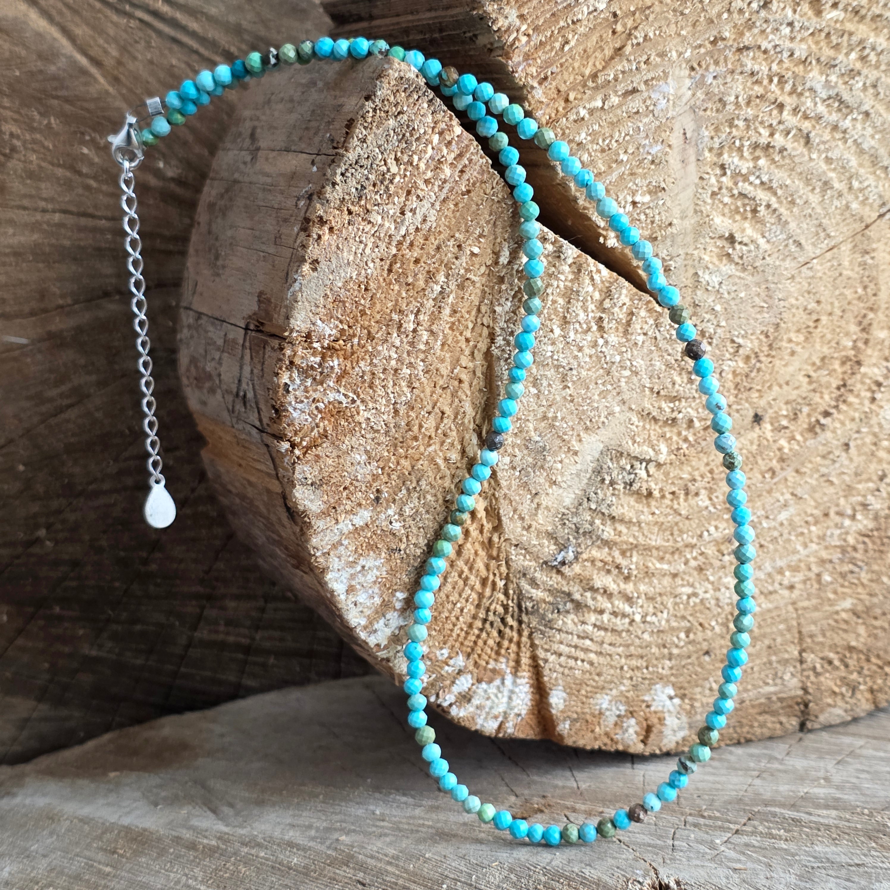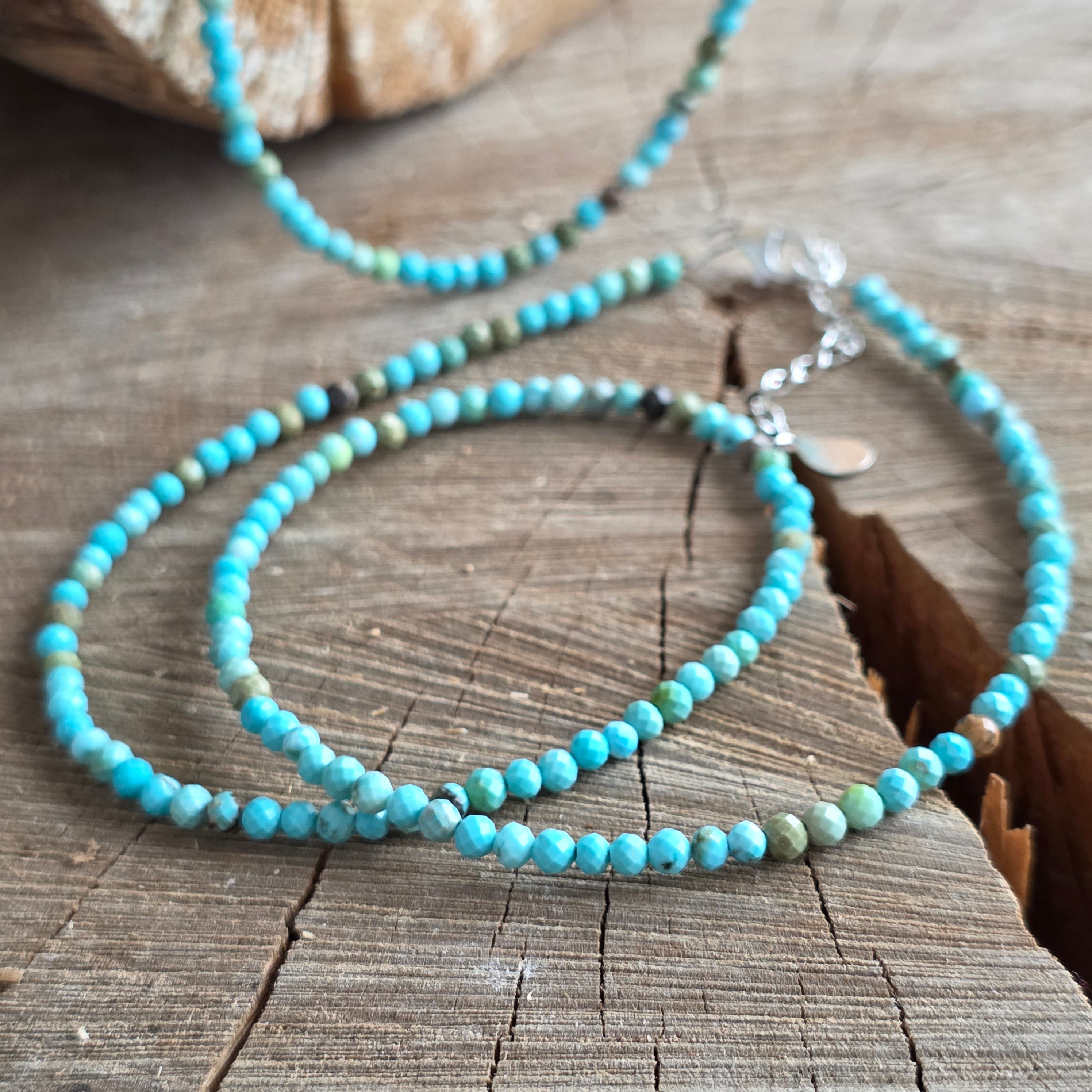 Egy nyaklánc, amely magán viseli a tiszta égbolt nyugalmát és egy reggel energiáját, amely tele van lehetőségekkel. Természetes turkenitből készült, 3 mm-es fazettált gyöngyökkel, ez a finom nyaklánc olyan, mint egy vékony világoskék vonal a nyak tövében – emlékeztetve a tiszta horizontokra és a könnyed gondolatokra.