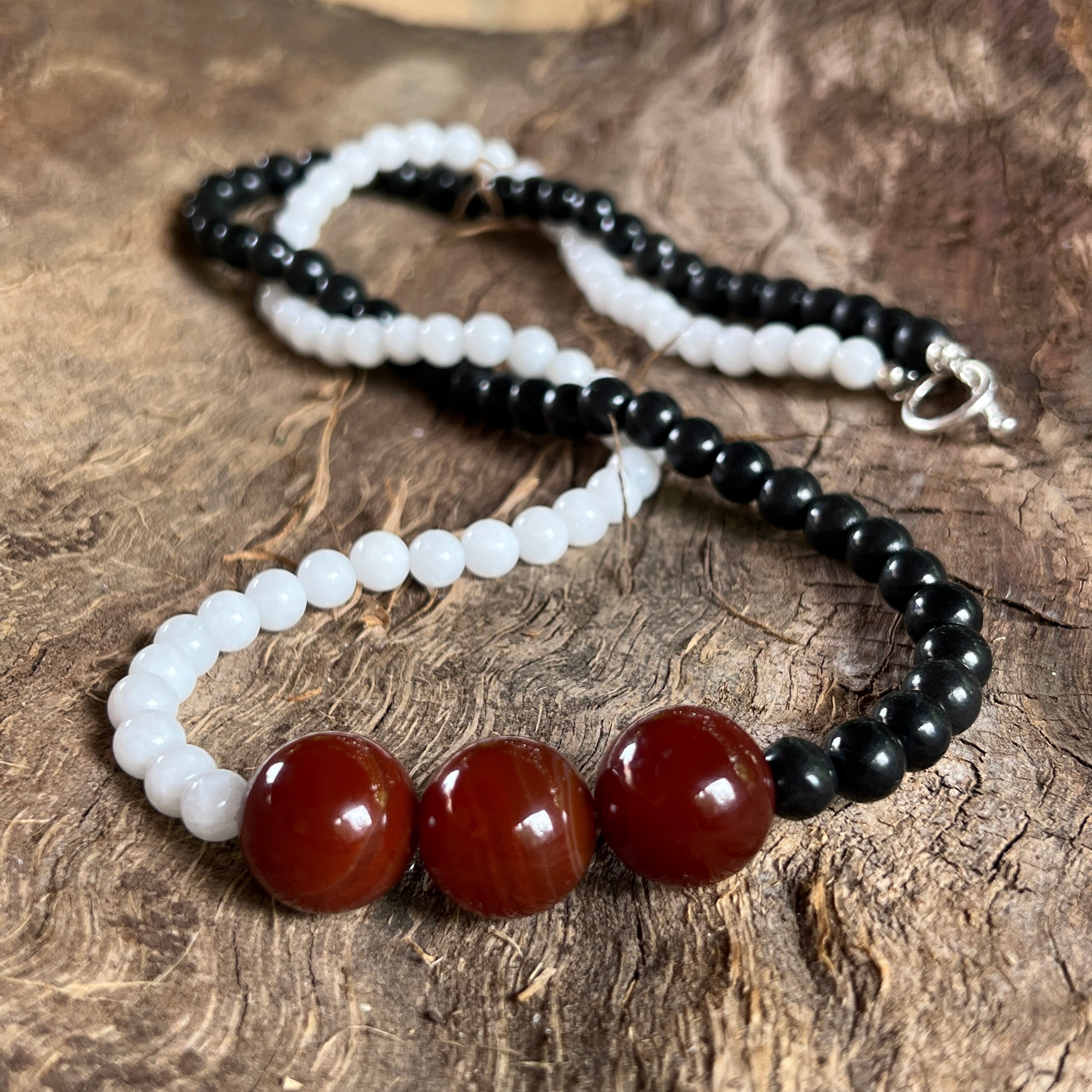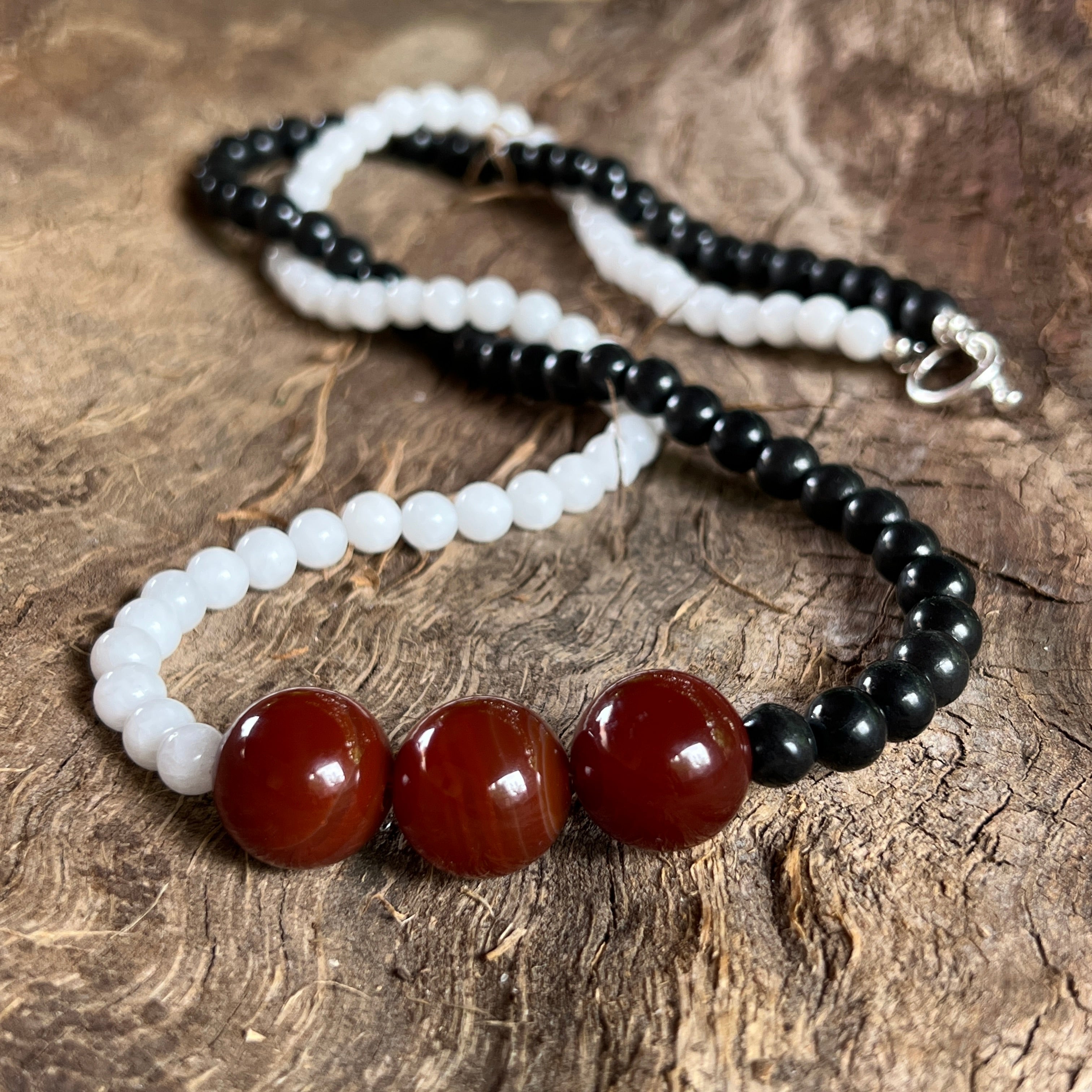 Hosszú nyaklánc, amely shungitából, fehér jádeből és karneválból készült, Gyökeres fény#14