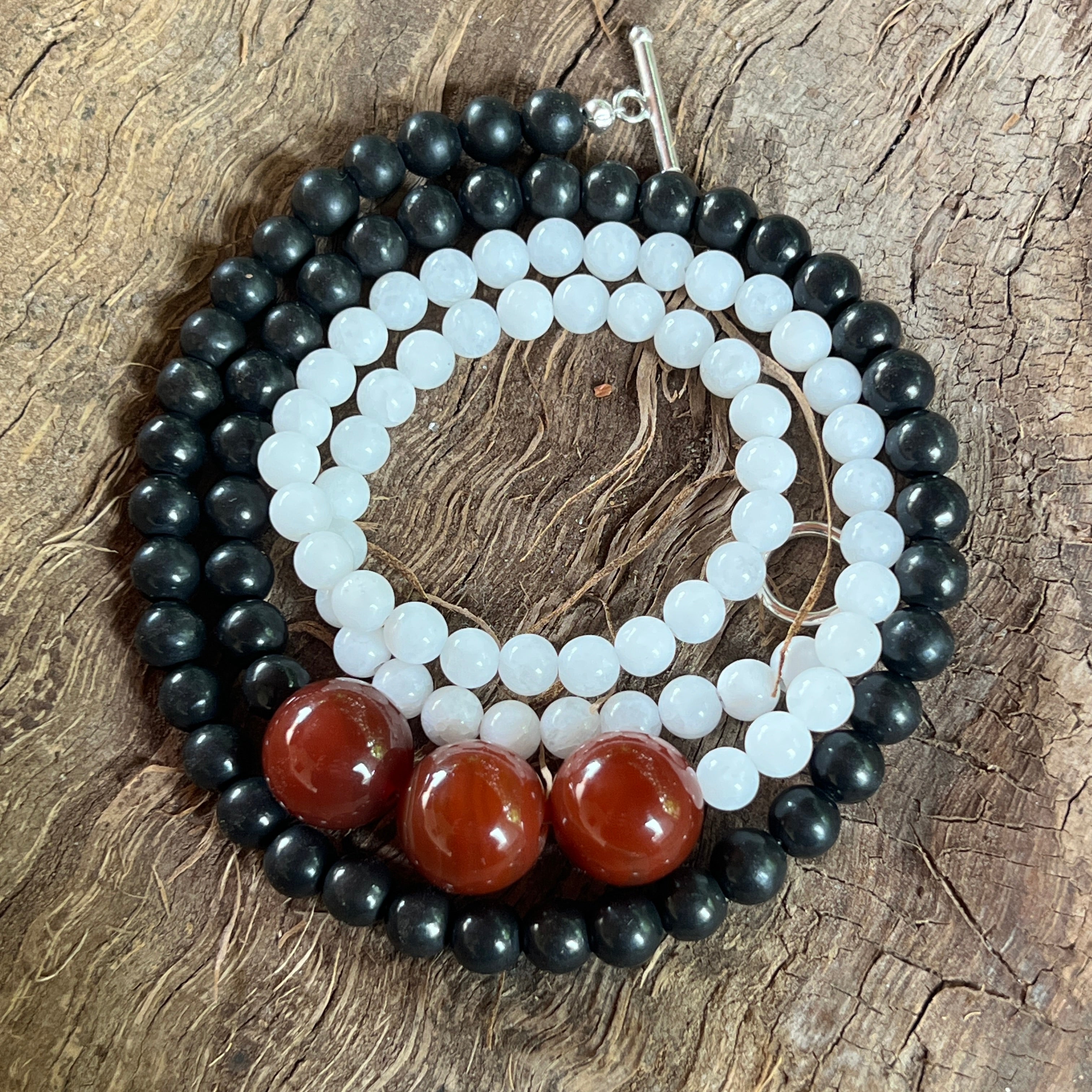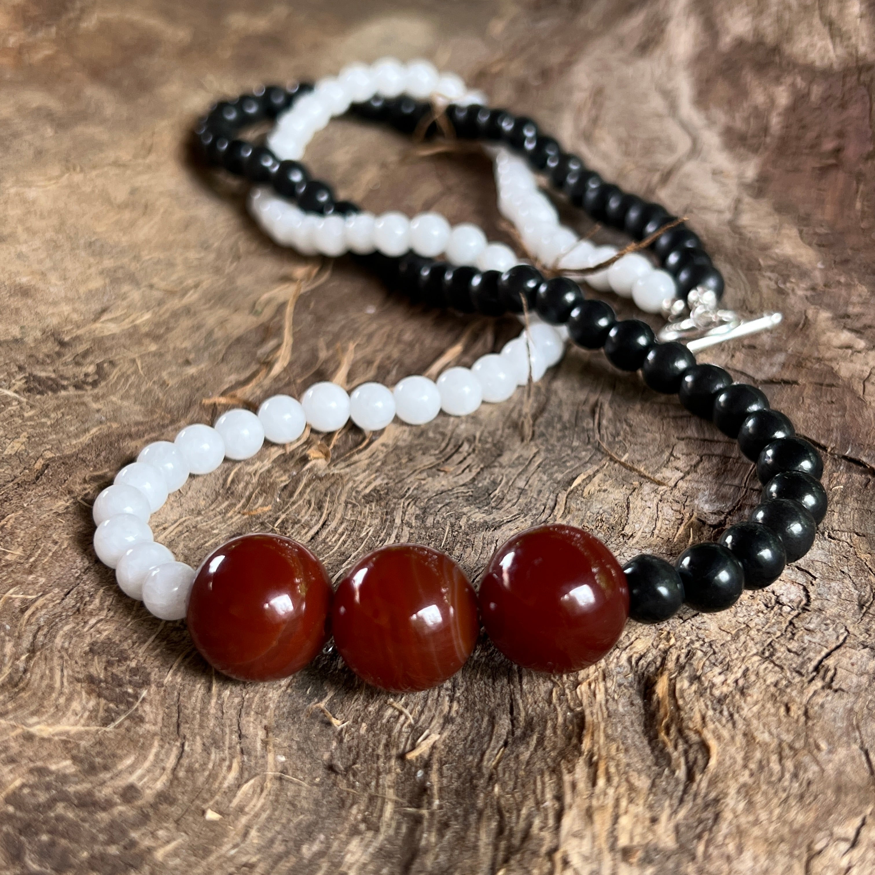 Anyagok: természetes shungit, fehér jáde, karneol (3 hangsúlyos gömb), 925 ezüst toggle zár