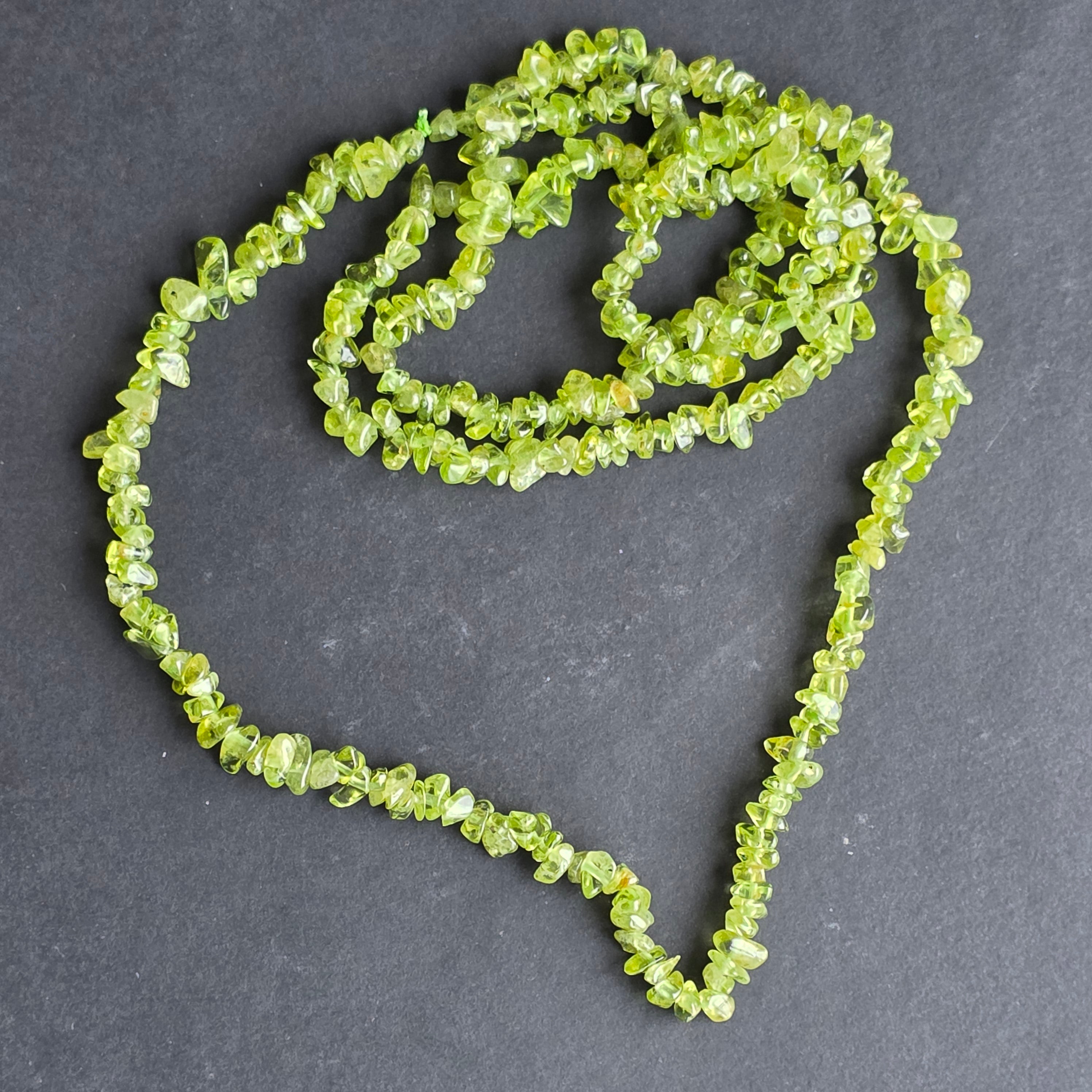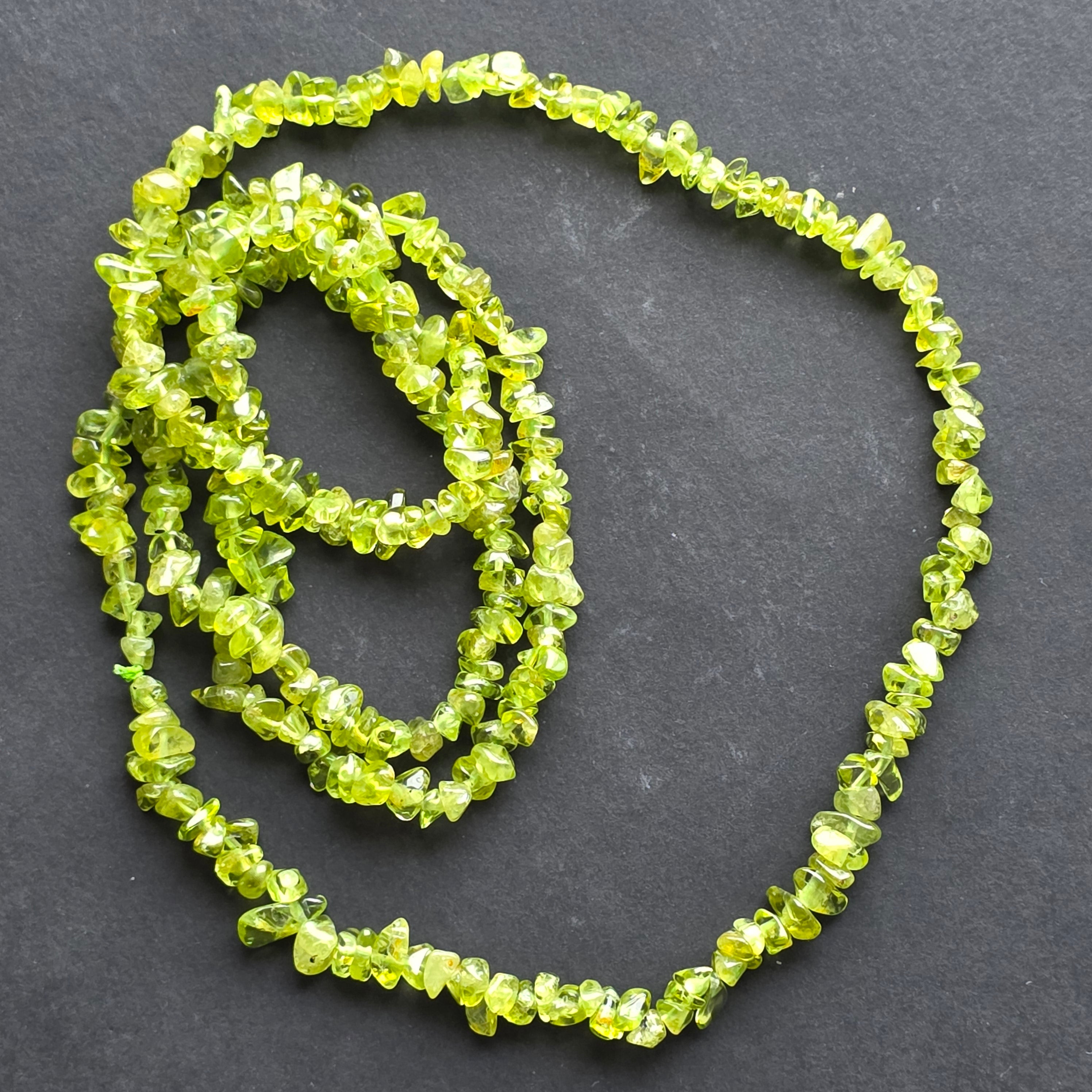 Egy nyaklánc, amely mintha magában tartja a hajnal zöld sugarait. A természetes chips a peridot, gondosan polírozott és folyamatos zsinórba fűzve 80 cm, finom, áttetsző, hajnali harmatra emlékeztető csillogást hoz létre a friss leveleken. A frissesség és a megújulás gyöngyszeme, meghívó, hogy harmóniában élj saját életed ritmusaival.