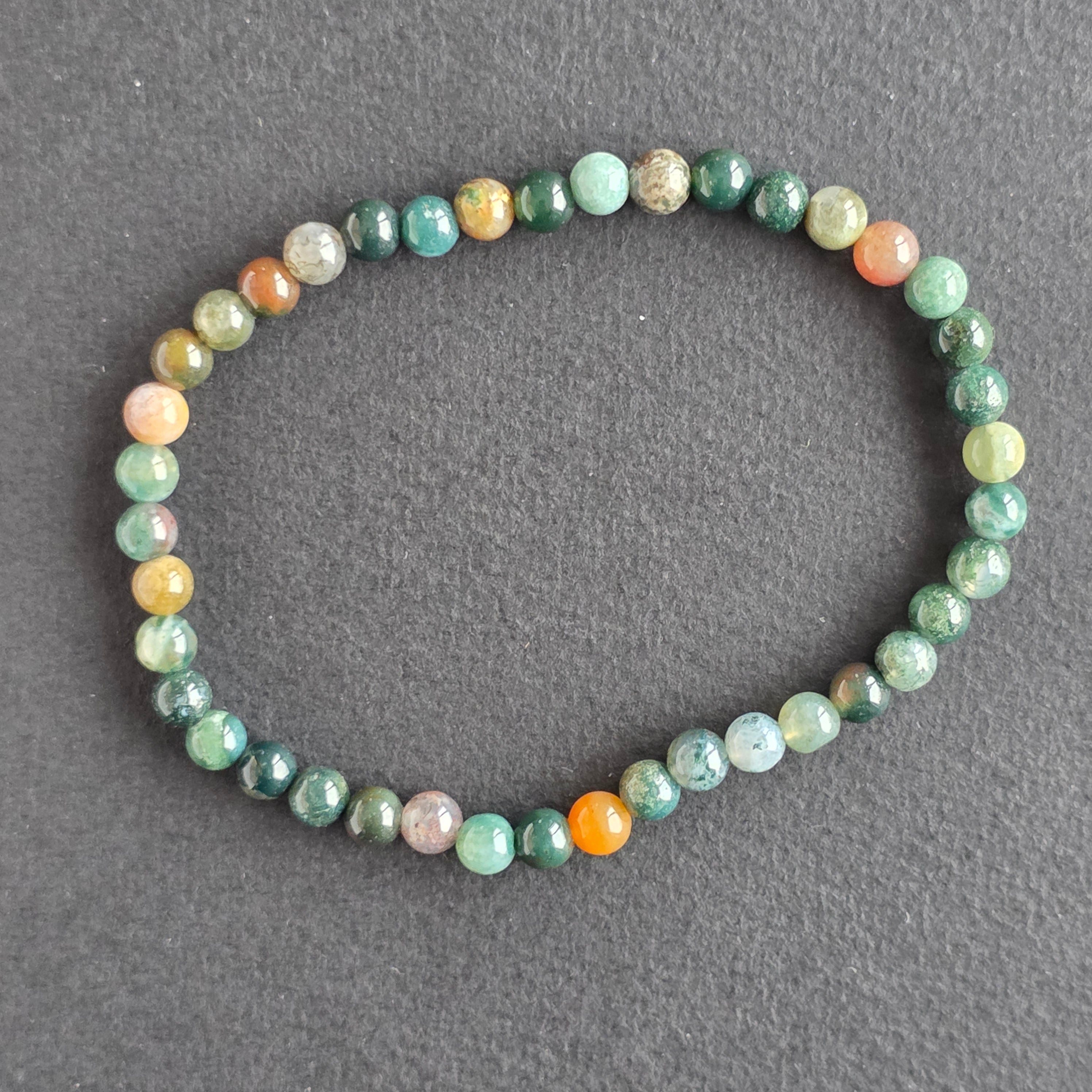 Ez az indiai achát karkötő, mely 6 mm-es gömb gyöngyökből készült, a finom színváltozatosságával tűnik ki. Természetes árnyalatai – zöld, piros, barna és szürke – harmonikus mozaikká fonódnak, minden karkötő egyedi darab.