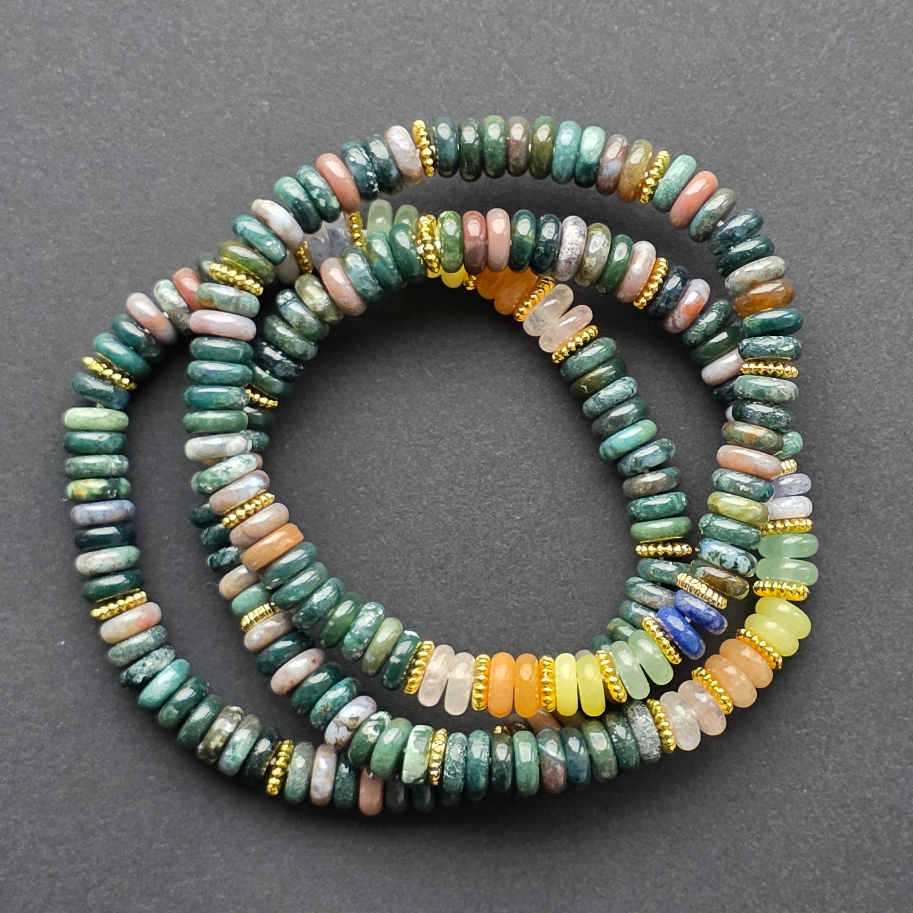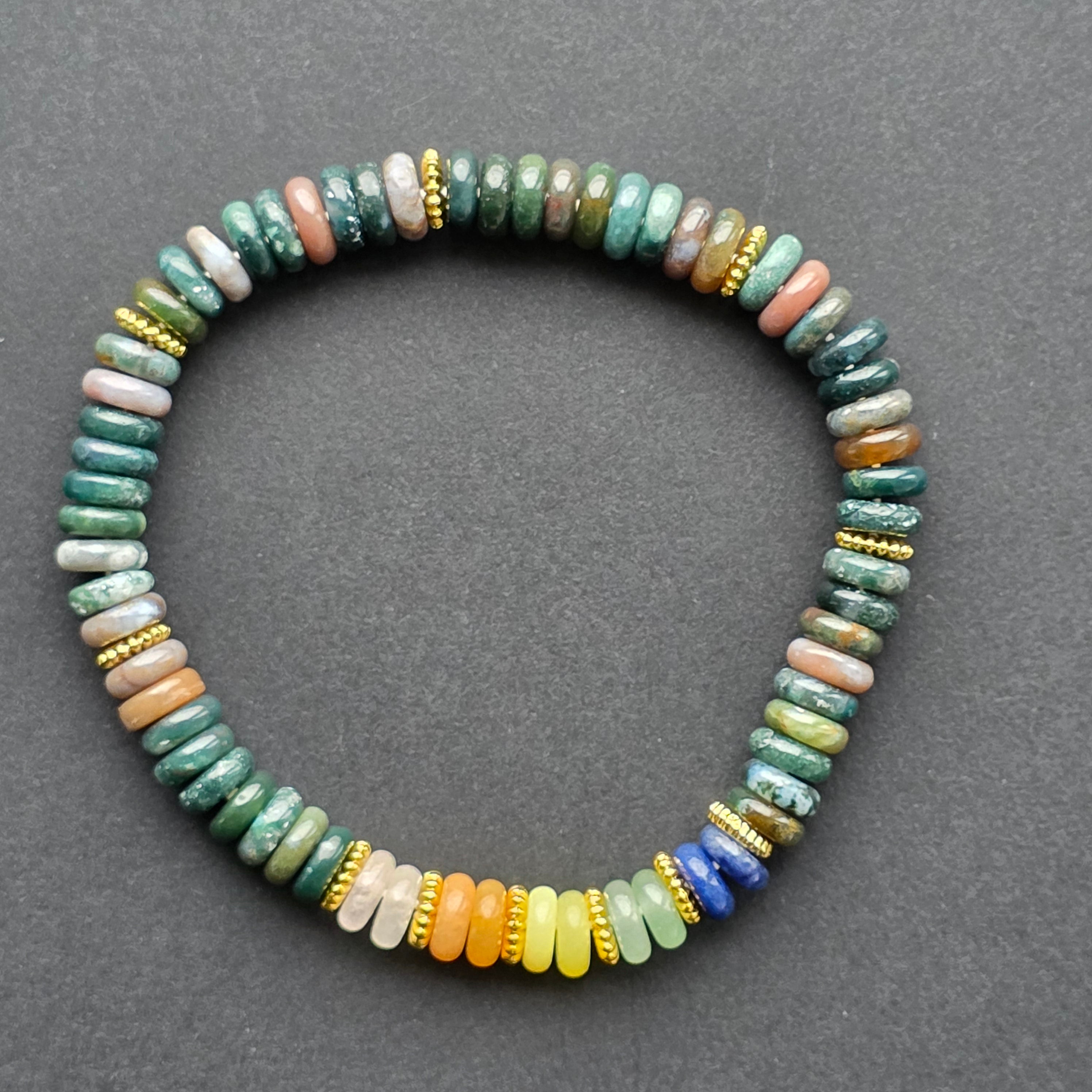 Az indiai achát a kromatikus sokféleségéről ismert – a mélyzöldek, a földes barnák és a finom szürke tónusok szerves összefonódása, amelyek természetes rétegekben vannak elhelyezve, akárcsak egy évmilliók alatt kialakult kő belsejében. Minden korong megőrzi az ásvány egyedi lenyomatát, és ez a finom variálhatóság a karkötőt saját személyiségű darabká alakítja.
