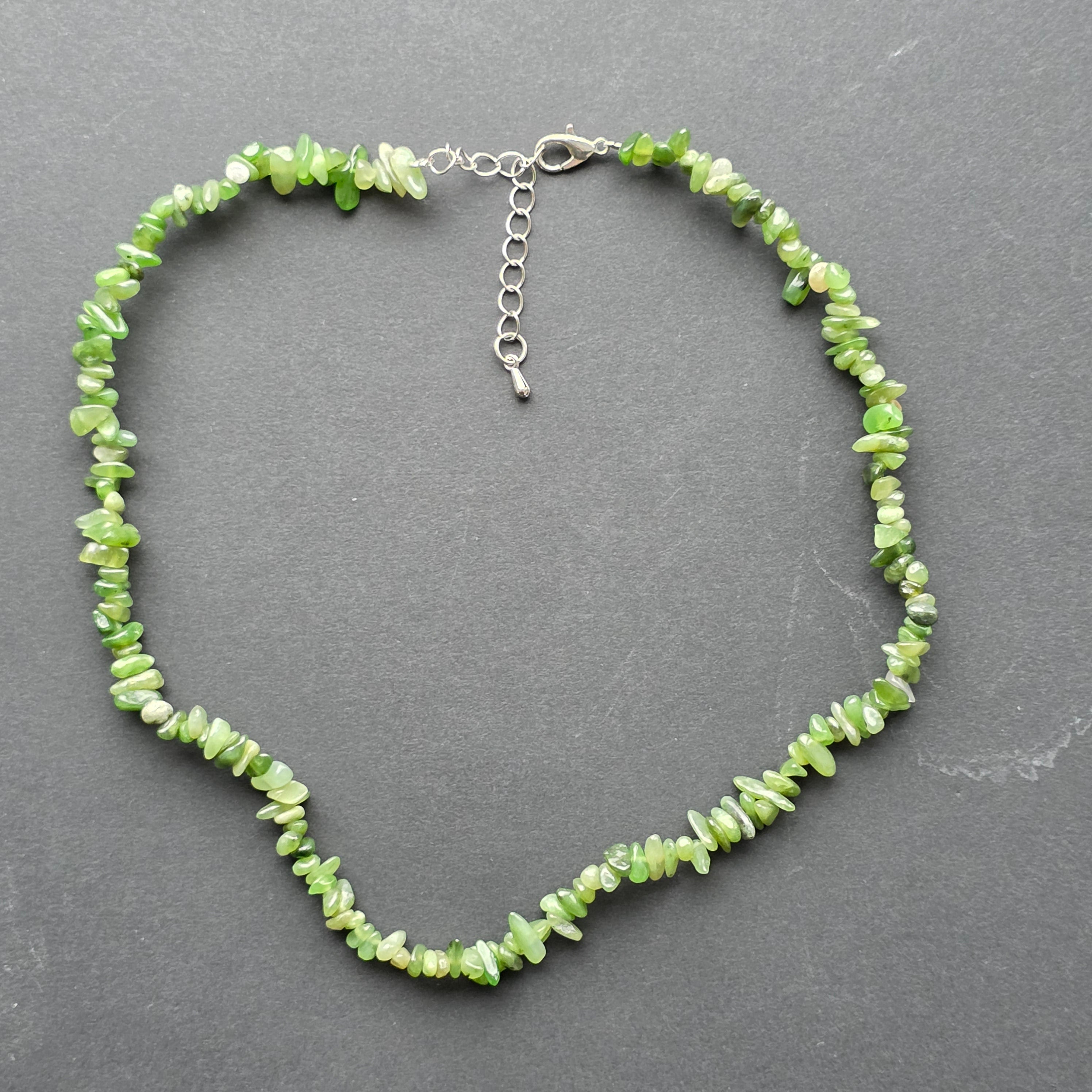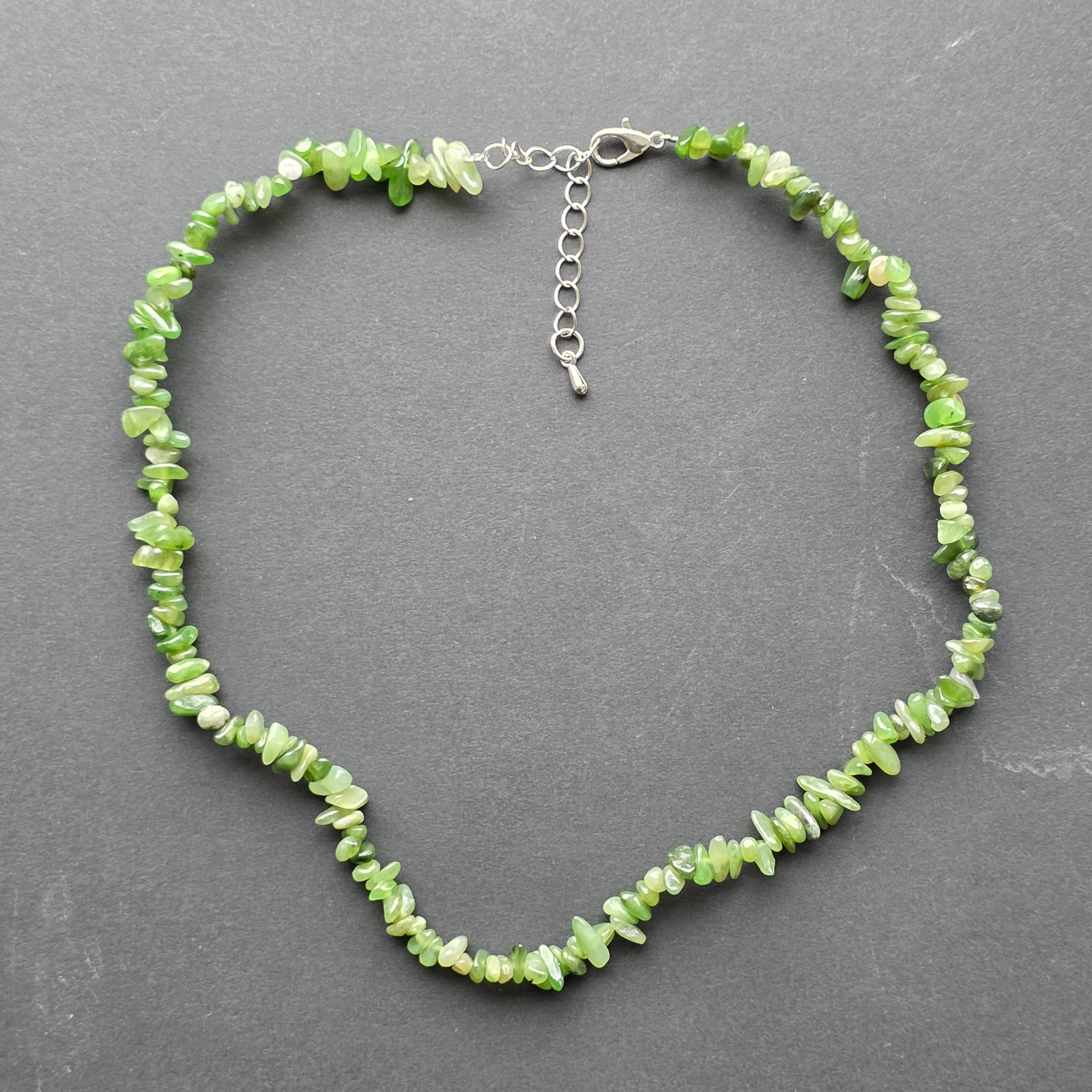Egy természetes, frissességgel teli nyaklánc, jade nefriten készítve — az egyik legelismertebb jade fajta, amely intenzív zöld árnyalatáról és sűrű, organikus textúrájáról ismert. A szabálytalan, gondosan csiszolt chipsek hiteles, természetes vibrációt nyújtanak, megőrizve a kő nyers szépségét.
