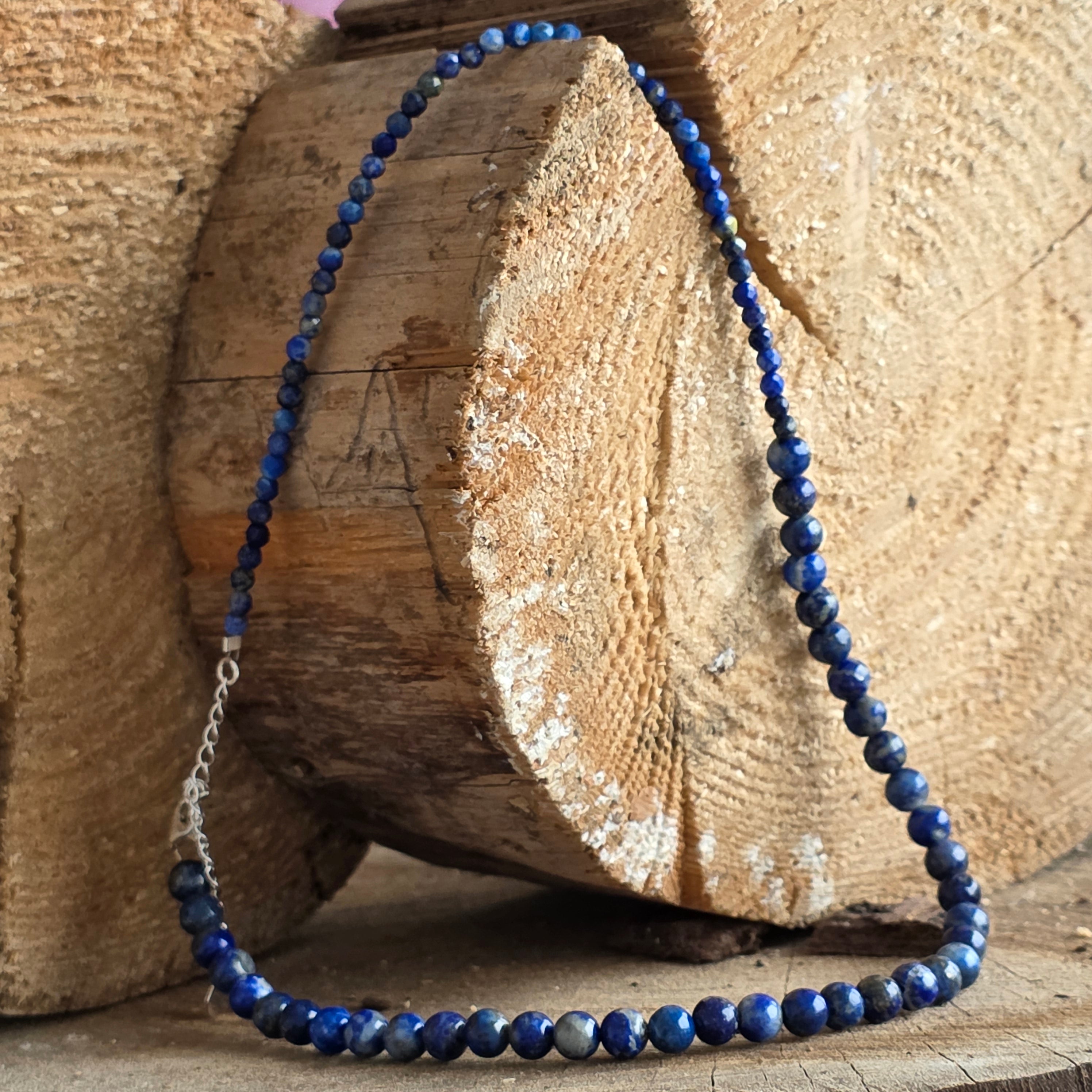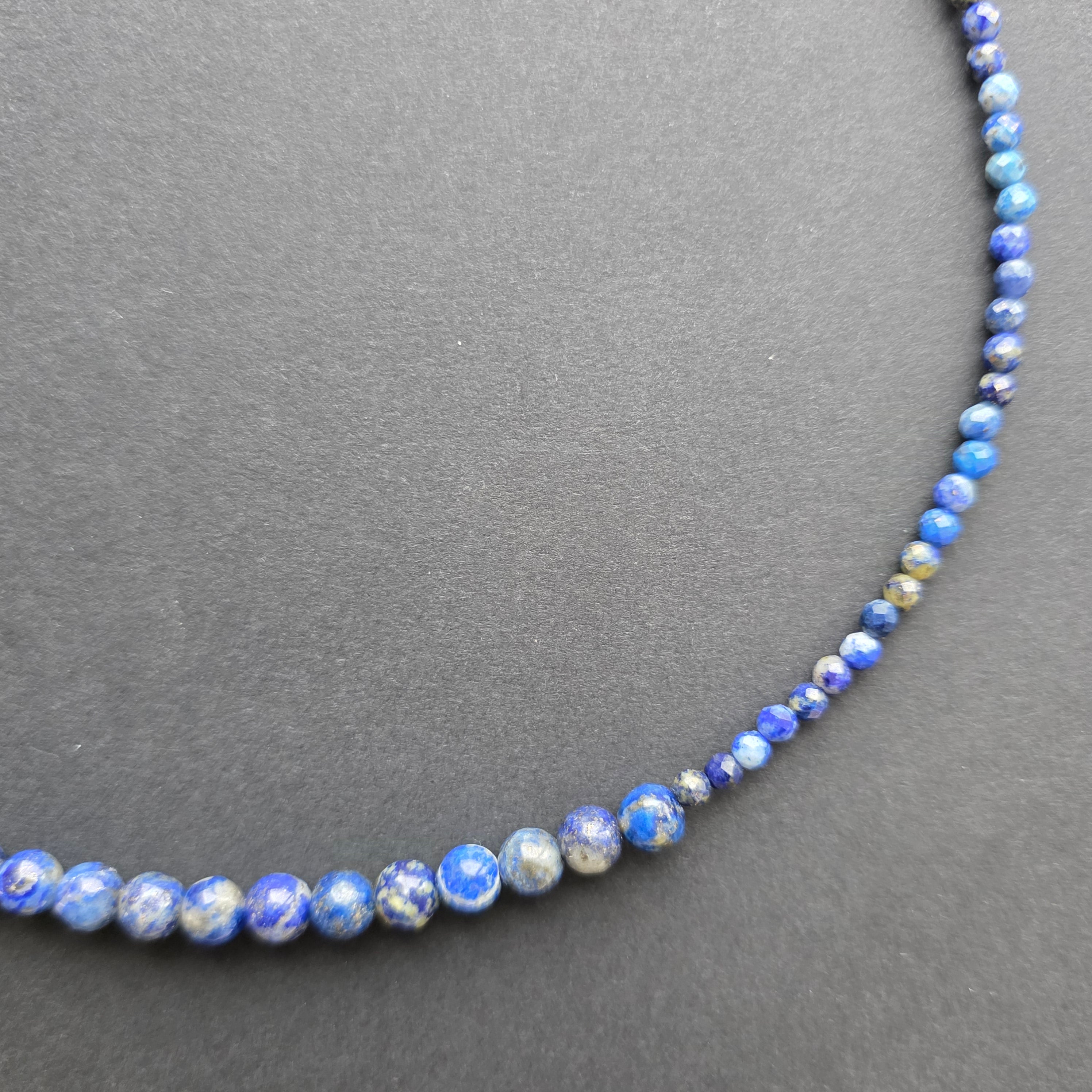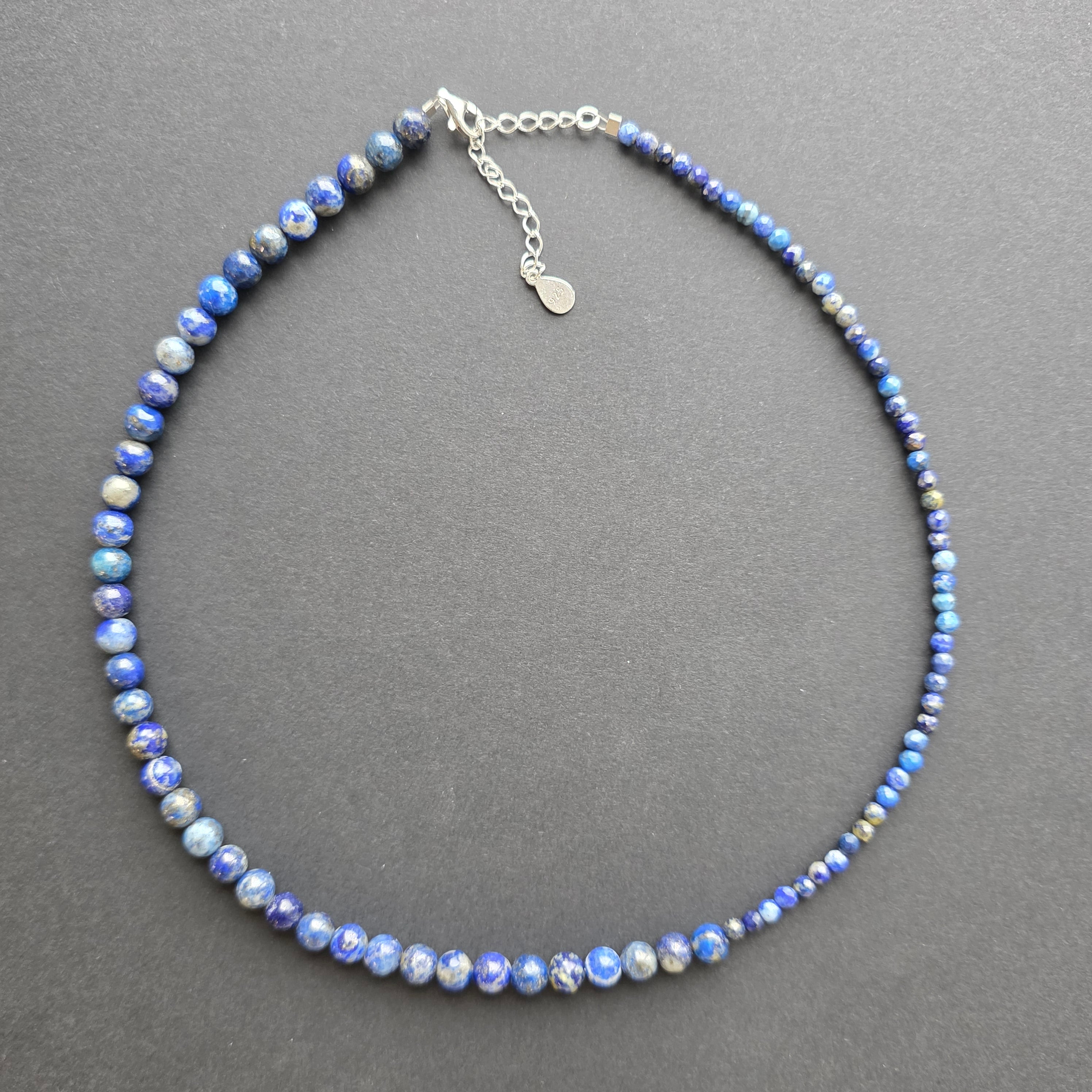 A 6 mm-es, 3 mm-es fazettált gömbökkel átfont gyöngyök finomságot és ritmust kölcsönöznek az ékszernek, finom harmóniát teremtve az erő és a kifinomultság között. A lapiszt ősidők óta viselték a szimbólumaként igazság, spirituális látás és belső erő, önismerethez vezető kapuként és a zavaró energiákkal szembeni védelemként tekintik rá.