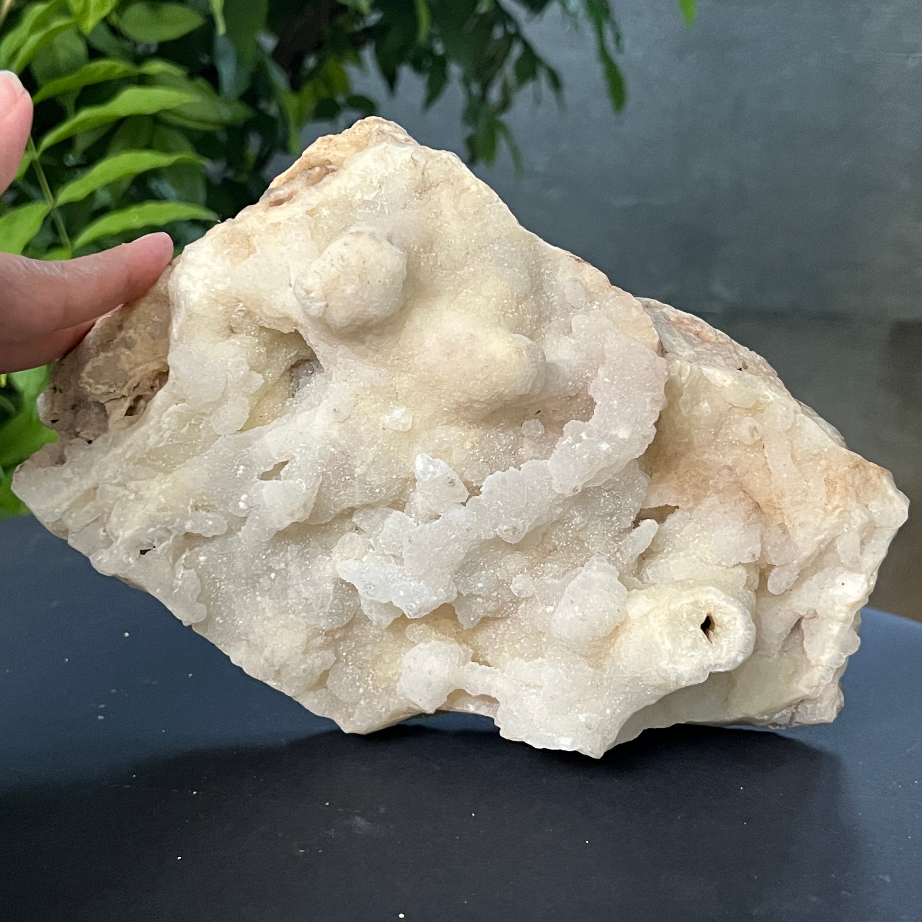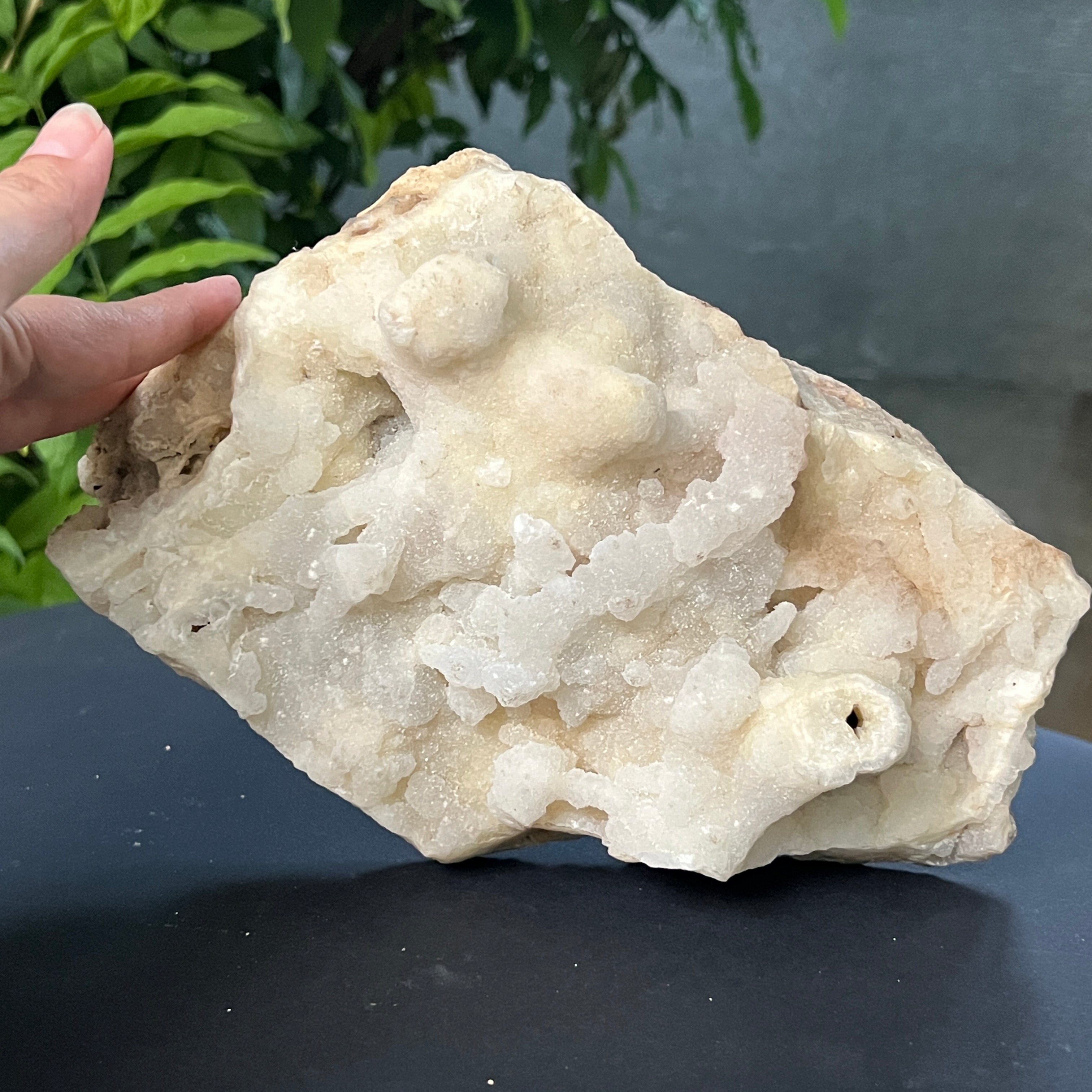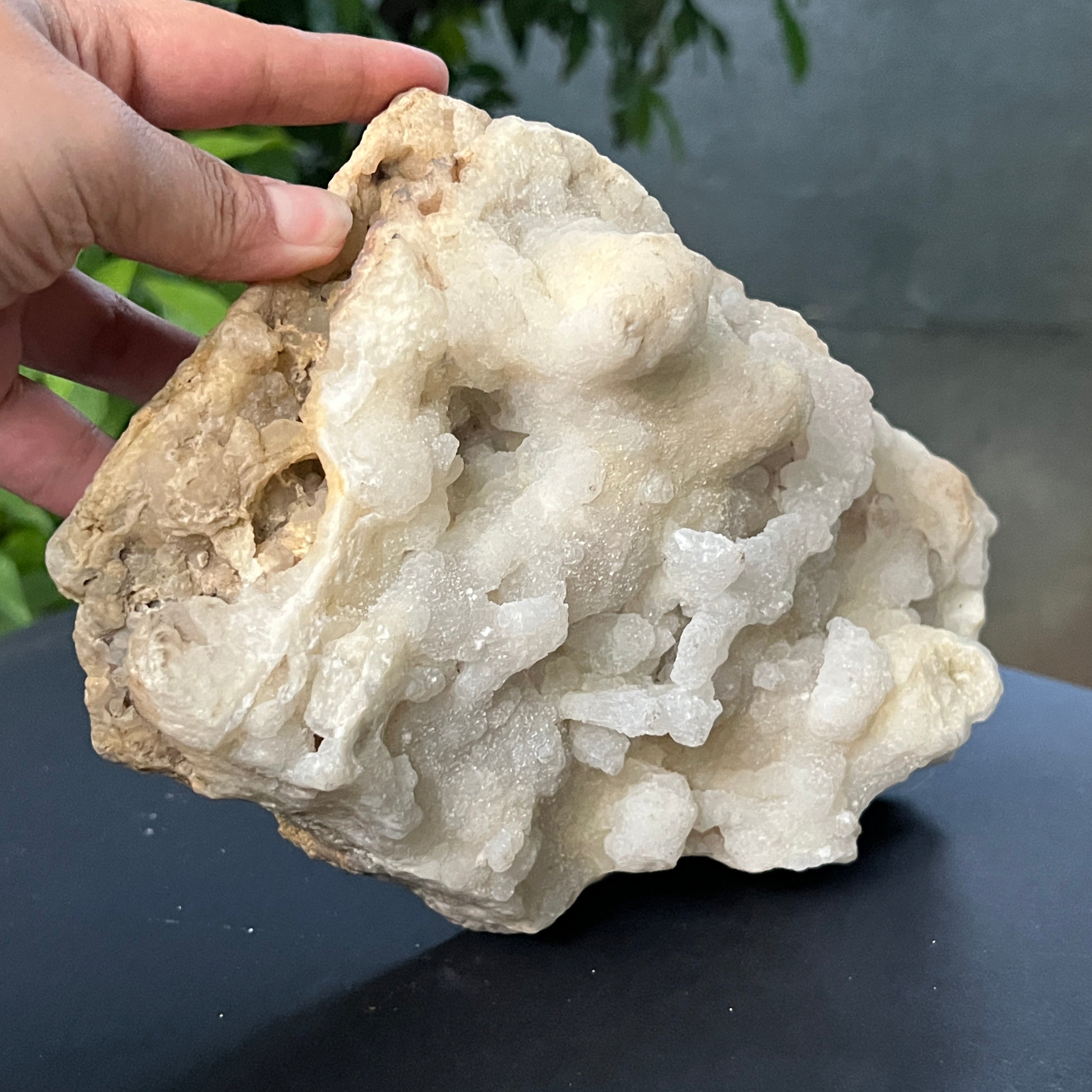 A krémes-fehér színt, amely diszkrét bézs árnyalatokkal rendelkezik, fokozza a mikrokristályok finom fényét a felszínen, amelyek gyengéden és elegánsan visszaverik a fényt. A finom részletek, a koraliform megjelenés és a harmonikus forma ezt a darabot figyelemre méltó vizuális jelenlétté teszik.