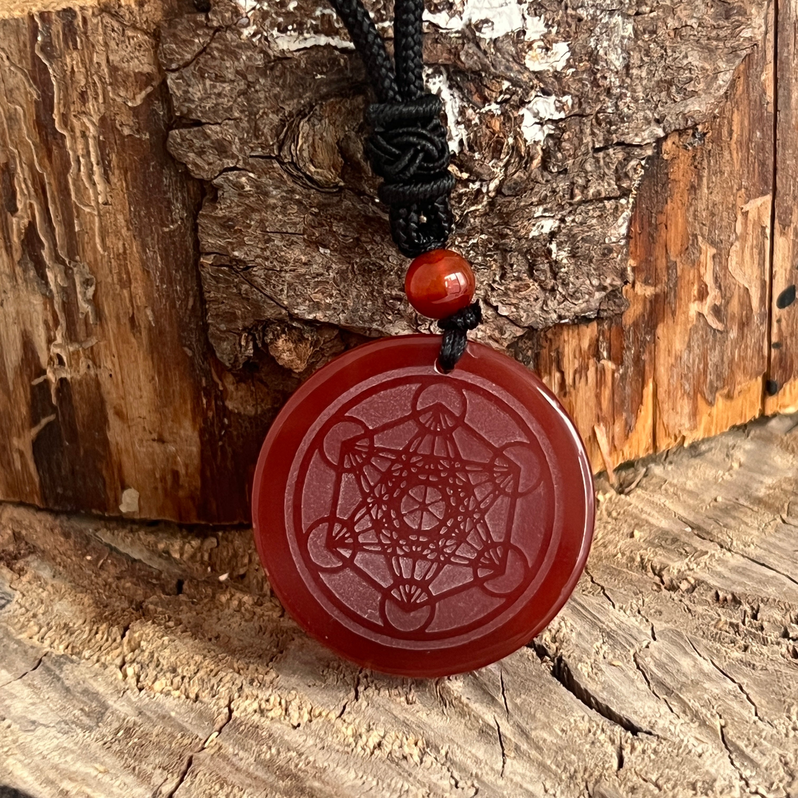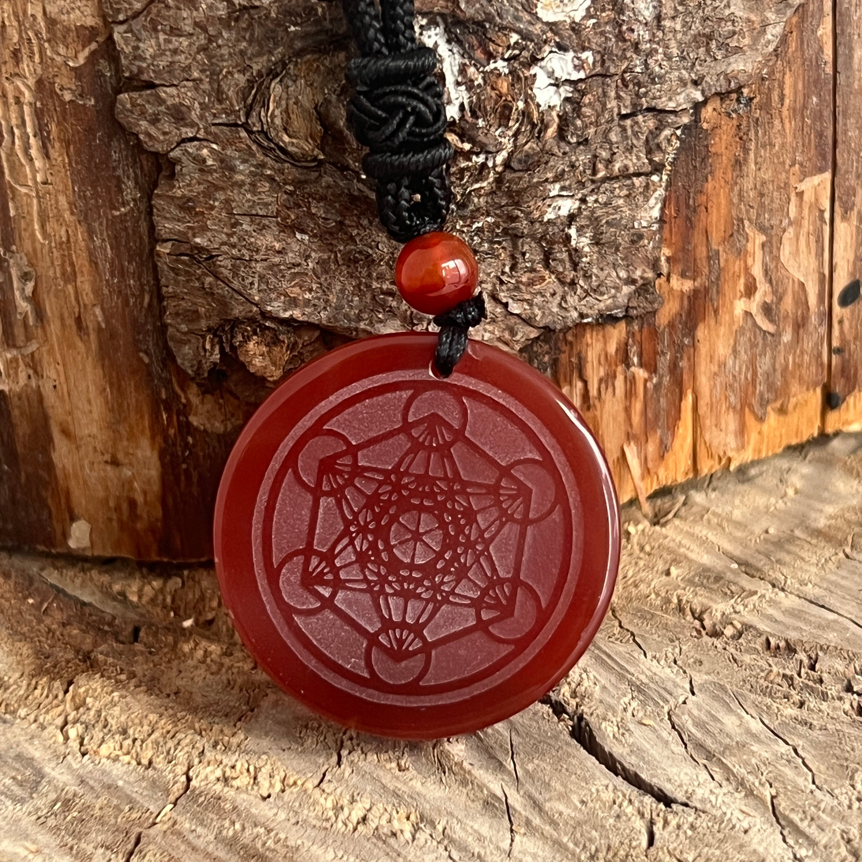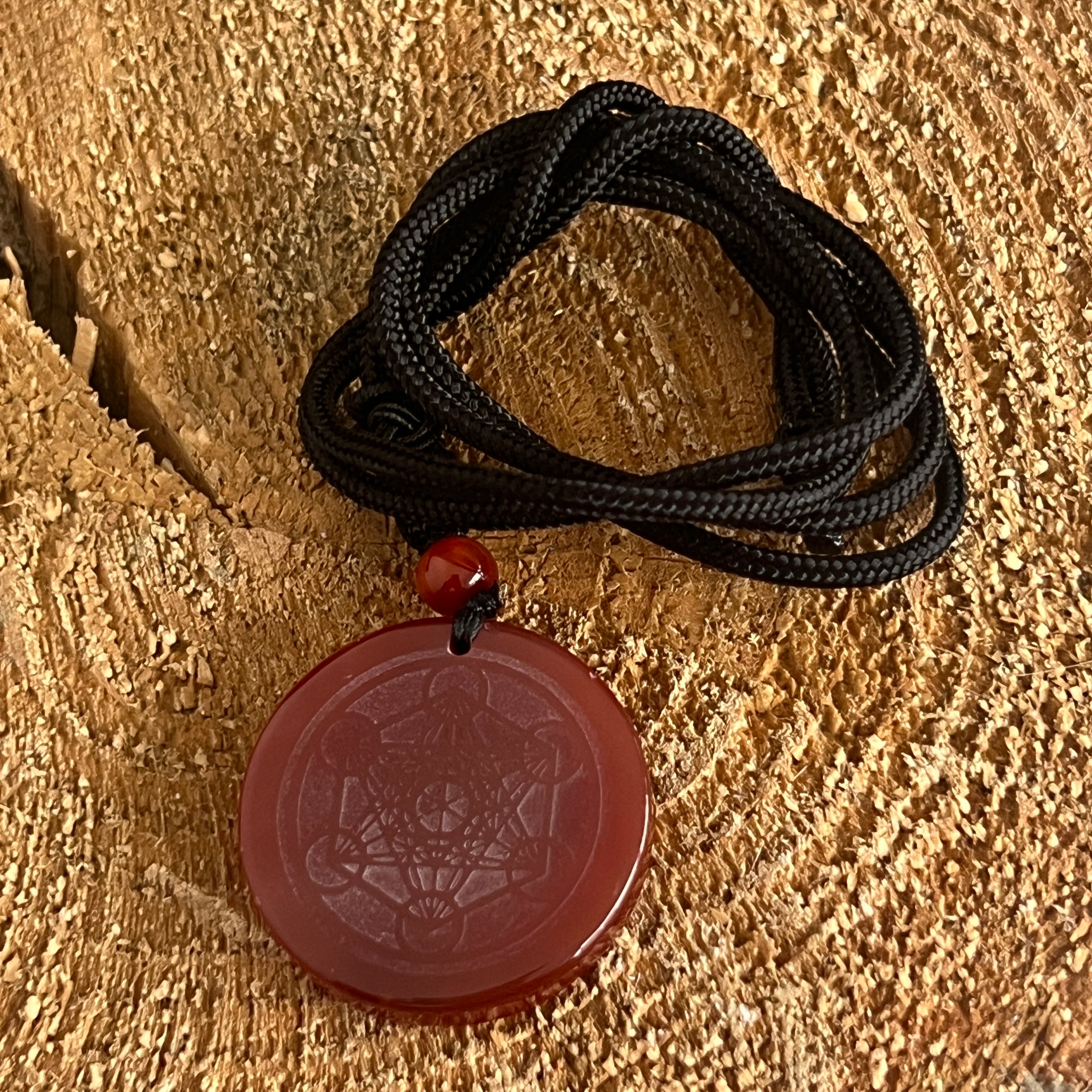 A medál től Természetes karneol, gravírozott Metatron szimbóluma, egy spirituális gyöngyszem, amely egyesíti a belső tűz energiáját az Univerzum szakrális geometriájával. Metatron szimbóluma – az egymásba fonódó körök összetett alakja – a kozmikus rendet, harmóniát és isteni védelmet képviseli.