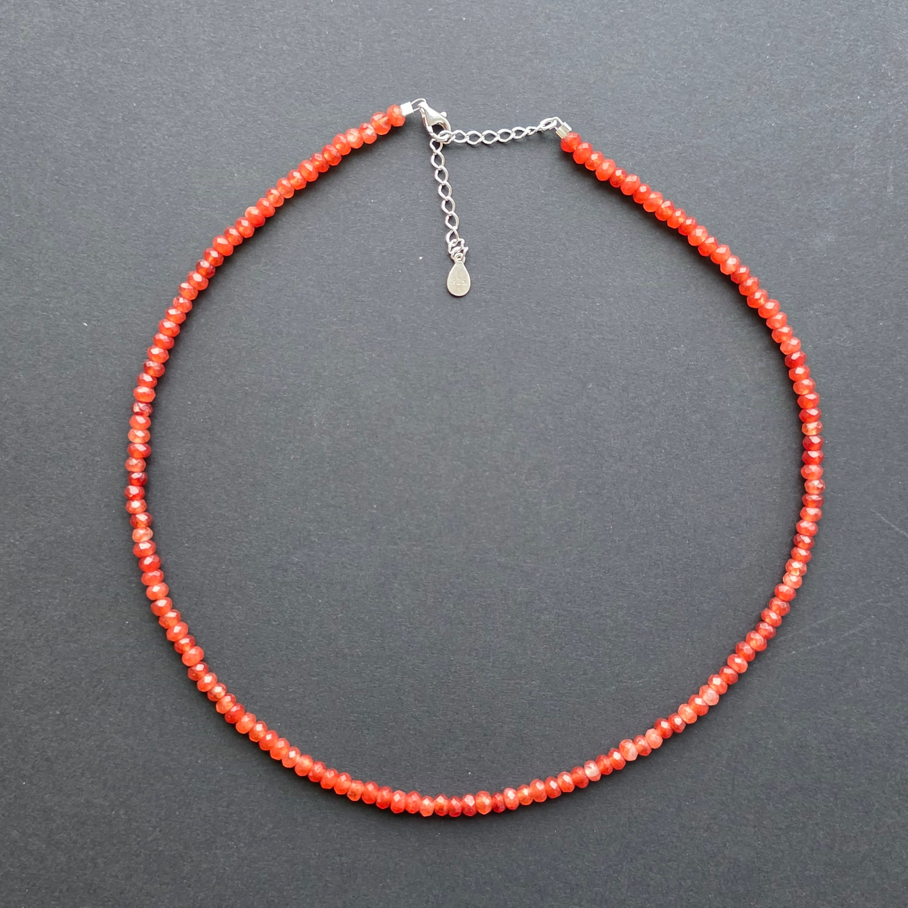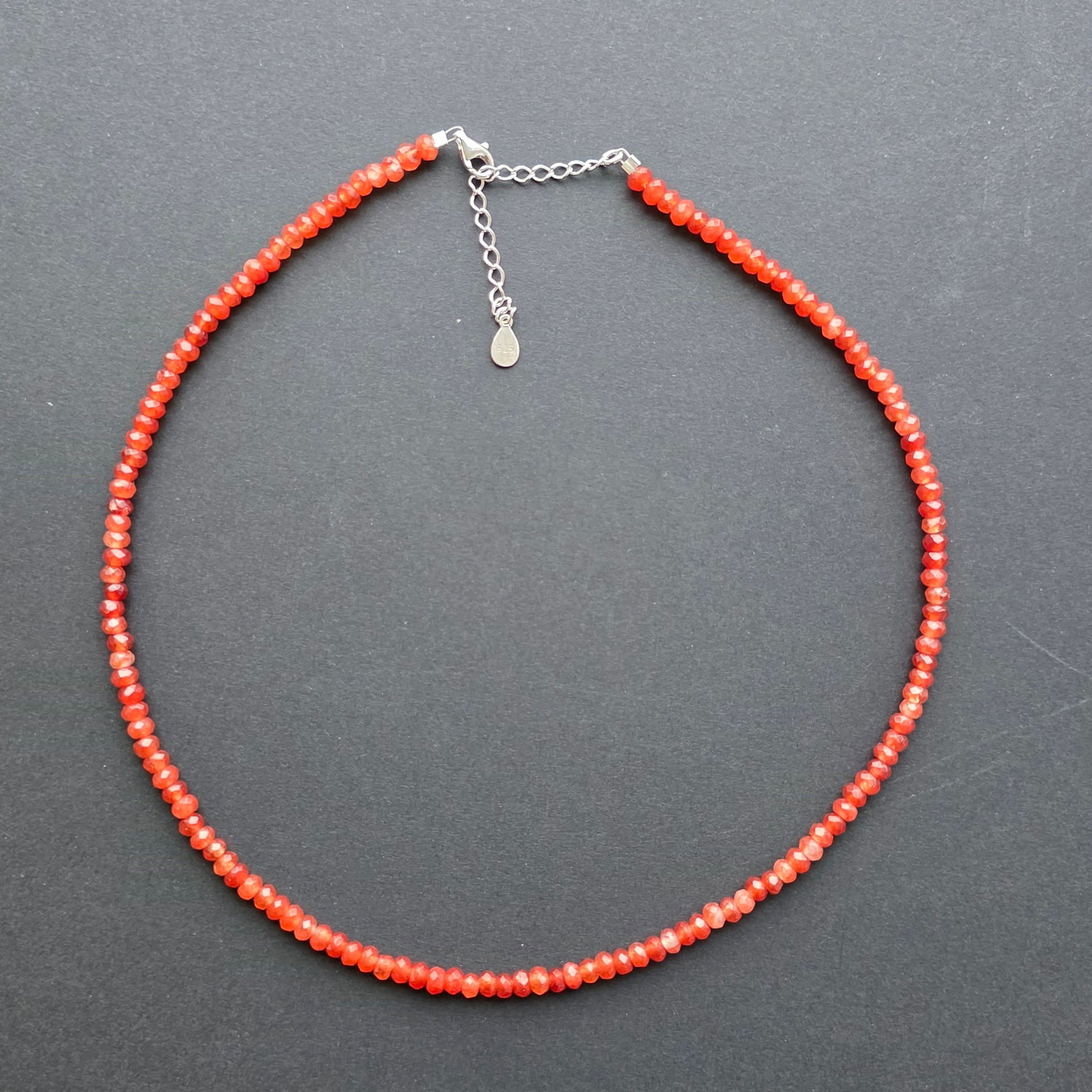 Vitalitást, szenvedélyt és melegséget sugárzó nyaklánc. Csiszolt természetes karneol4,5 × 2 mm-es finom korongokra vágva a naplementék fényét és a belső tűz energiáját hordozza. Árnyékjátéka – a halvány narancstól a borostyánvörösig – élénk és optimista hangulatot varázsol, a bátorsággal és örömmel megélt élet szimbólumát.