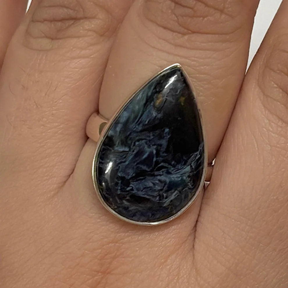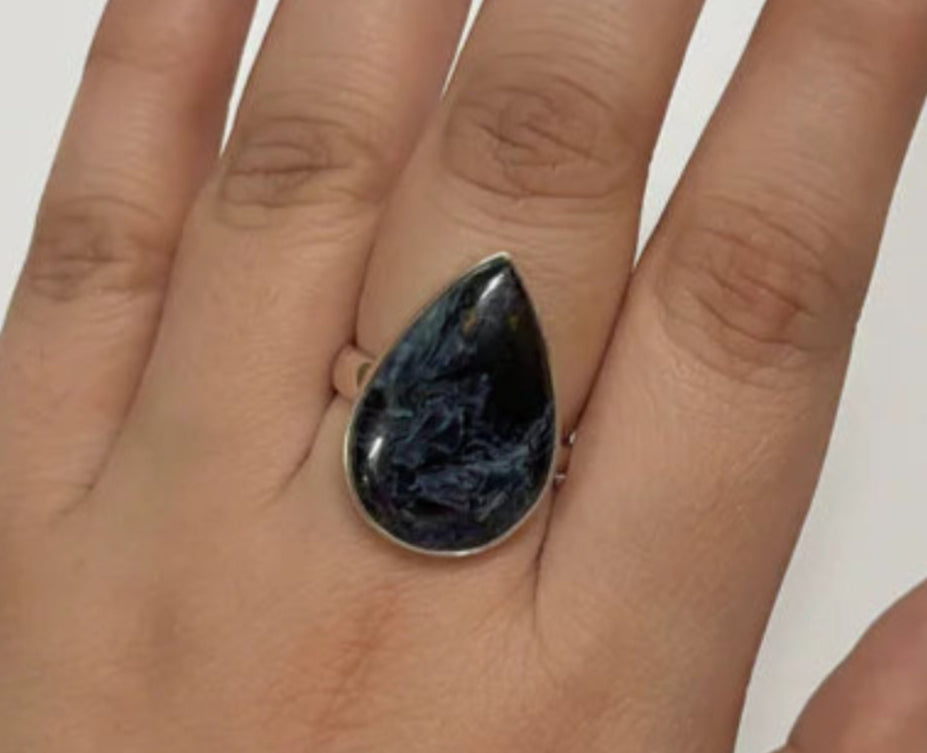Ez a lenyűgöző gyűrű, készült 925 ezüst, cabochon díszíti természetes macskakő csepp alakú. A kő textúrája a kék, fekete és arany mély árnyalatait tárja fel, amelyek az éjszakai égbolton látott vihar örvénylésére emlékeztetnek.