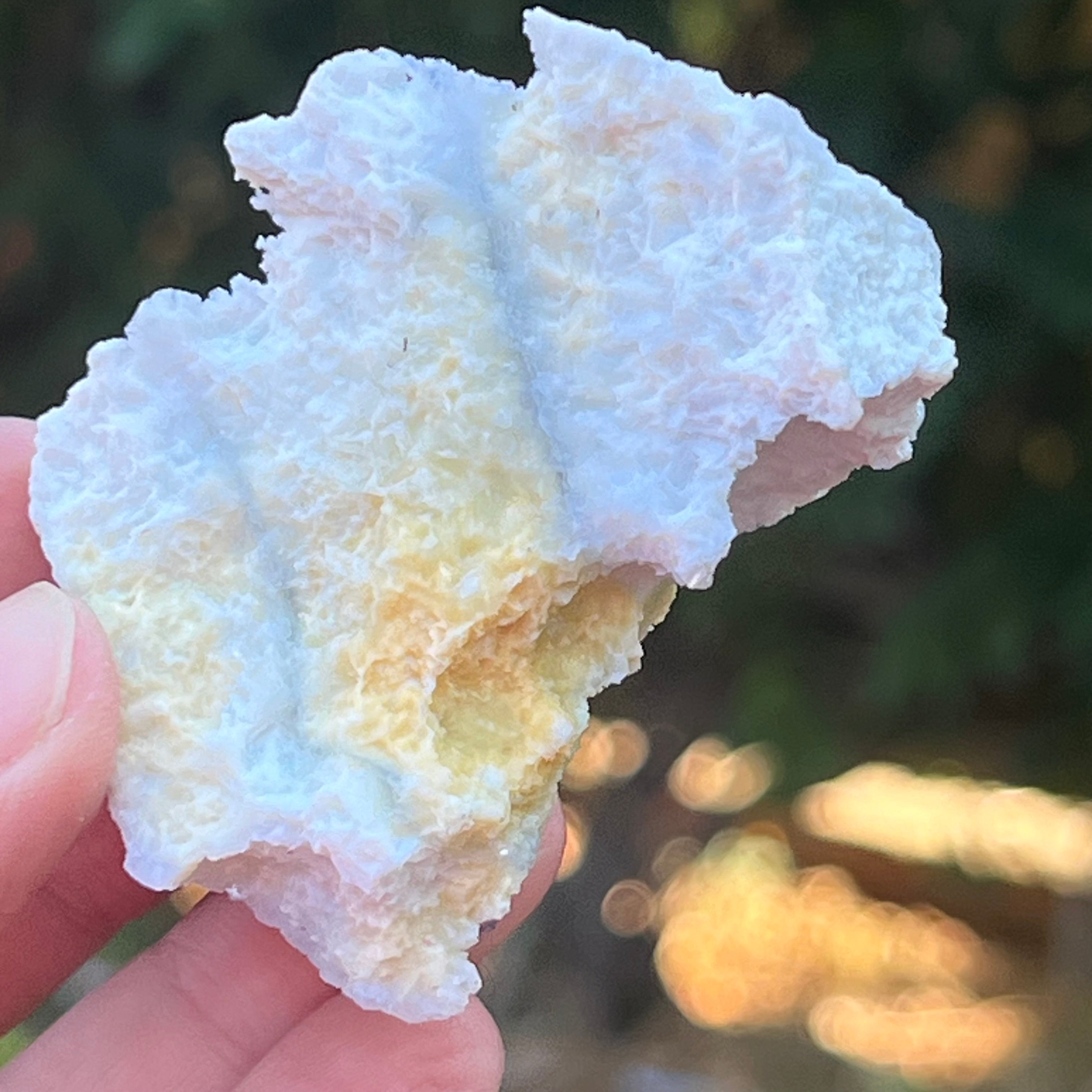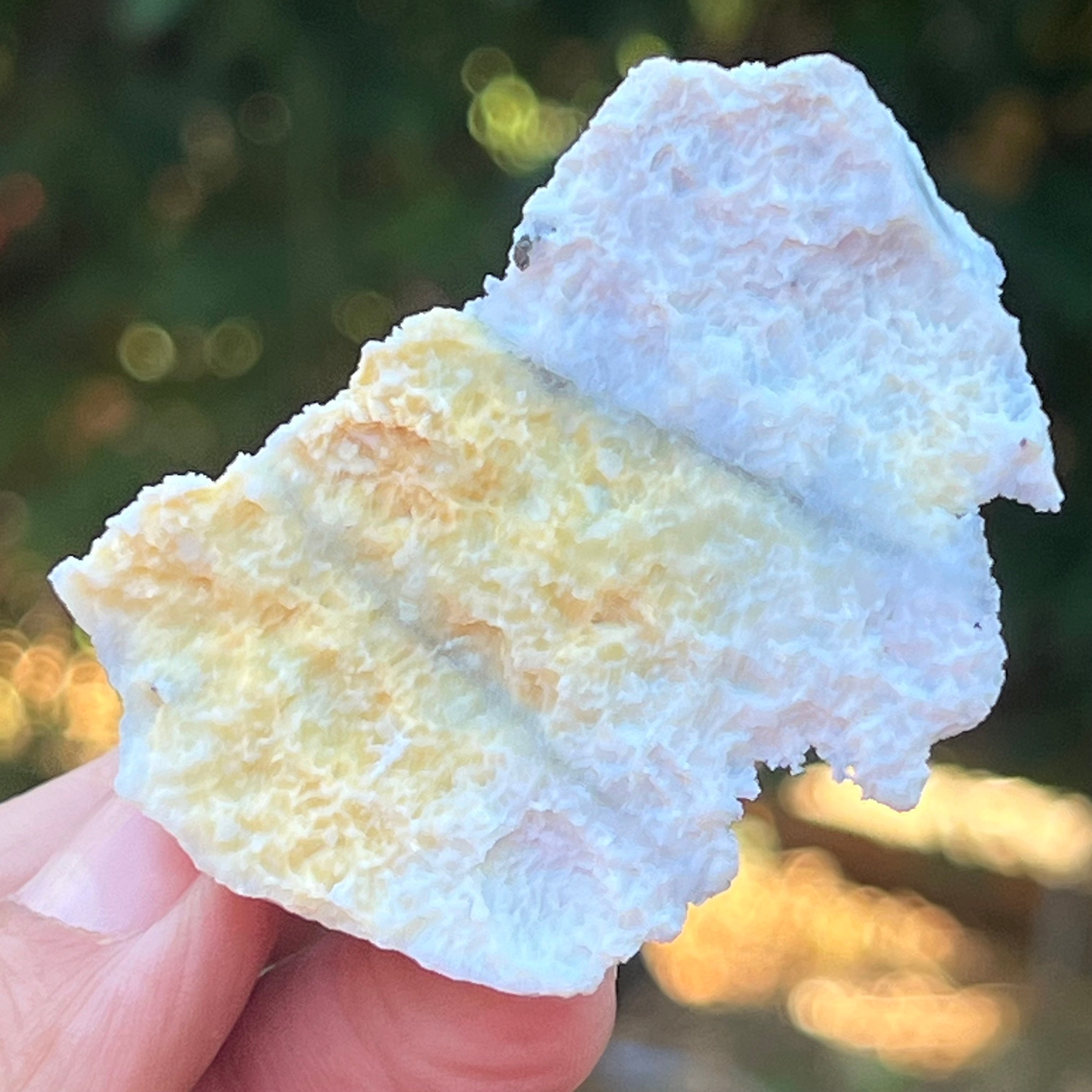 Kék csipkés Achát és Kék Kalcedon példánya, eredet: Nsanje, Malawi. Ezeket a különleges képződményeket Dél-Afrikában bonyolult savas fürdő folyamaton vezetik át, amely gondosan eltávolítja a mátrix nagy részét vagy teljes egészét, hátrahagyva a tiszta Kék Csipkés Achátot és/vagy a Kék Kalcedont, amelyek rendkívüli szépségűek.