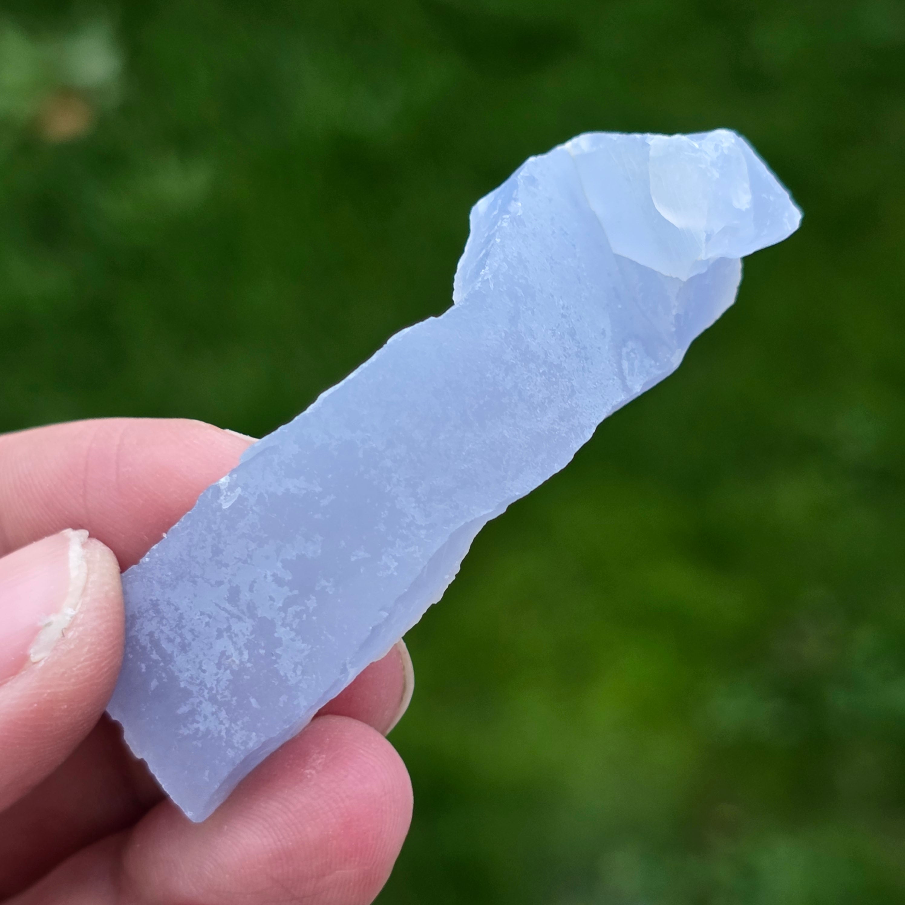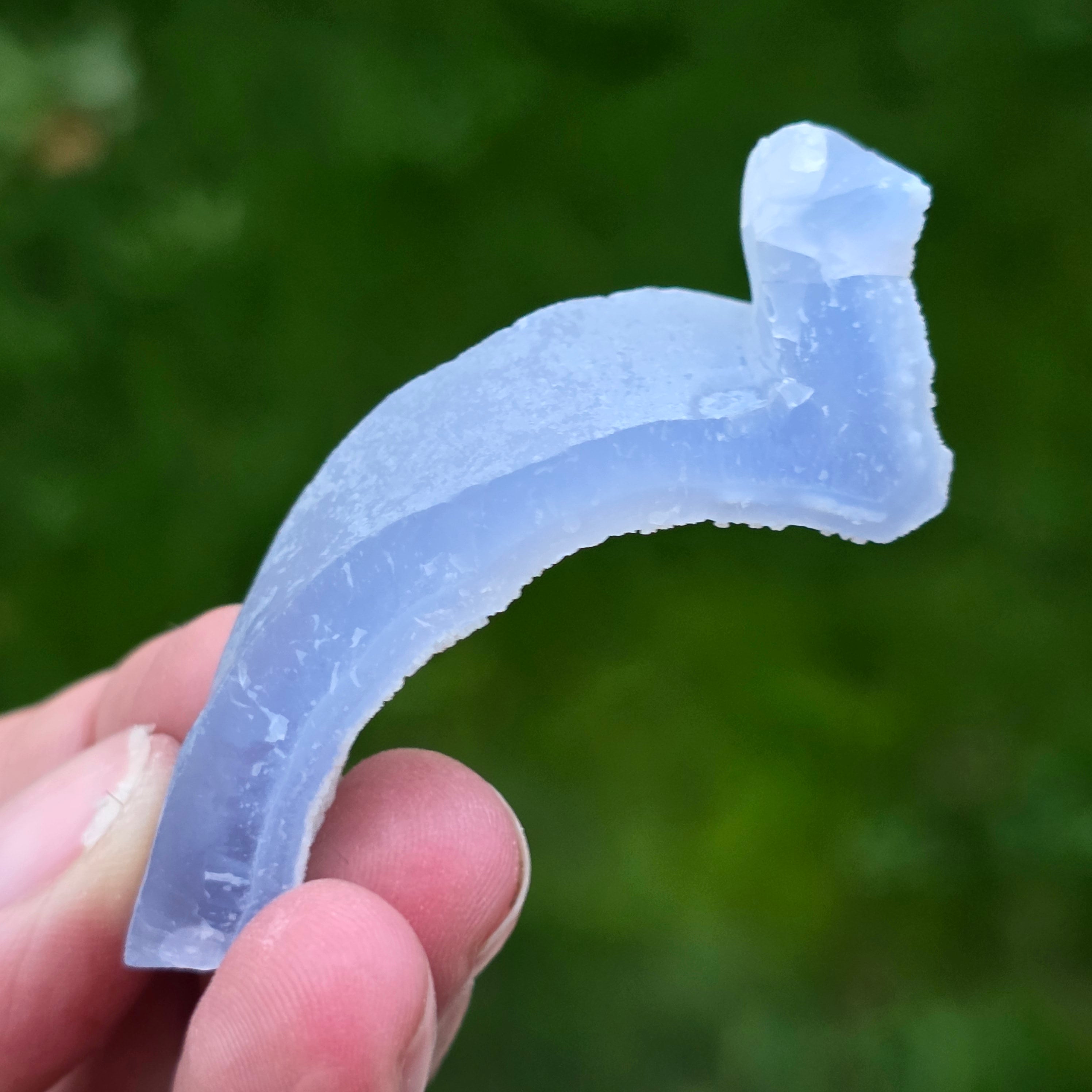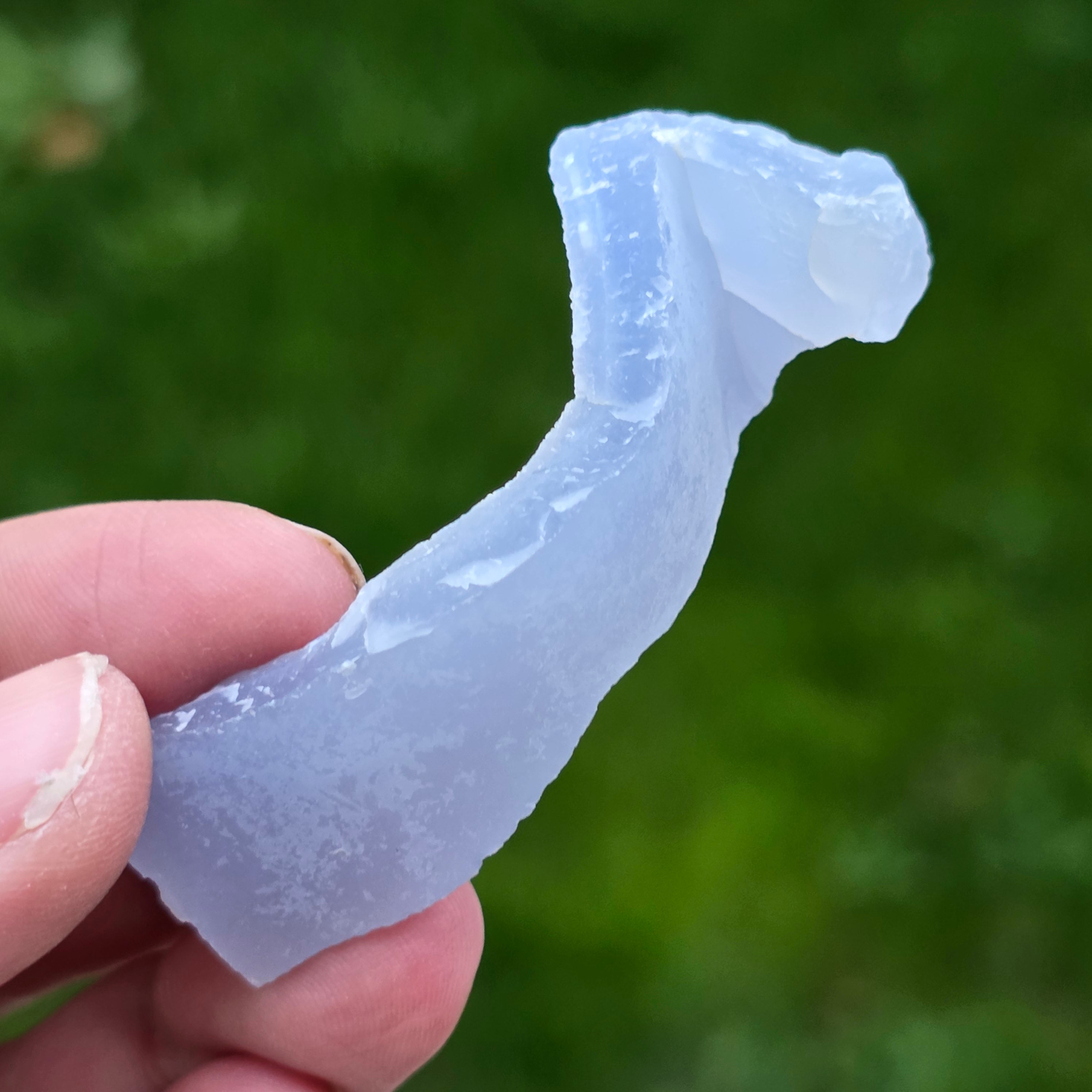 Kék Csipkés Achát és Kék Kalcedon példány, származása Nsanje, Malawi. Ezek a különleges képződmények összetett savas fürdőn mennek keresztül Dél-Afrikában, mely gondosan eltávolítja a legtöbb vagy az összes mátrix nyomát, hátrahagyva a tiszta Kék Csipkés Achátot és/vagy a lenyűgöző szépségű Kék Kalcedont.
