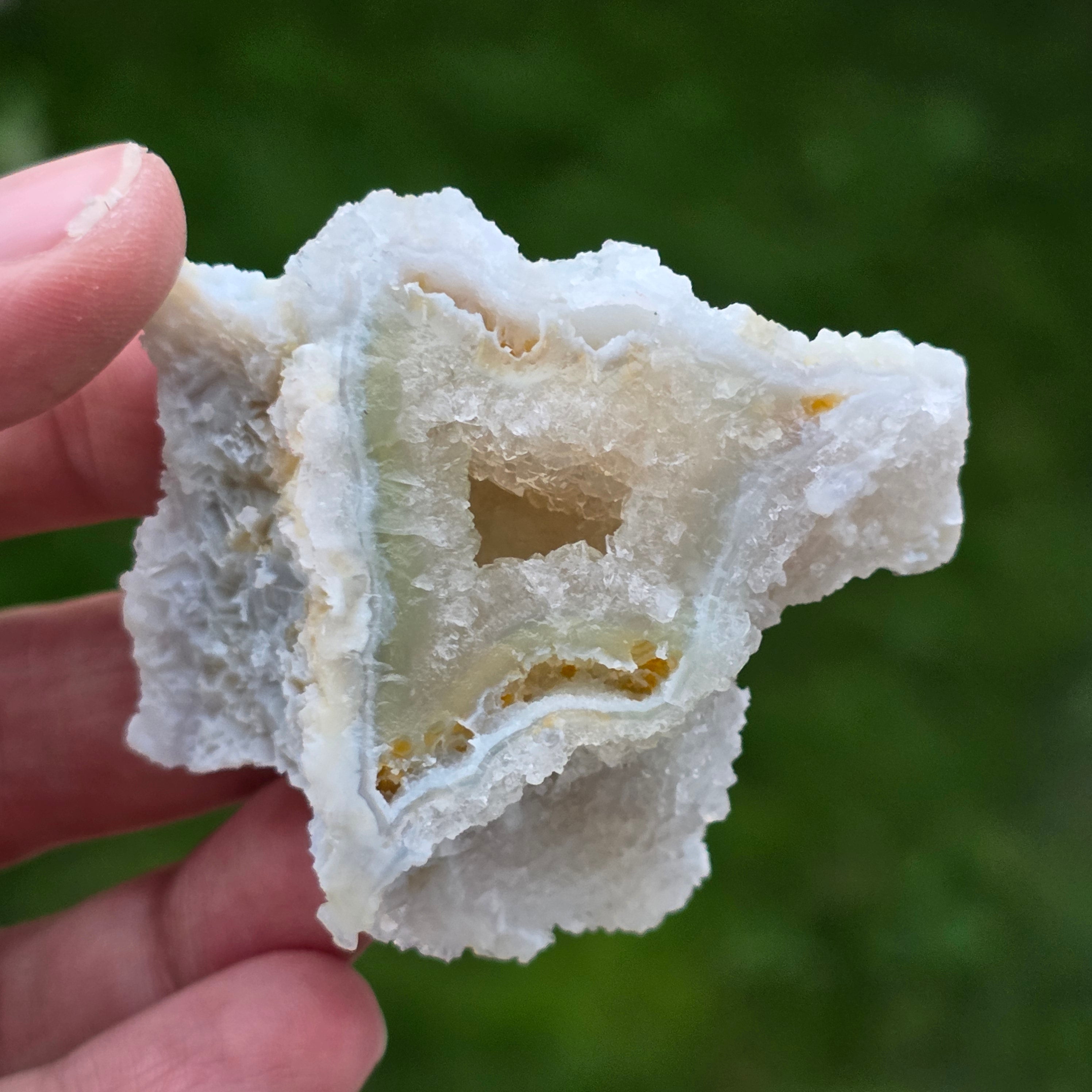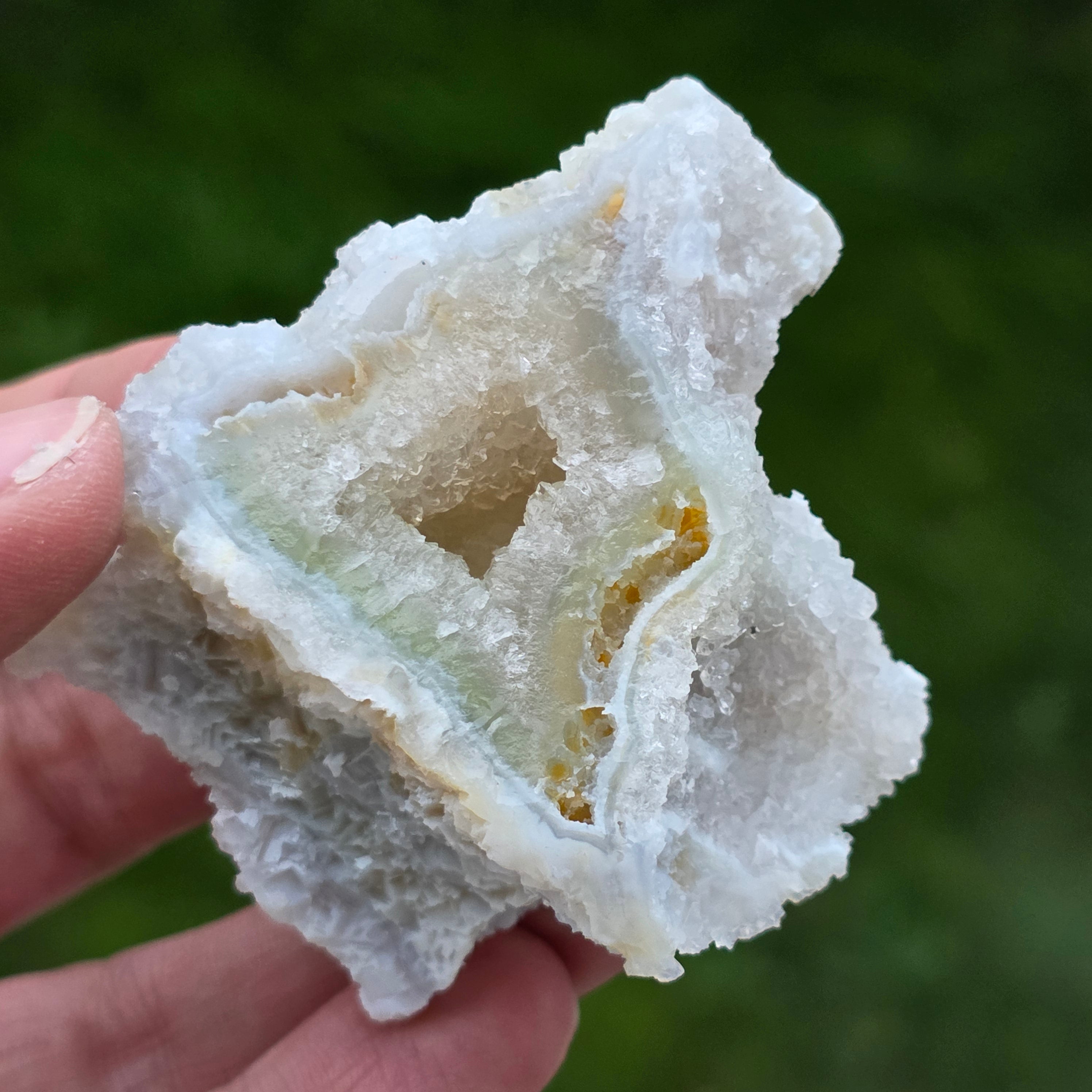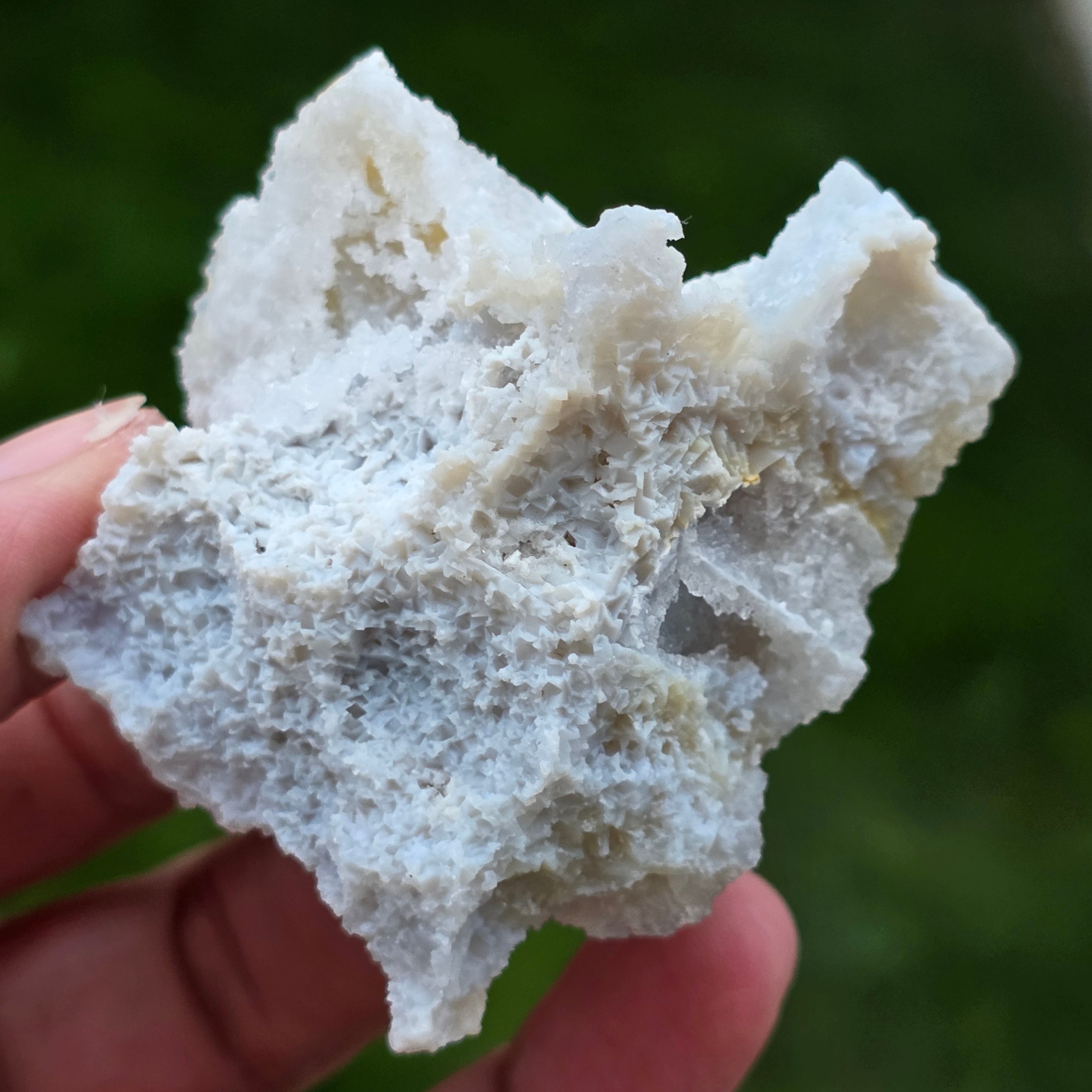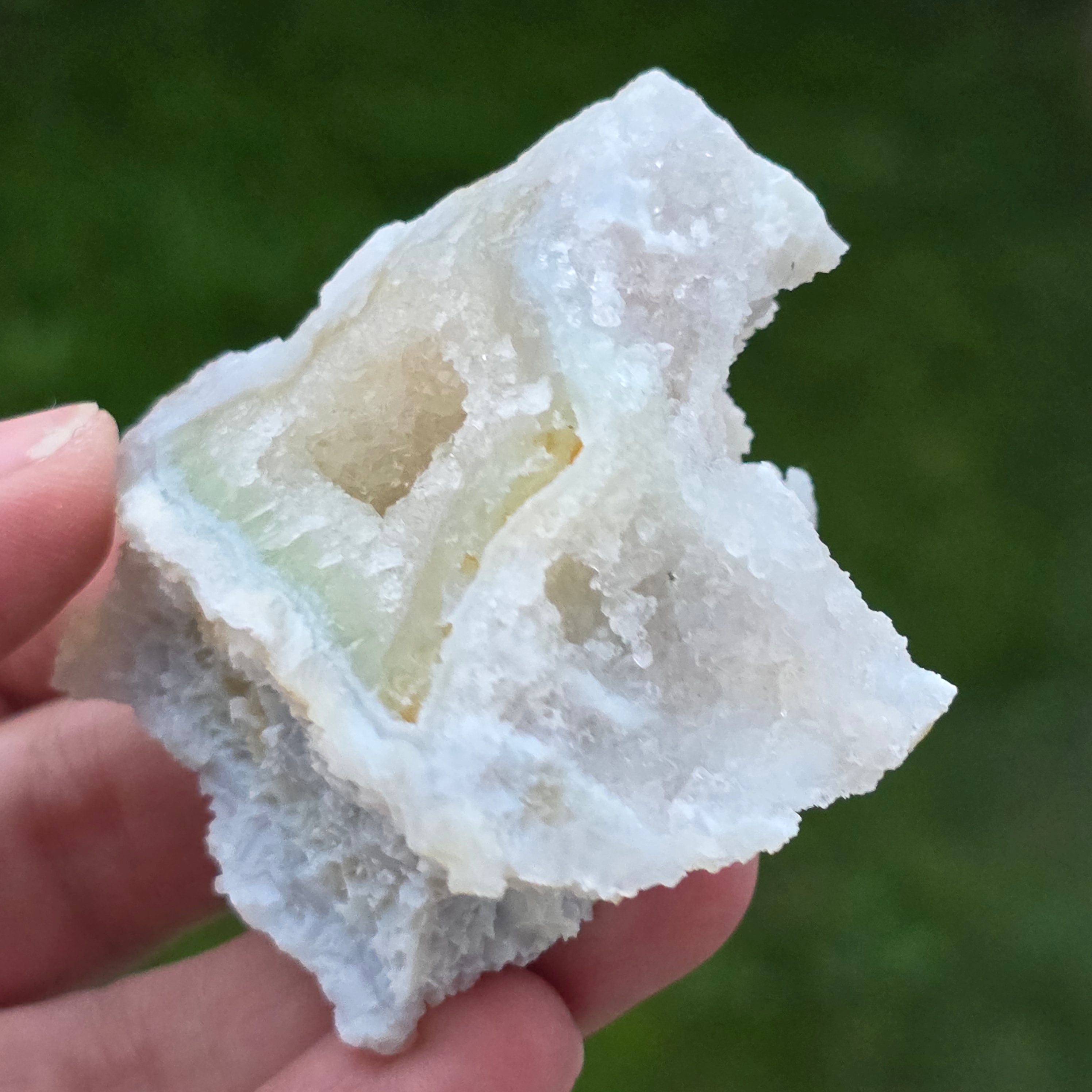 Kék csipkés Achát és Kék Kalcedon mintadarab, származása Nsanje, Malawi. Ezek a különleges képződmények egy összetett savas fürdőn mennek keresztül Dél-Afrikában, mely gondosan eltávolítja a legtöbb vagy az összes mátrix nyomát, így tiszta, rendkívül szép Kék Csipkés Achátot és/vagy Kék Kalcedont hagyva maga után.