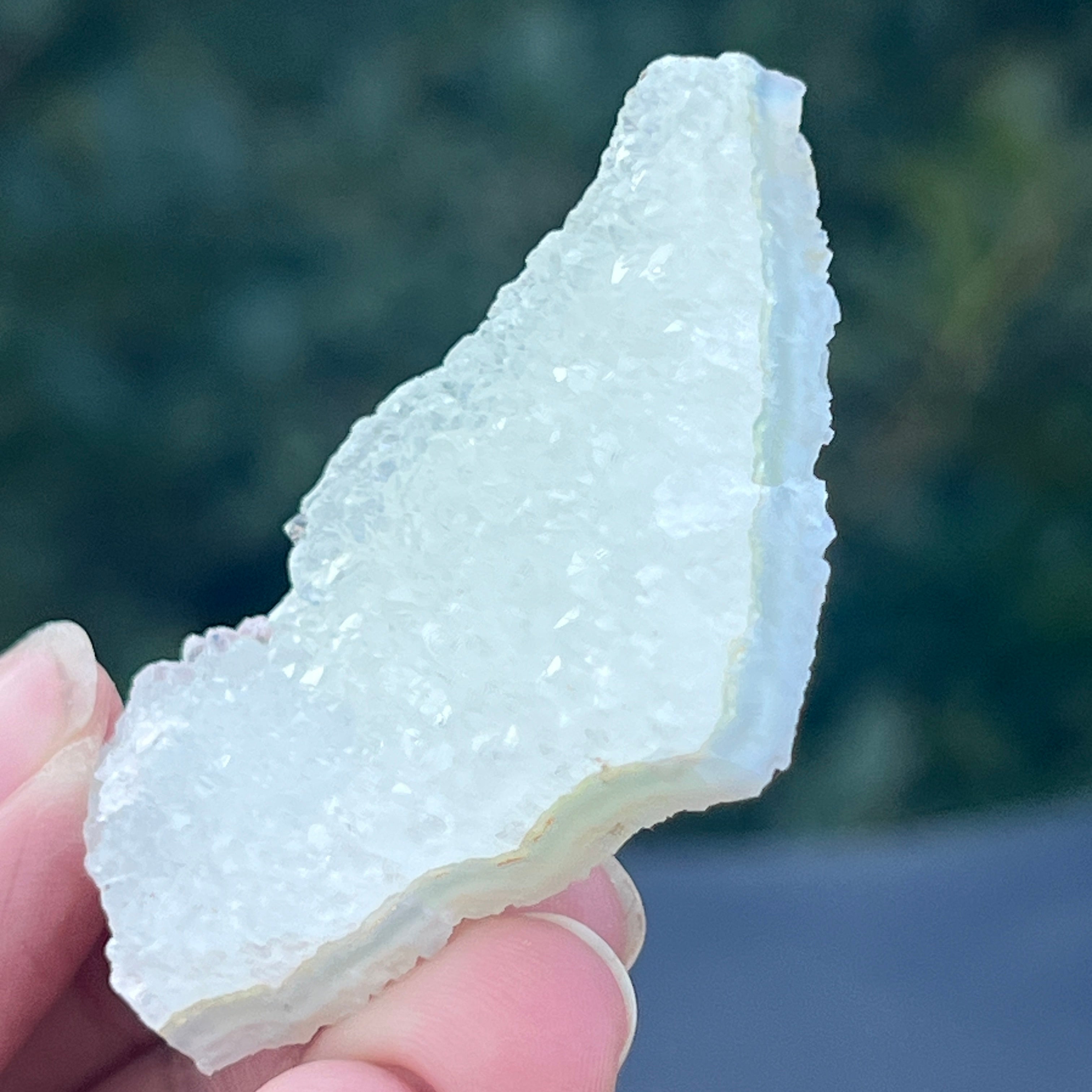 Kék csipkés achát és kék kalcedon példány, amely Nsanje-ből, Malawiból származik. Ezek a különleges képződmények egy összetett savas fürdőn mennek át Dél-Afrikában, amely gondosan eltávolítja a mátrix nagy részét vagy egészét, mögötte tiszta kék csipkés achátot és/vagy kék kalcedont hagyva, rendkívüli szépséggel.