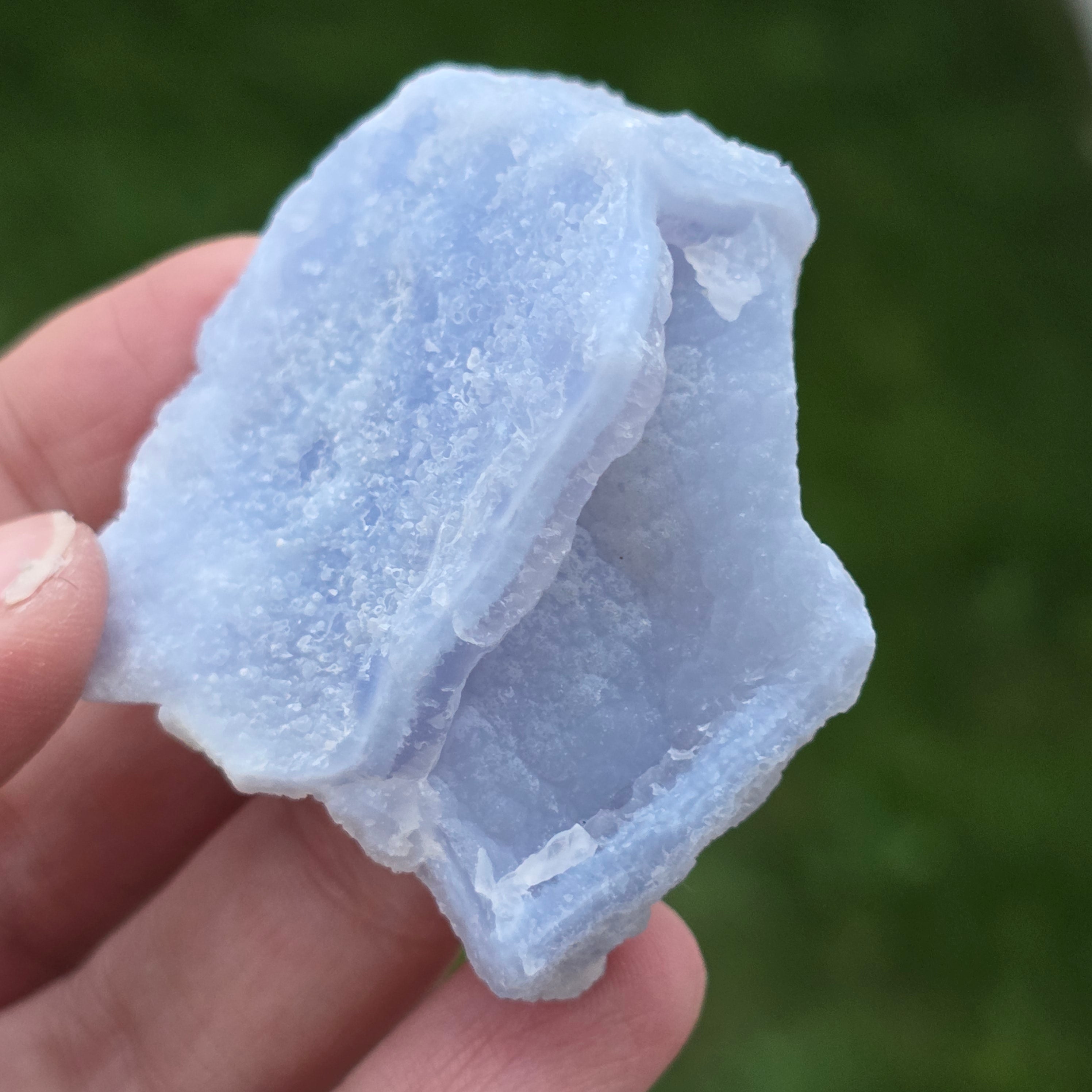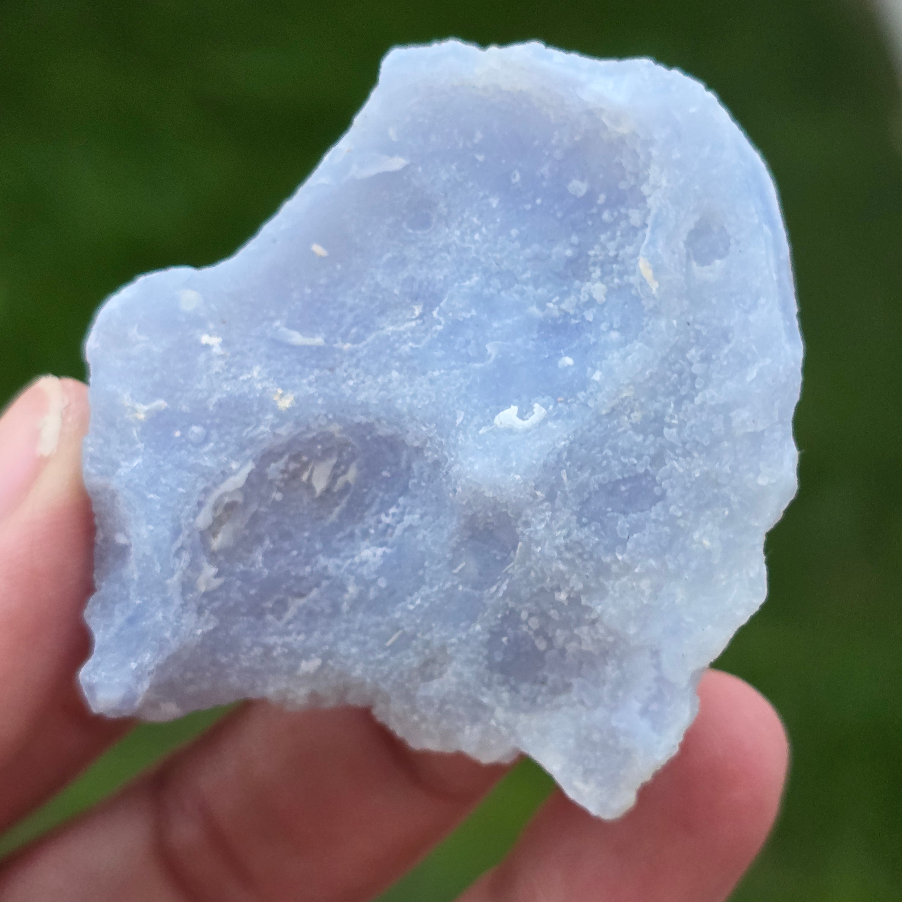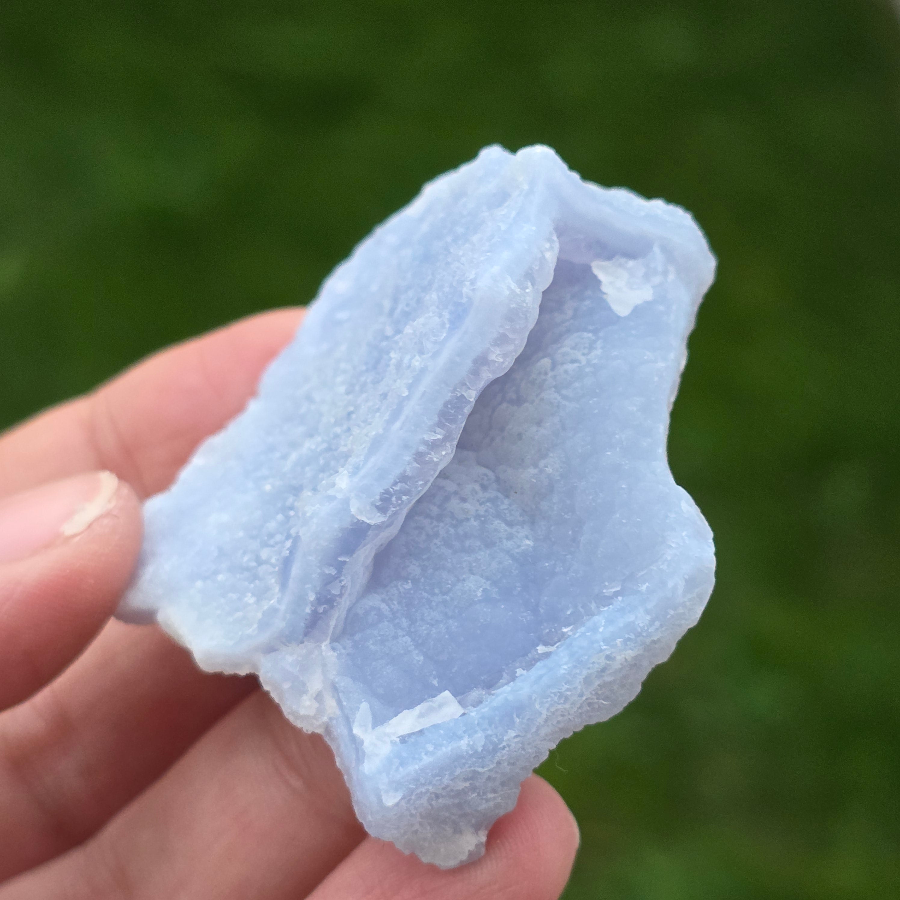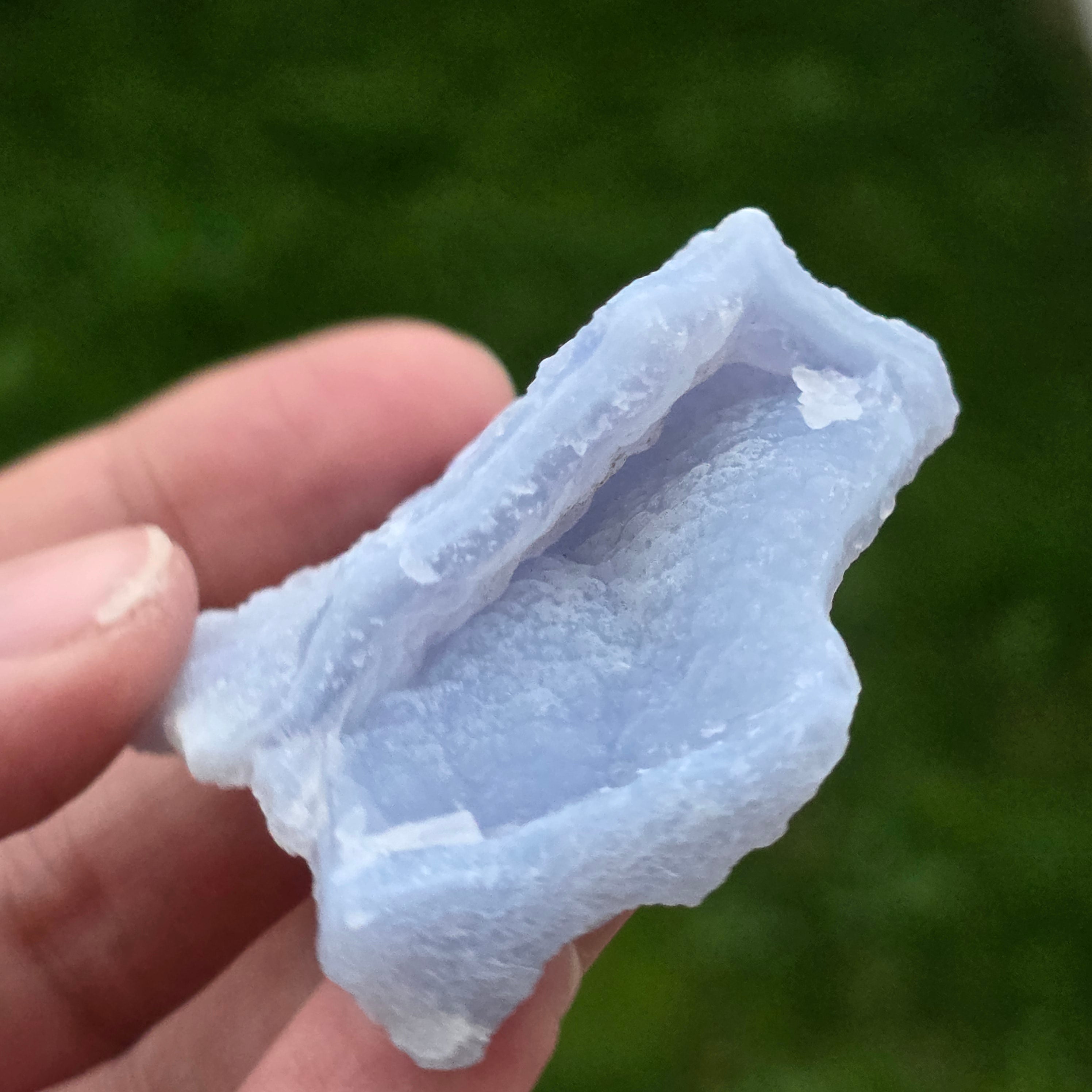 Kék csipkés achát és kék kalcedon példány, származása Nsanje, Malawi. Ezeket a különleges képződményeket Dél-Afrikában összetett savfürdős folyamaton viszik keresztül, amely gondosan eltávolítja a legtöbb vagy az összes mátrixot, így tiszta Kék Csipkés Achát és/vagy kék kalcedon marad hátra, rendkívüli szépséggel.