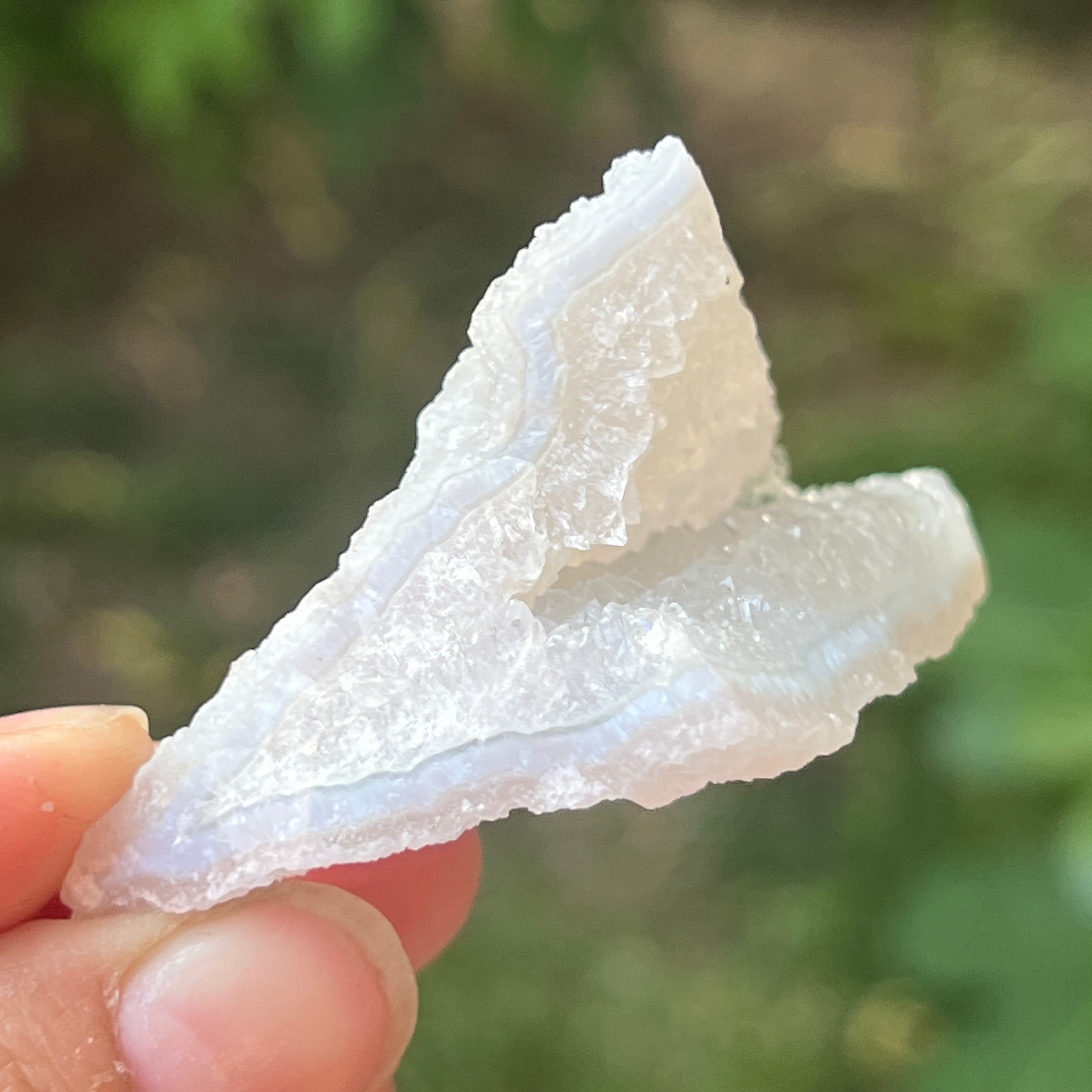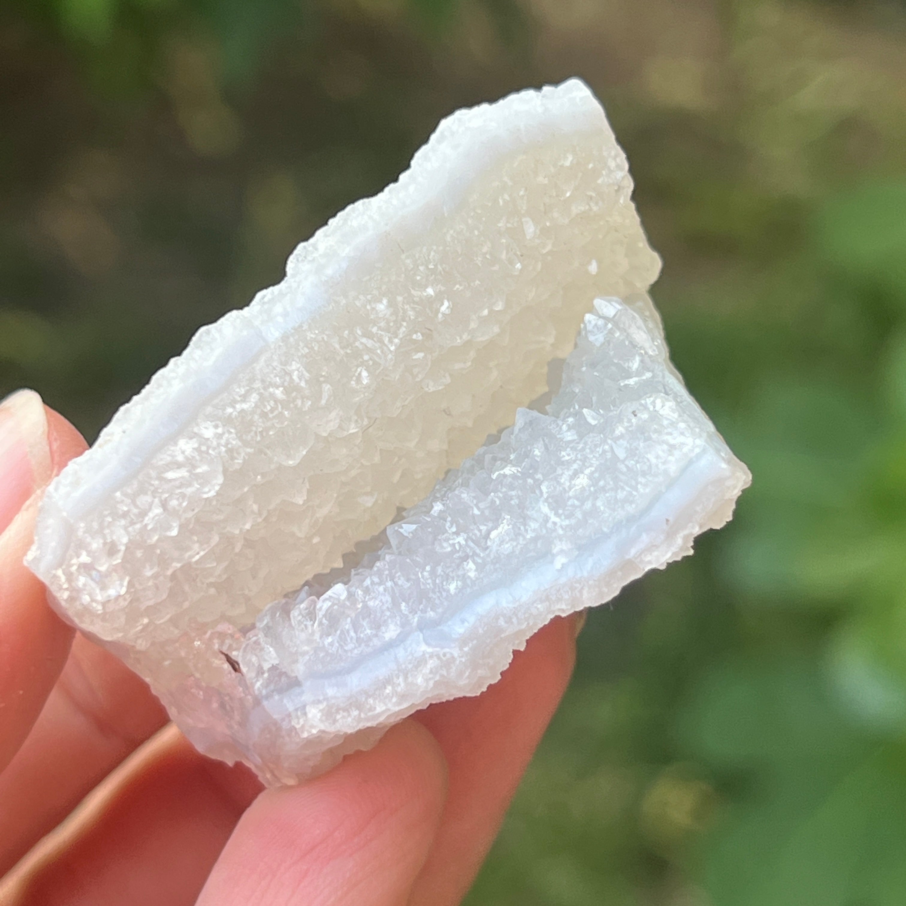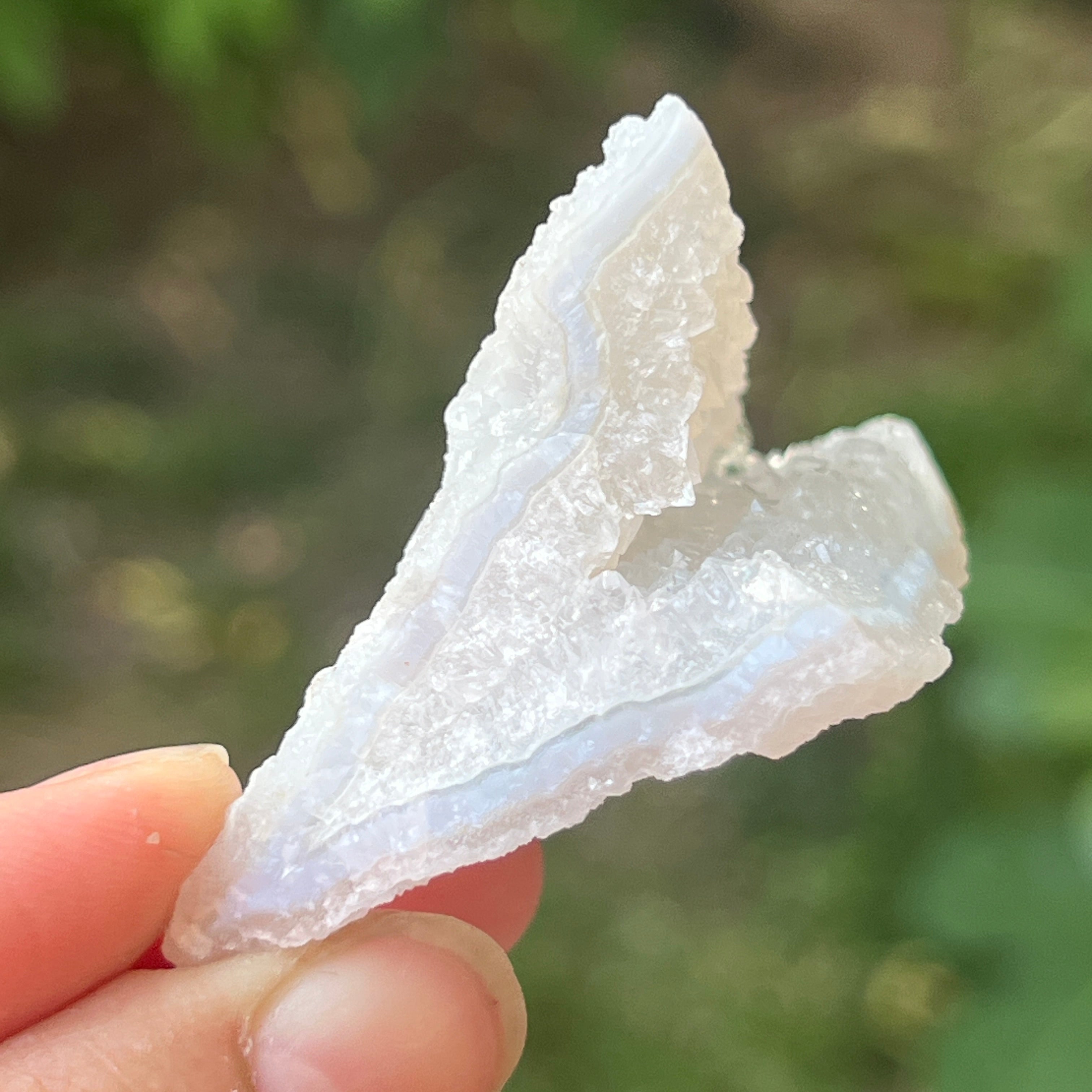 Kék csipkés achát és kék kalcedon példány, származása Nsanje, Malawi. Ezeket a különleges képződményeket Dél-Afrikában összetett savfürdős folyamaton viszik keresztül, amely gondosan eltávolítja a legtöbb vagy az összes mátrixot, így tiszta kék csipkés achát és/vagy kék kalcedon marad hátra, rendkívüli szépséggel.