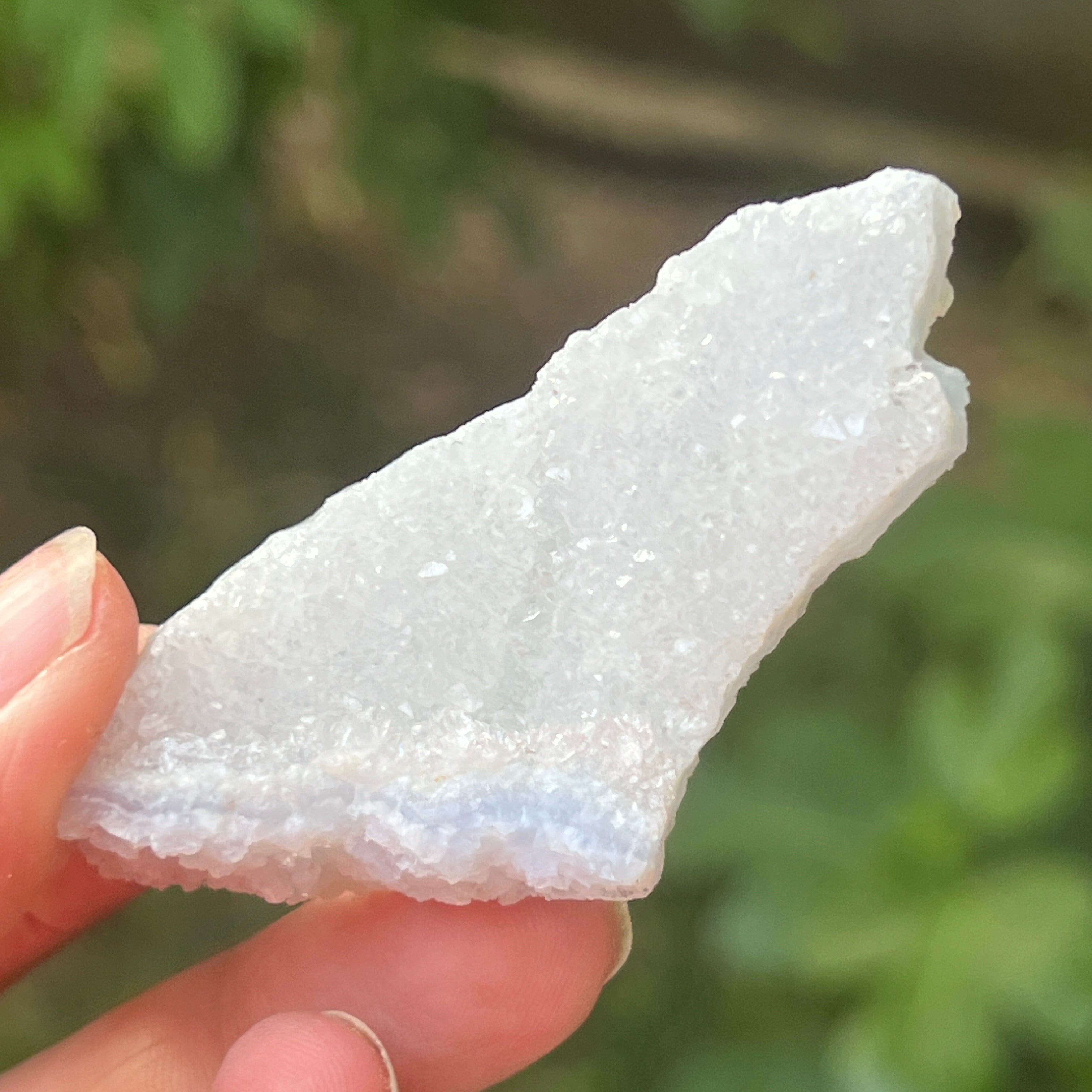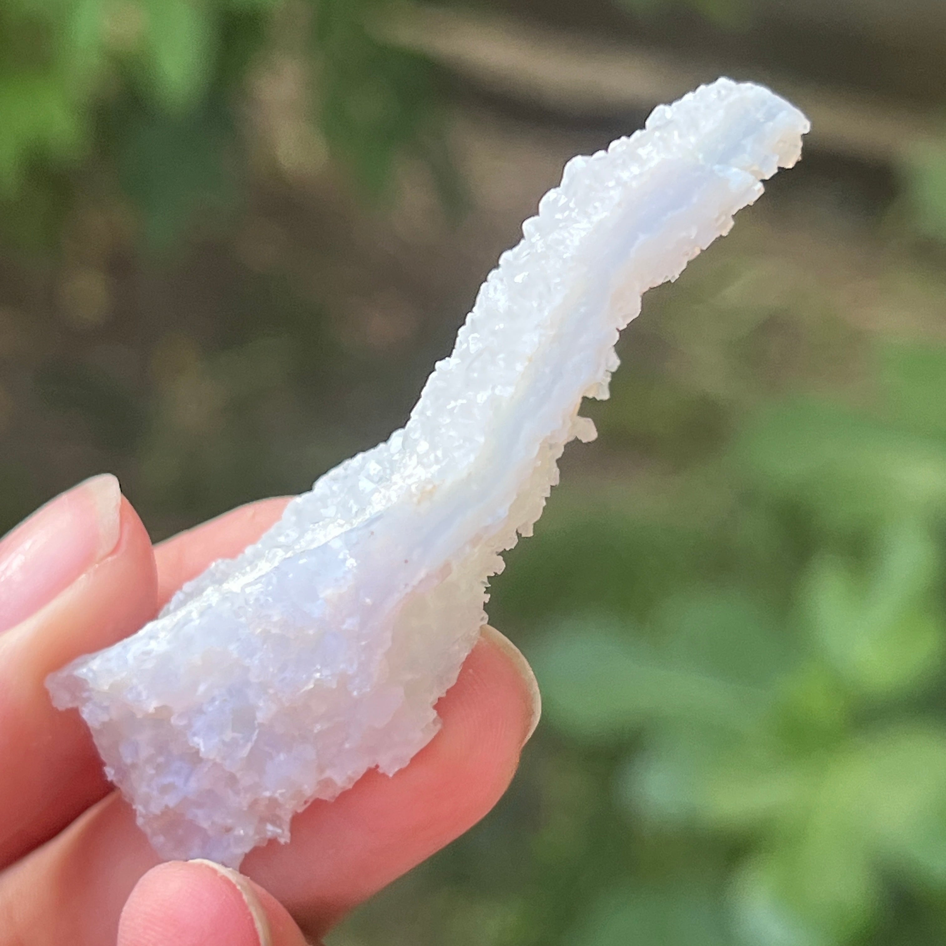 Kék díszes achát és kék kalcedon példány, származási hely: Nsanje, Malawi. Ezek a különleges képződmények Dél-Afrikában bonyolult savas fürdőkön mennek keresztül, amelyek gondosan eltávolítják a mátrix nagy részét vagy egészét, így tiszta Kék díszes achátot és/vagy Kék kalcedont hagyva maguk után, kiemelkedő szépséggel.
