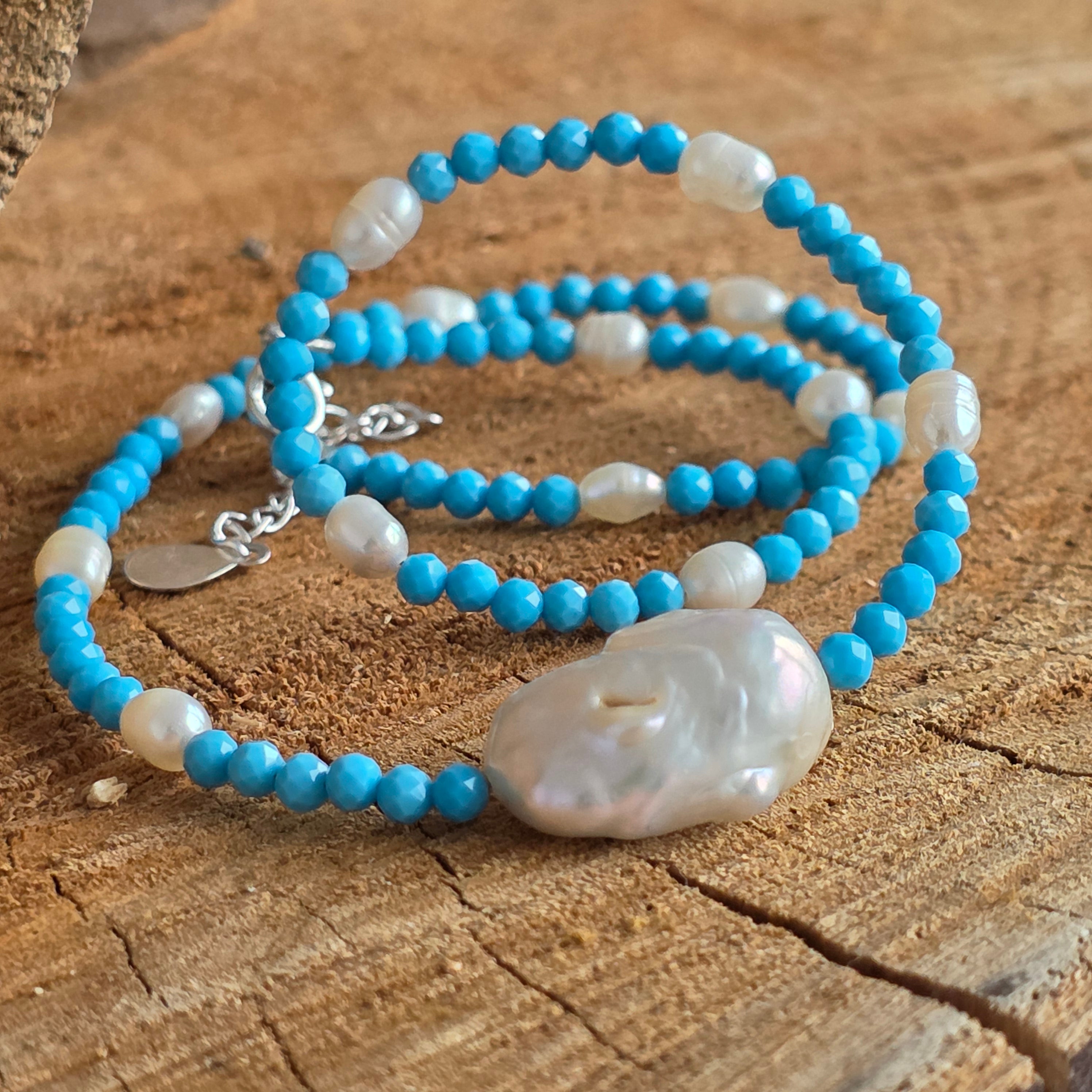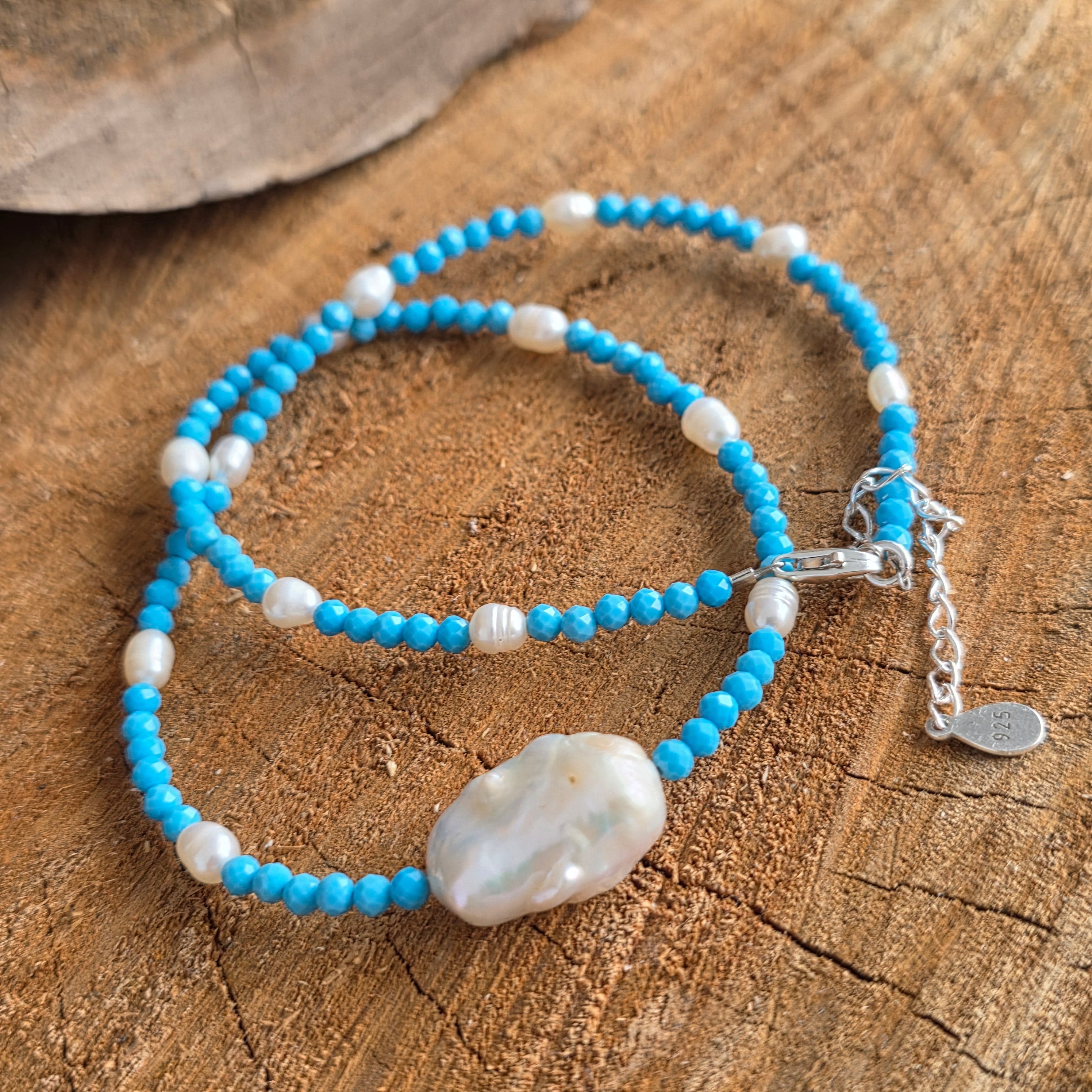 A kék howlit ismert arról, hogy csökkenti a mentális feszültséget, és támogatja a tiszta, hiteles és kiegyensúlyozott önkifejezést. A gyöngyök tökéletlen szépségükkel gyengédséget és mélységet adnak – mint egy meghívás, hogy egyszerűen önmagad legyél.