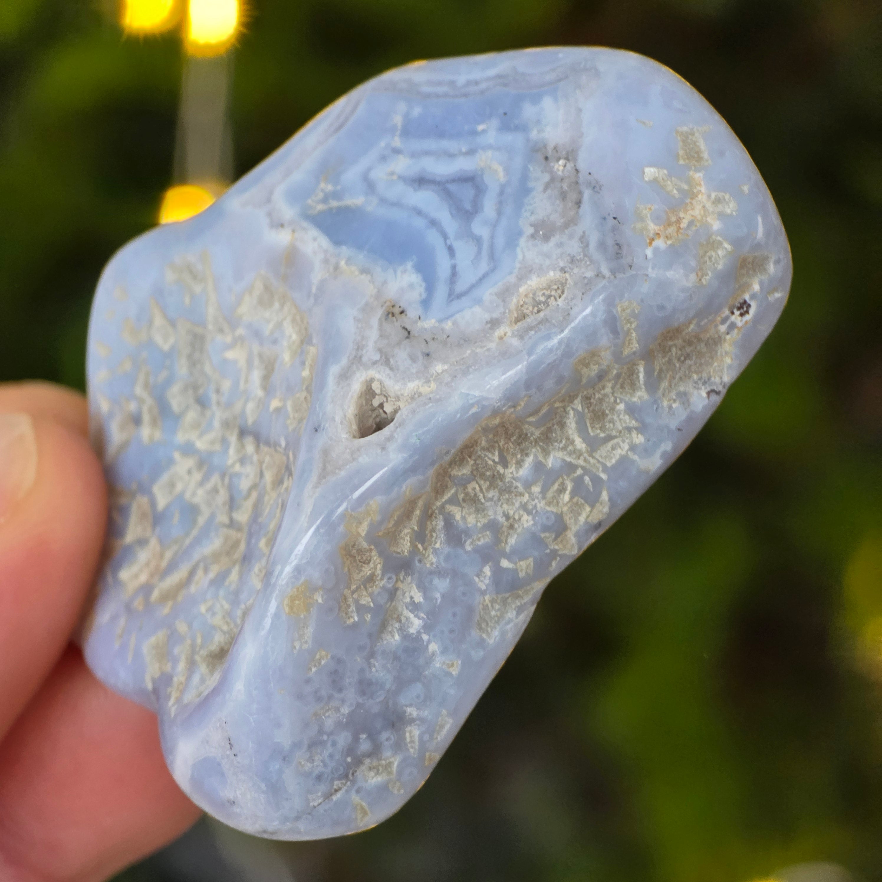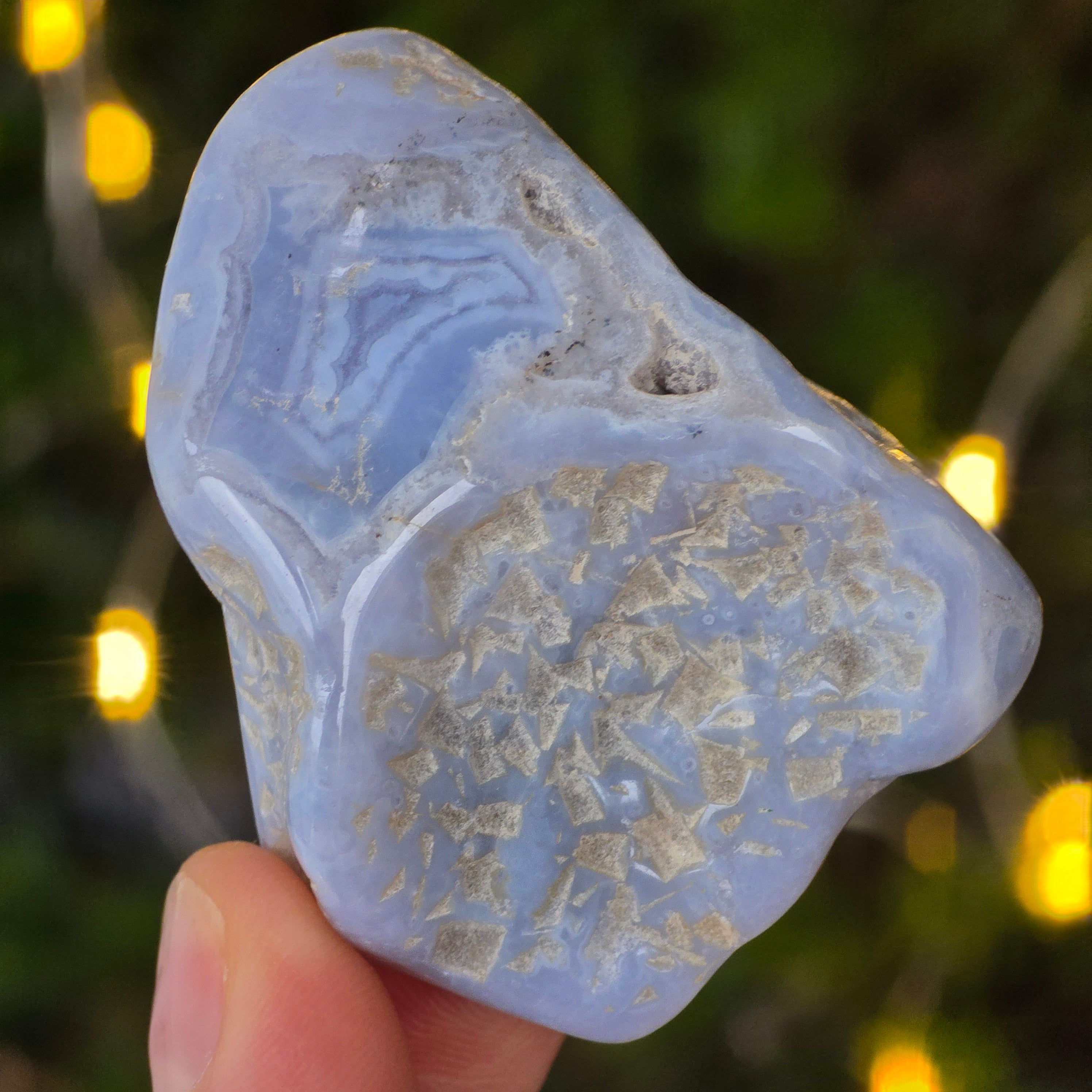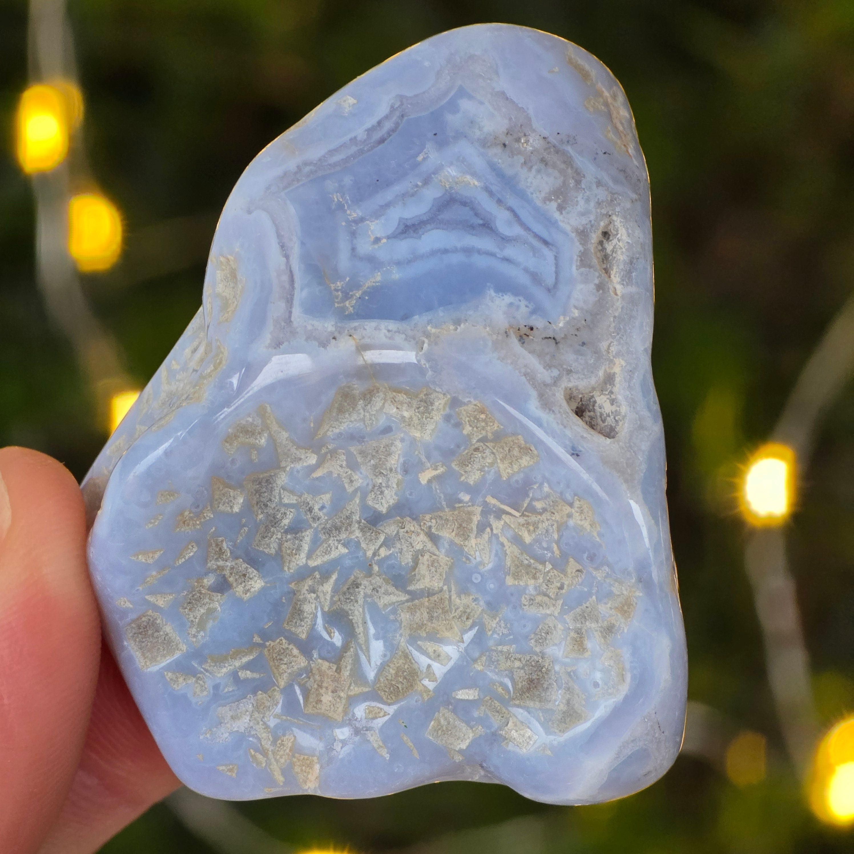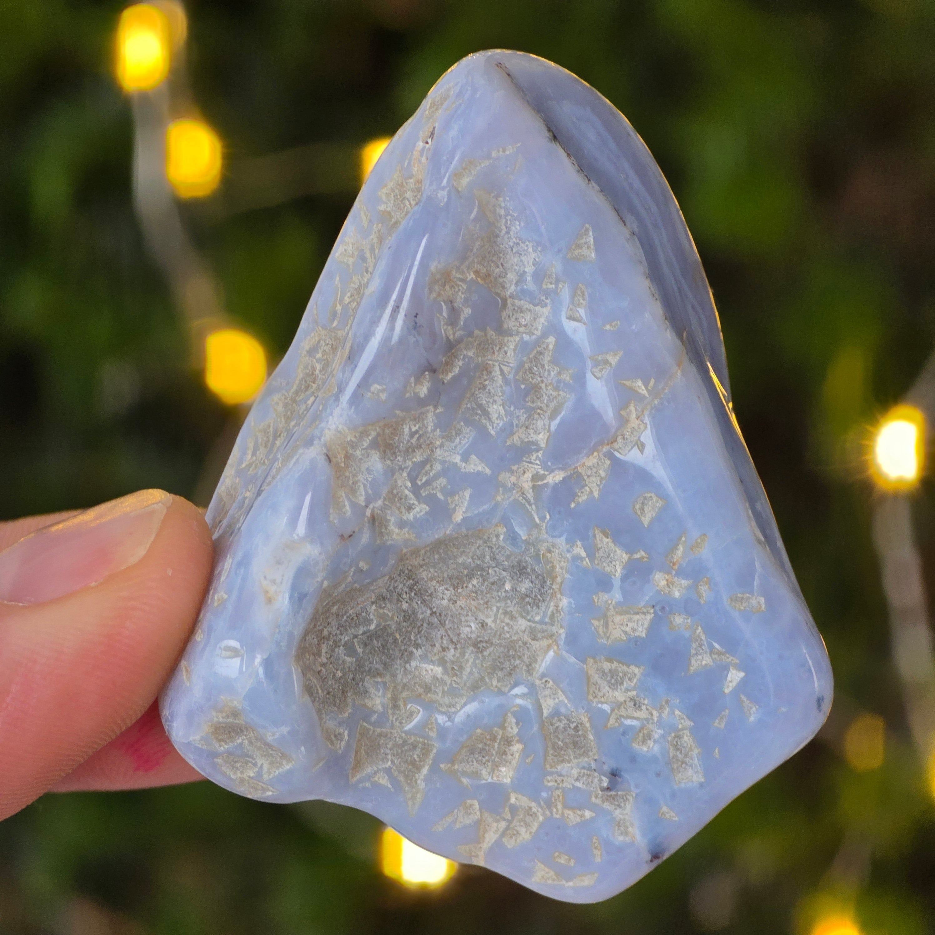 A kék kalcedont általában a kommunikációval, az önkifejezéssel és az igazsággal társítják, segítheti a hiteles kommunikáció ösztönzését.
