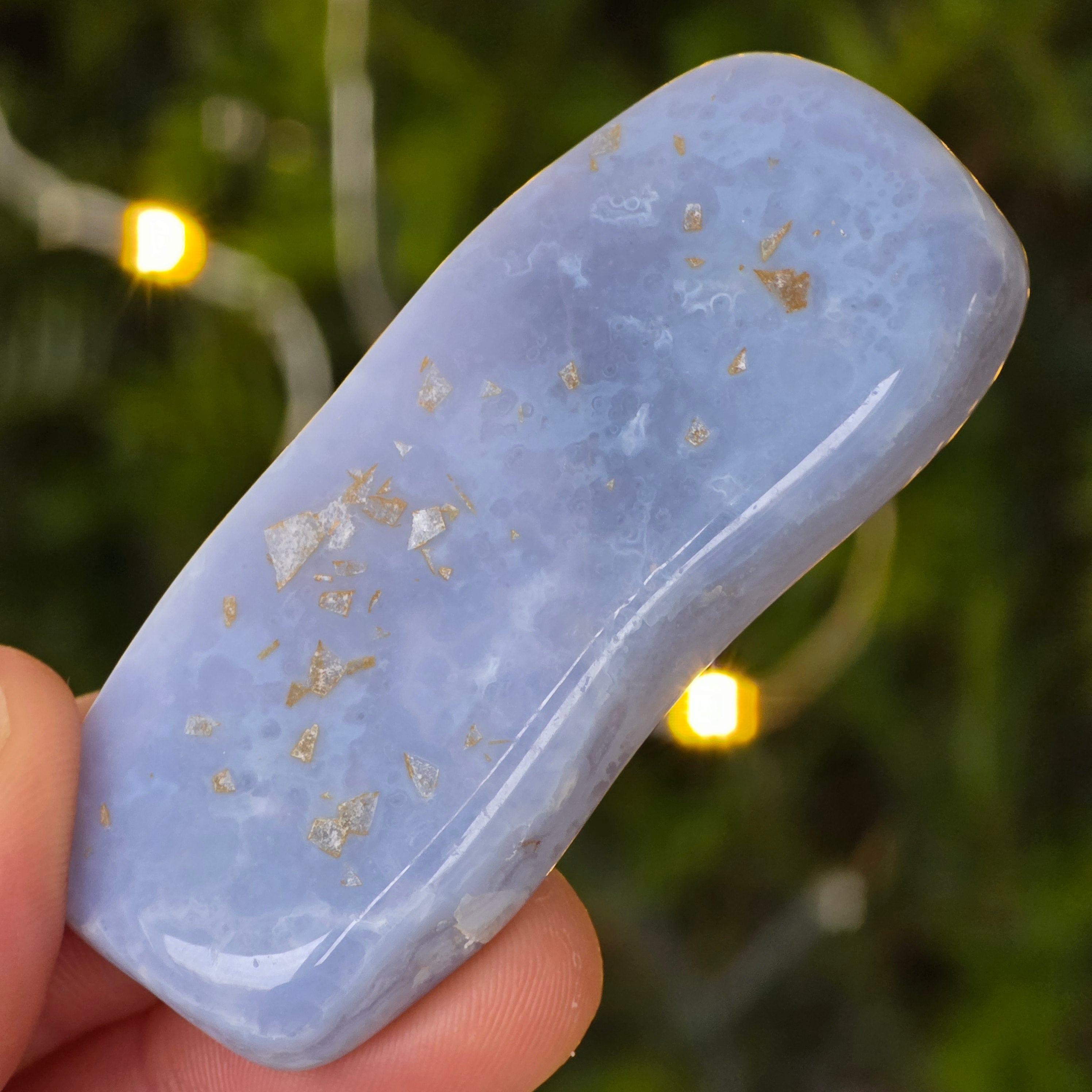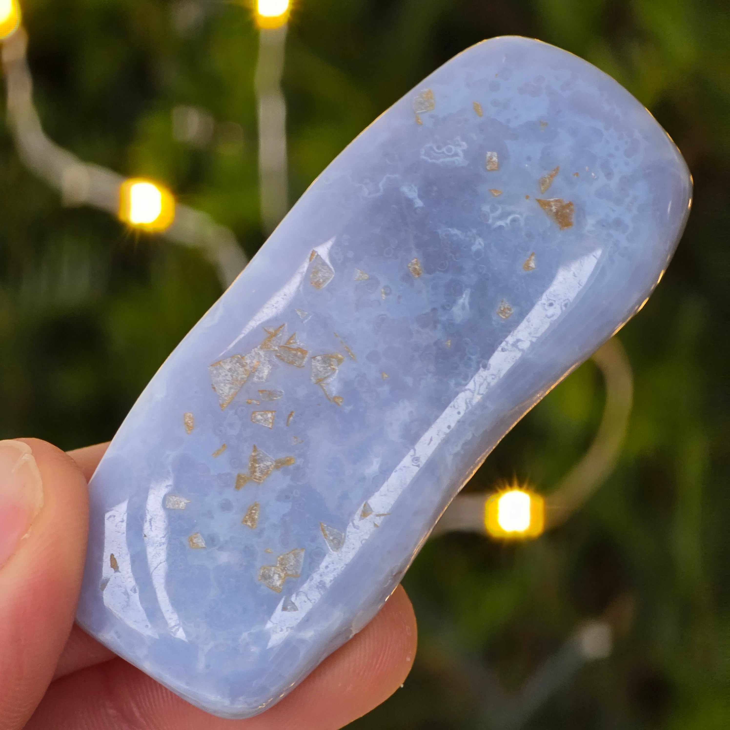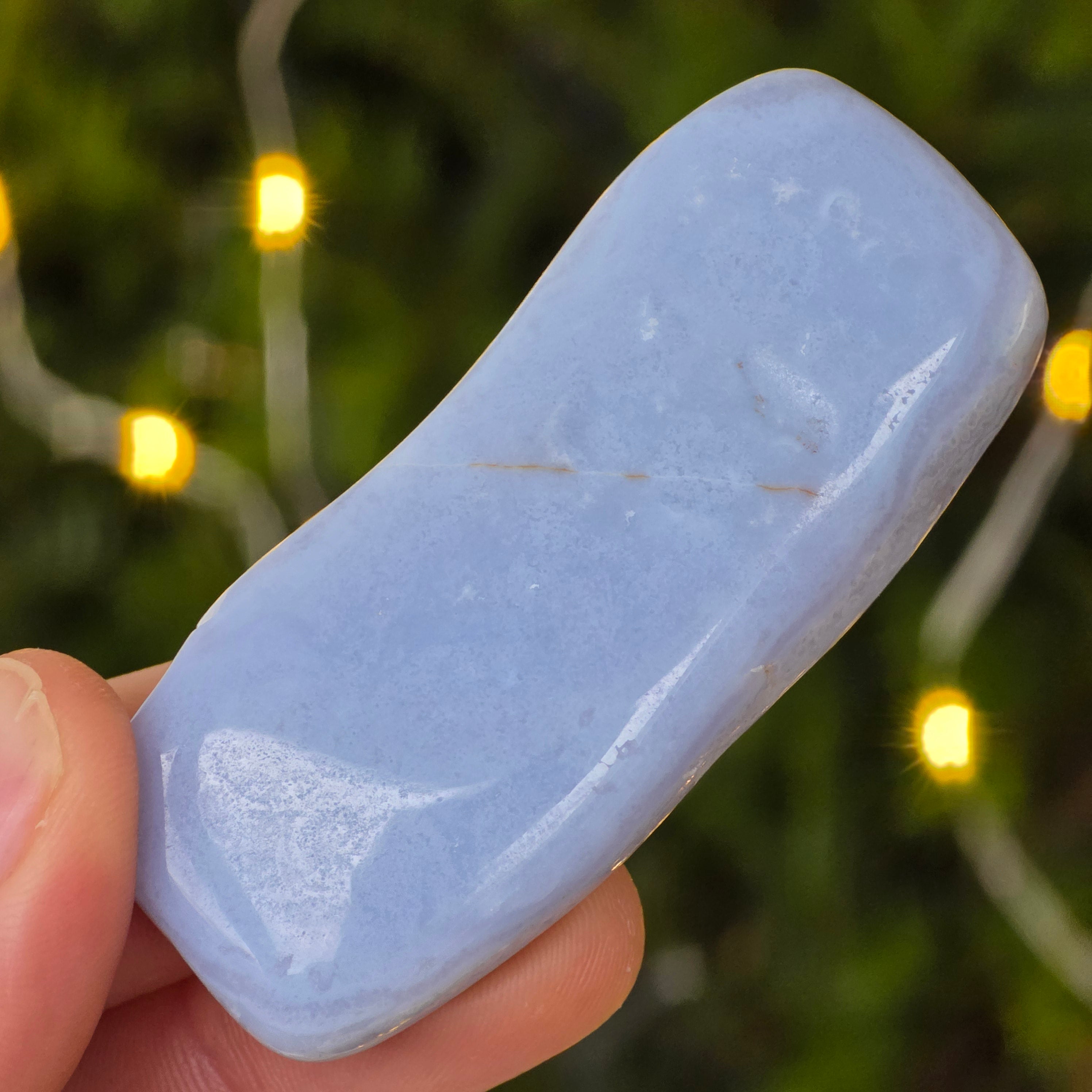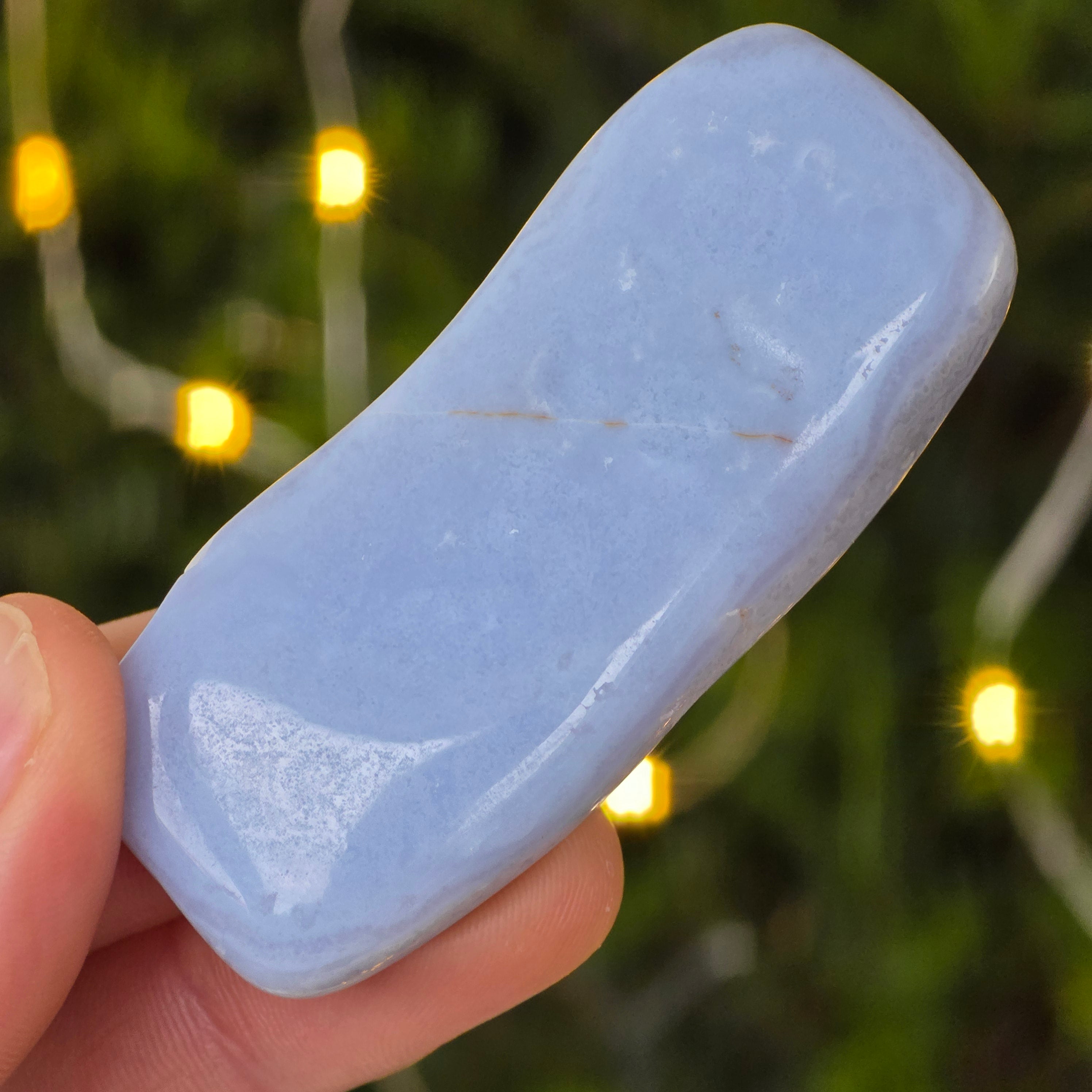 A kék kalcedont általában a kommunikációval, az önkifejezéssel és az igazsággal kapcsolják össze, segíthet a hiteles kommunikáció ösztönzésében.