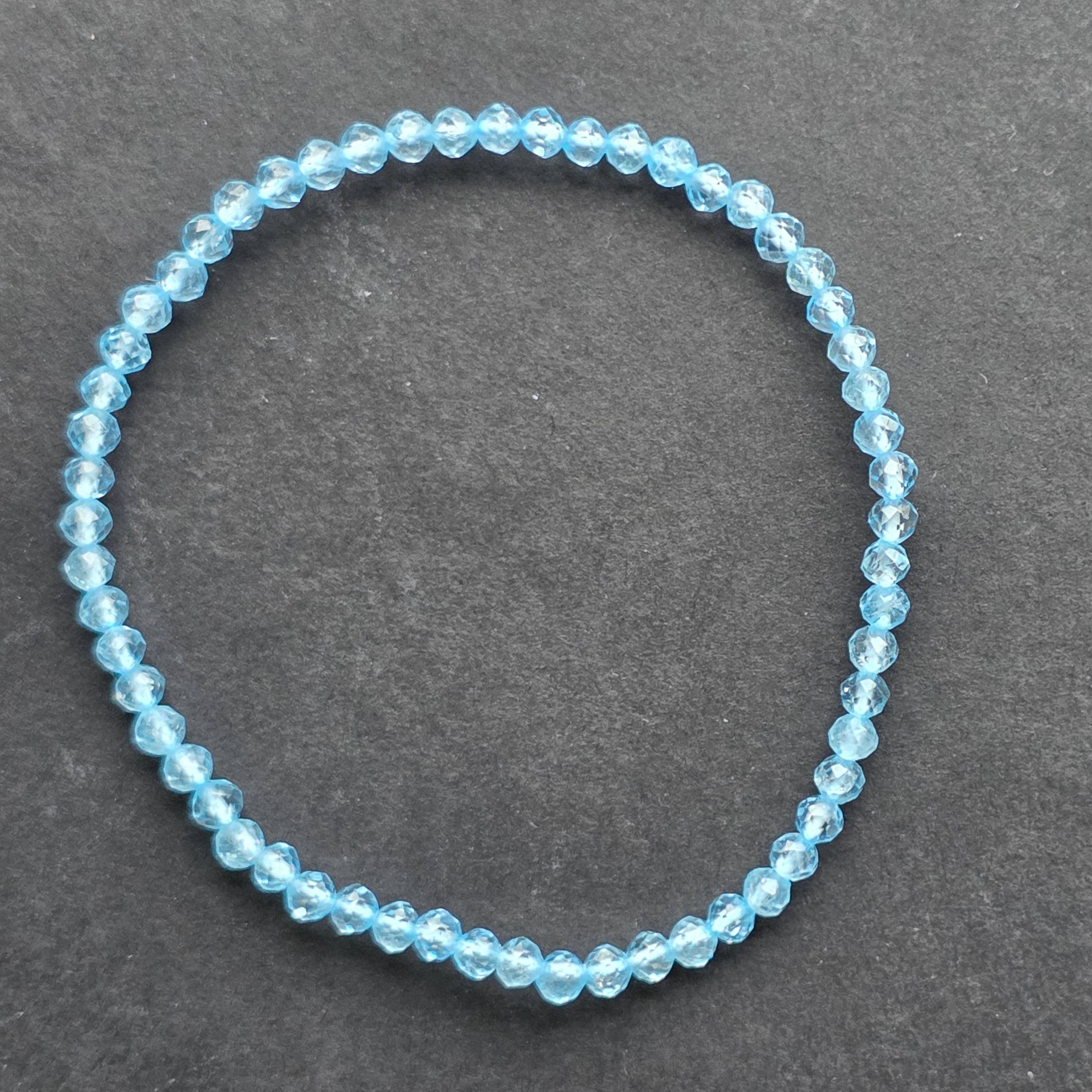 Egy karkötő, amely olyan finom, mint a tengeri szellő, ahol az ég fénye minden oldalon visszaverődik. Gyöngyök Természetes kék topáz felületek, átmérője 3 mm, tiszta, kristálytiszta fényt sugároz, amely egy tiszta reggel tiszta vizére emlékeztet. Ez egy finom és kifinomult ékköv, amelyet azok számára készítettek, akik egyensúlyt és belső békét keresnek.