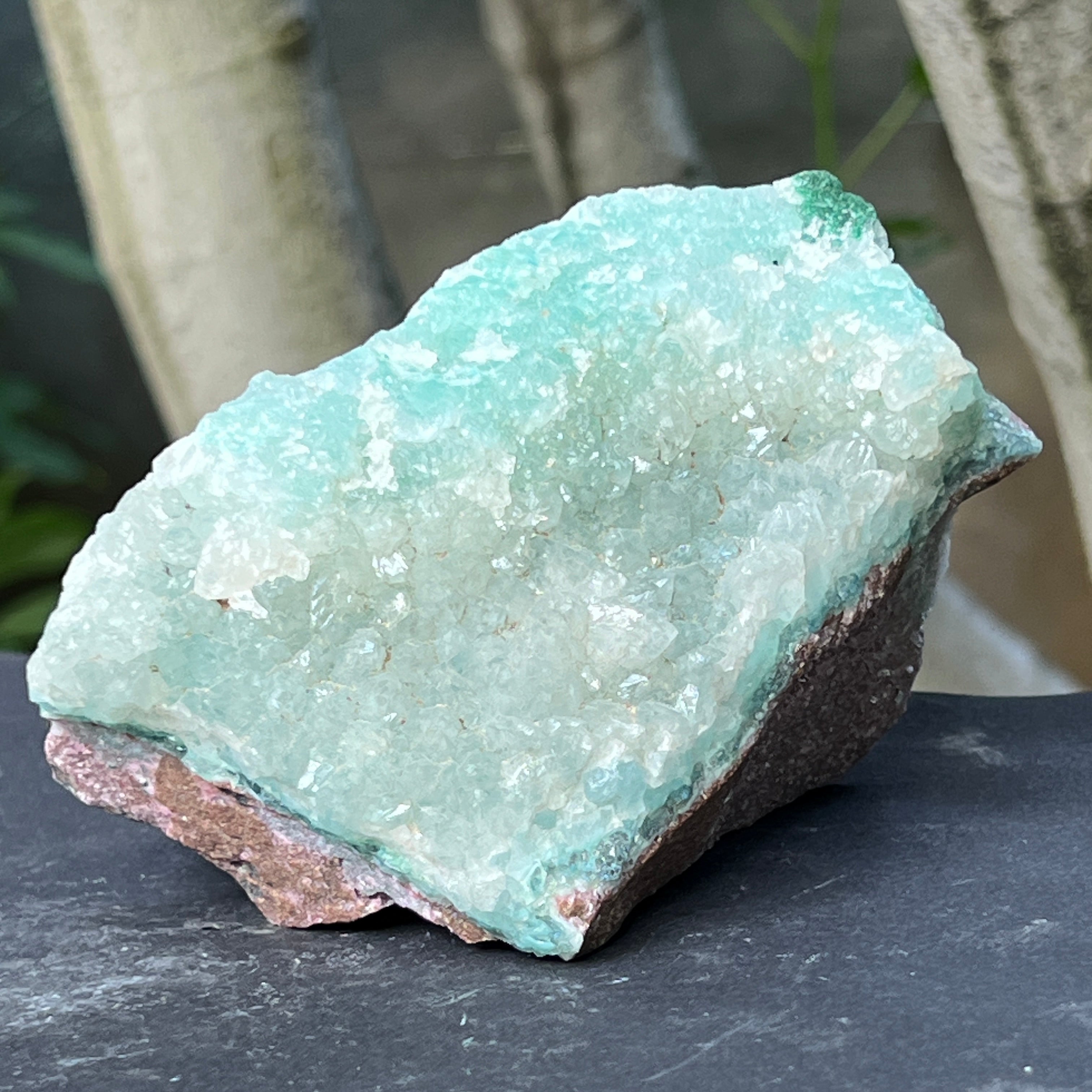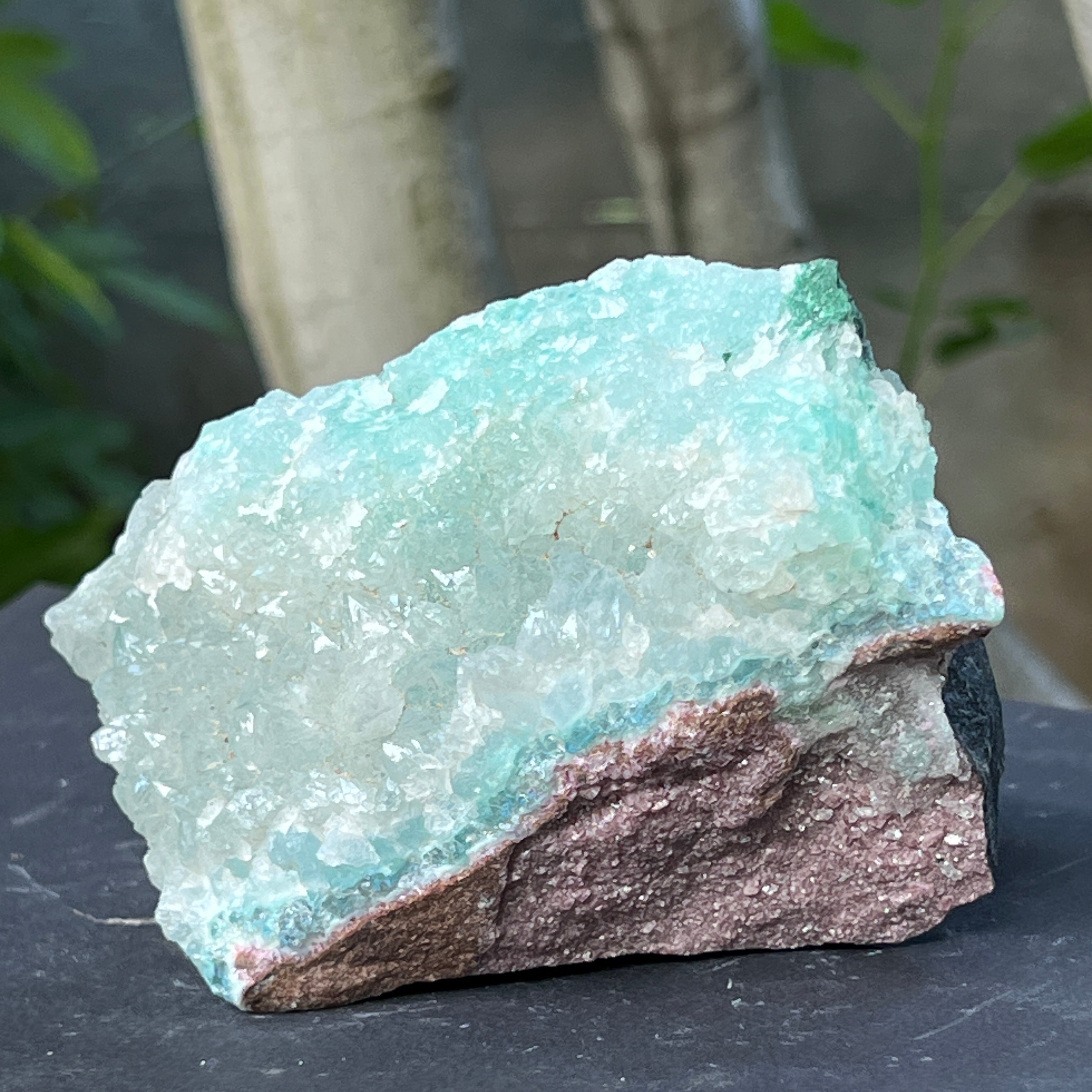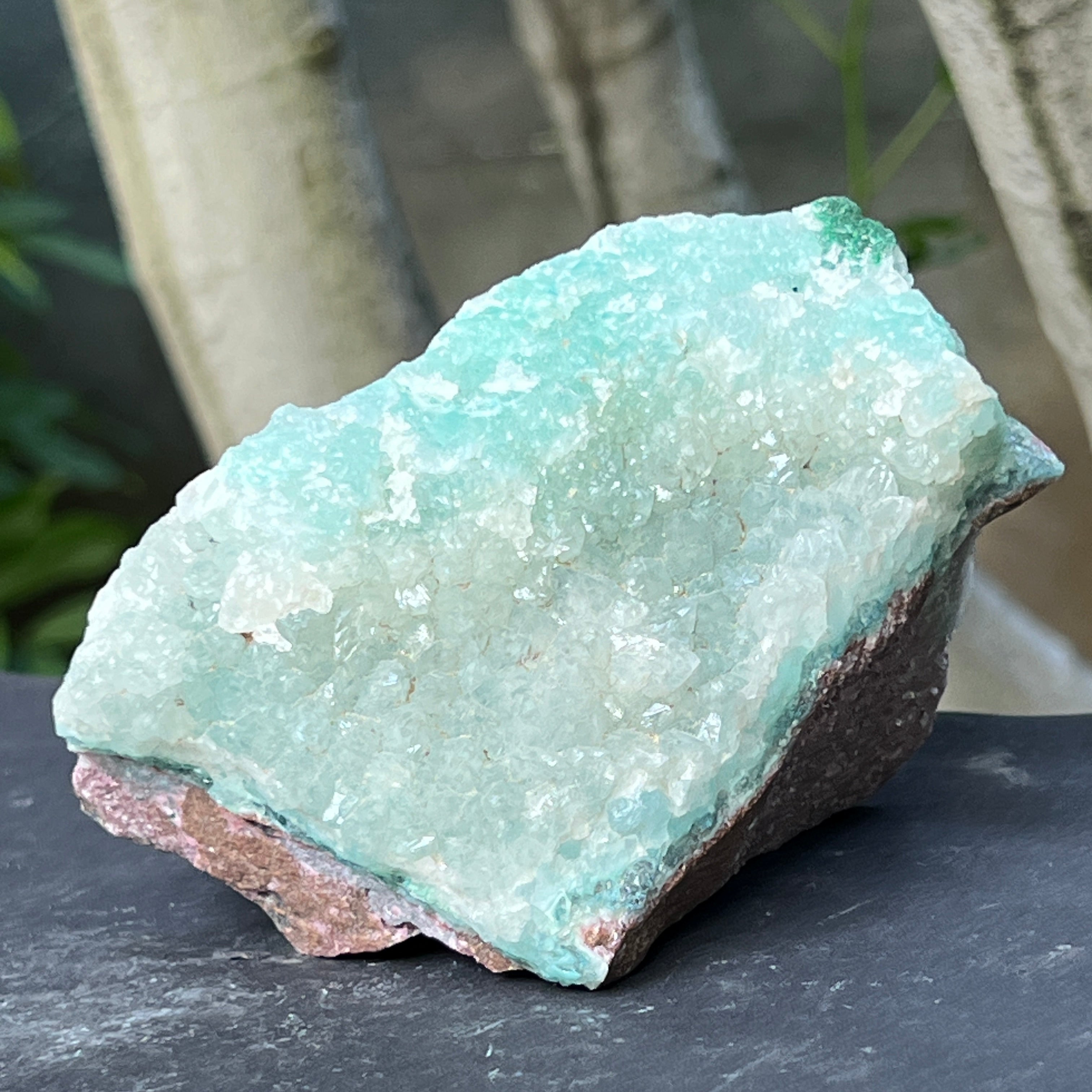 Afrika szívében, ott, ahol a kőzetek ritka, mély ásványok lenyomatát hordozzák, született meg ez a krómkalcedon – egy kő, mely az smaragdzöld varázsát egyesíti a világoskék árnyalatokkal, mintha az ég átszűrődne egy álmon.
