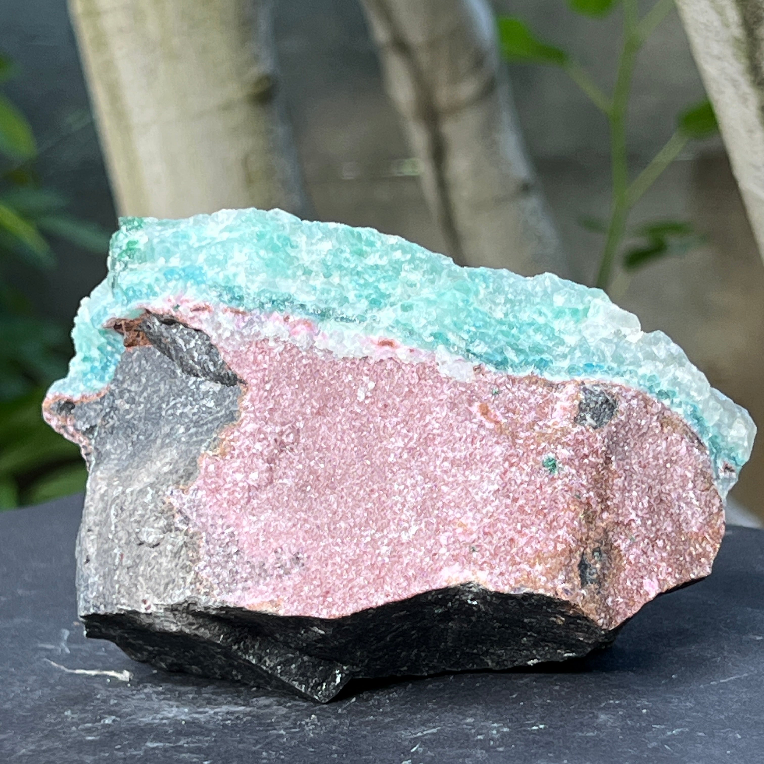 Ez a kalcedon természetes, érintetlen formája – egy nehezen található krómásvány, amely kizárólag Zimbabwe területéről származik, és élénk színéért értékelik, amely nem nikkelből (mint a krizopráz), hanem a kristályszerkezet mélyéből pulzáló krómból származik. Ebben a különleges változatban a kék és zöld betétek lenyűgöző színjátékot hoznak létre, finom átmenetekkel a áttetsző és átlátszatlan, a sűrű és légies között.