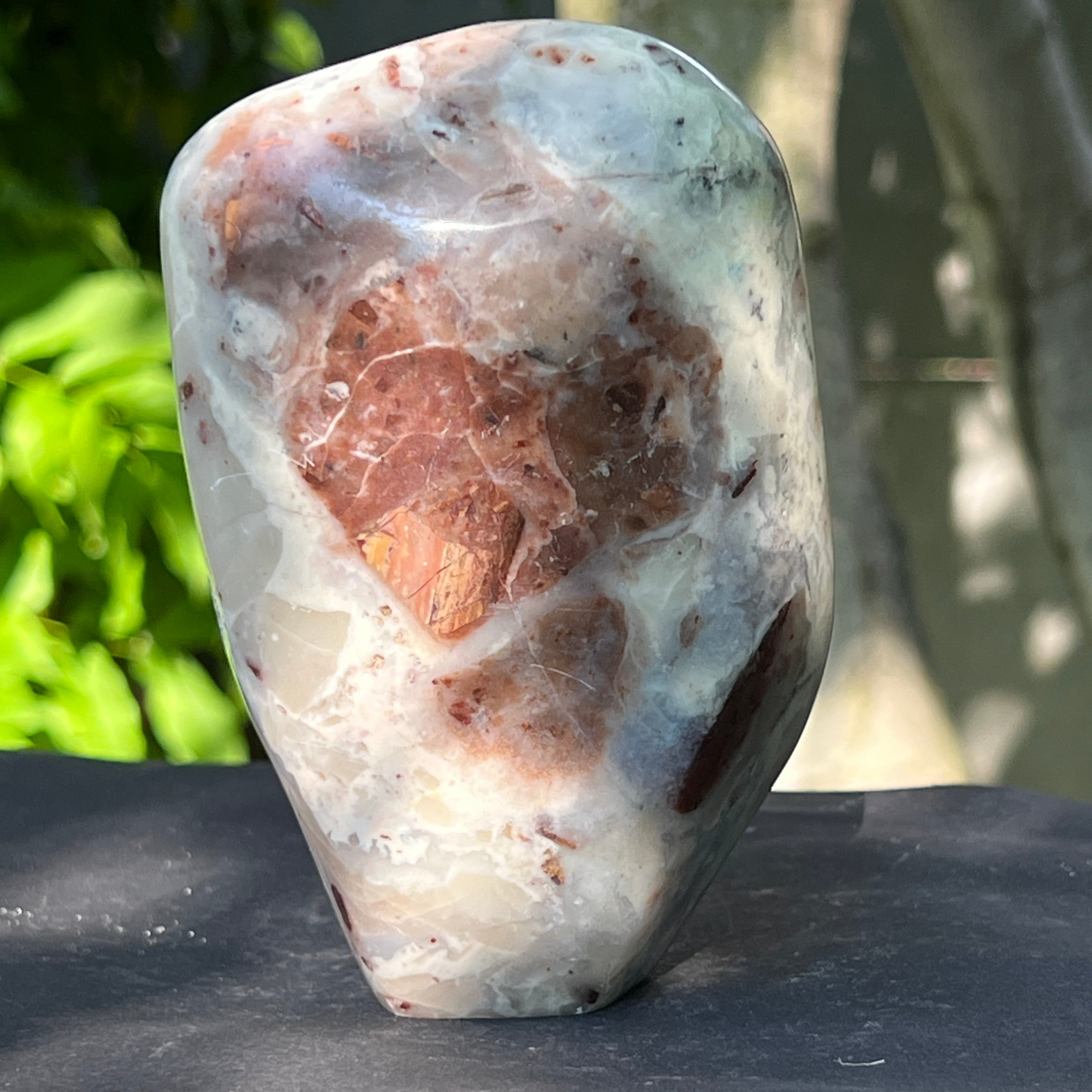 A textúrája élénk – tejeskalméden erekkel, diszkrét kvarchasadásokkal és rozsdaszínű mátrixfoltokkal – mind bizonyítékai a lassú kialakulásnak egy összetett és feszültségekkel teli geológiai környezetben.