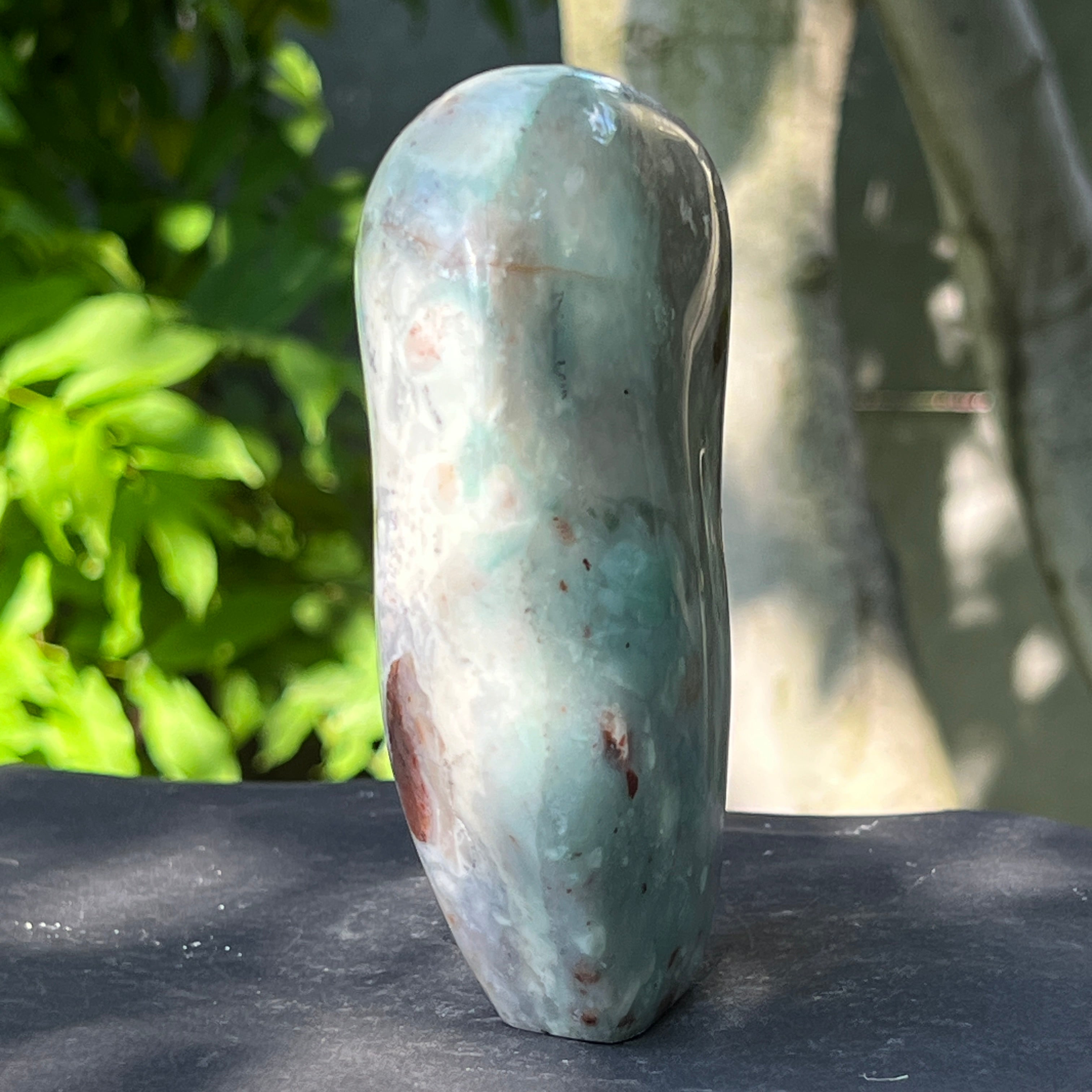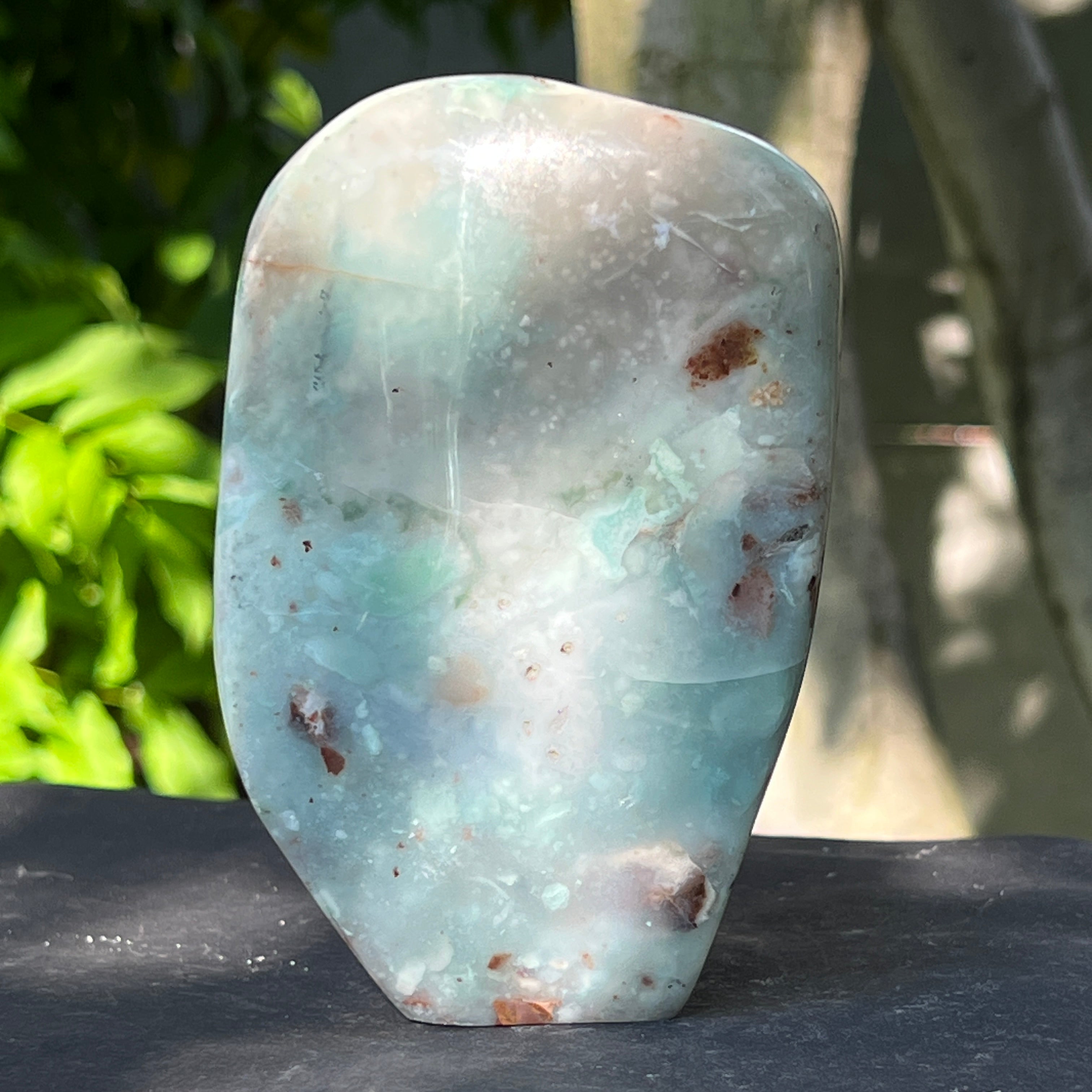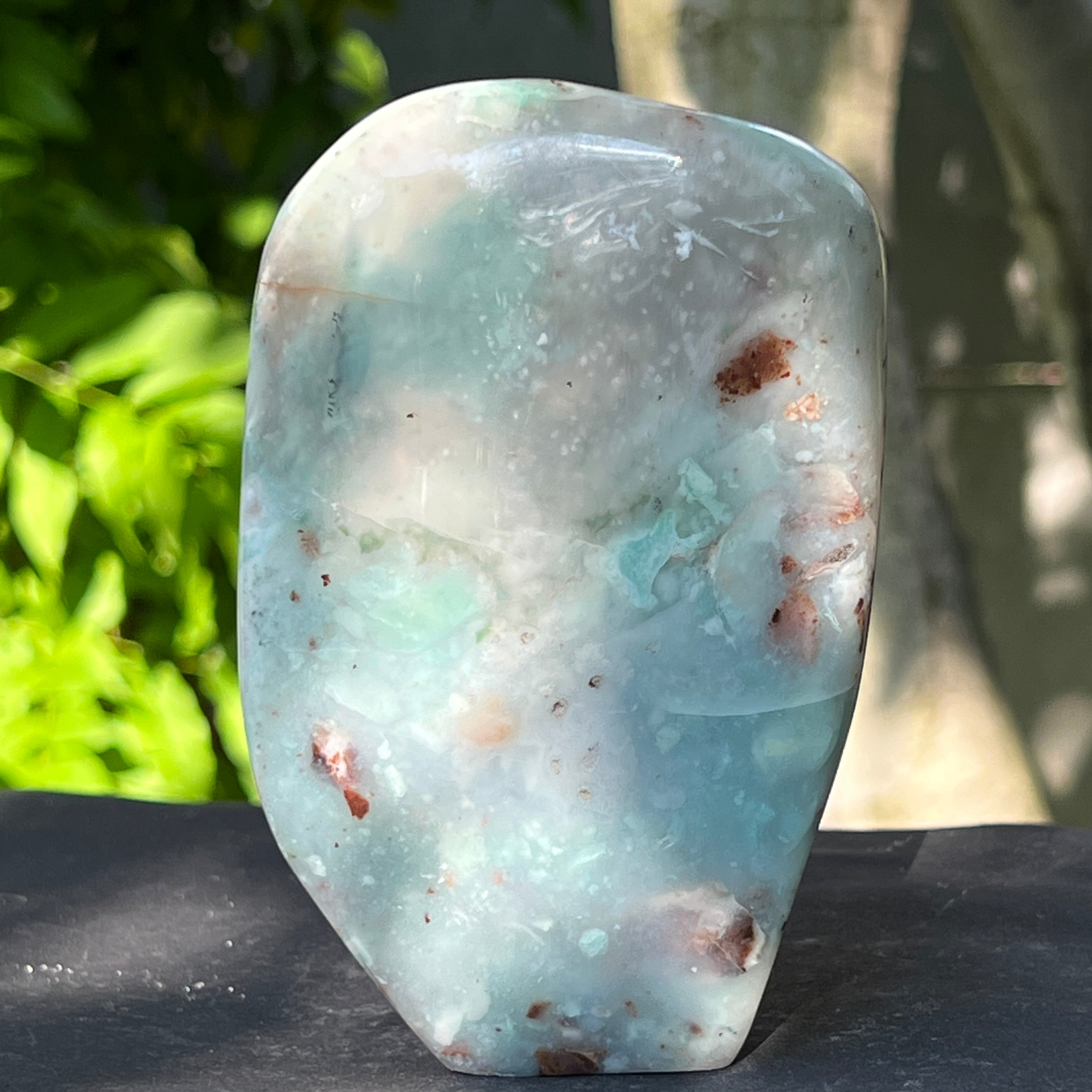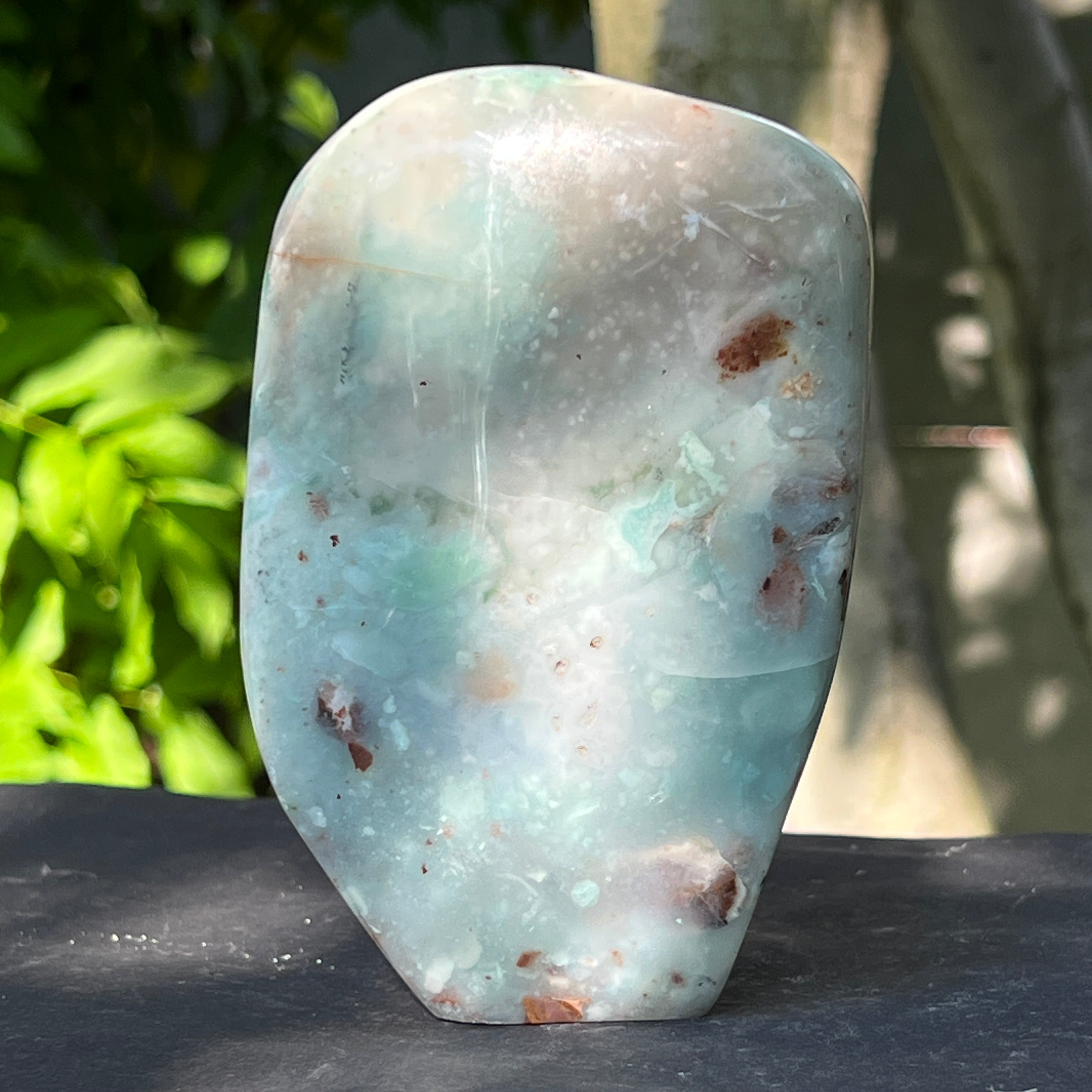 Ez egy természetes, érintetlen forma egy krómkalcedonból – nehezen található ásvány, kizárólag Zimbabwe-ból nyerik, és élénk színe miatt értékelik, amely nem nikkelből származik (mint a krizopráz esetében), hanem a kristályszerkezet mélyéből áramló krómból. Ebben az egyedi változatban a kék és zöld beszúrások lenyűgöző színjátékot hoznak létre, a félátlátszótól az átlátszatlanig, a sűrűtől a könnyedig terjedő átmenetekkel.