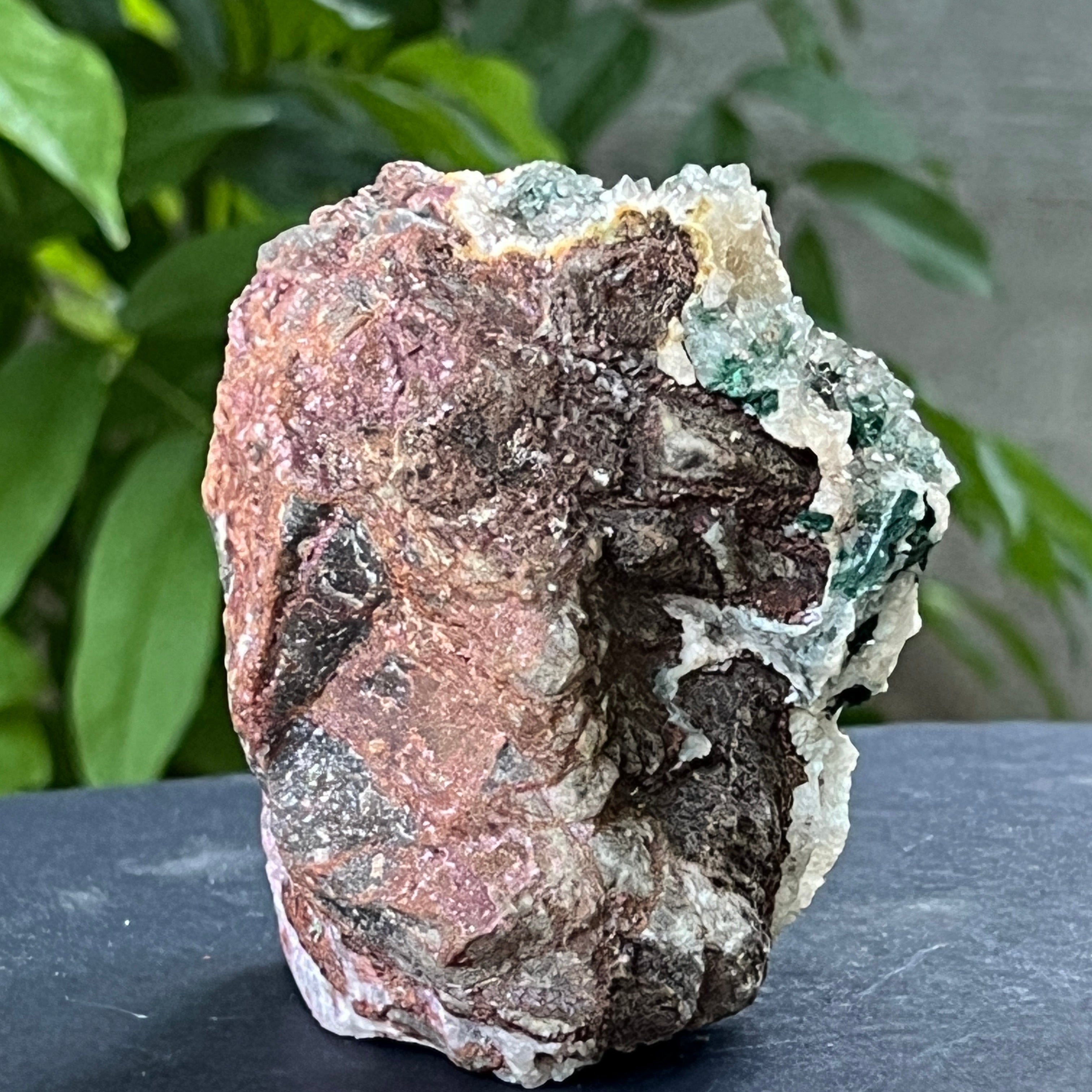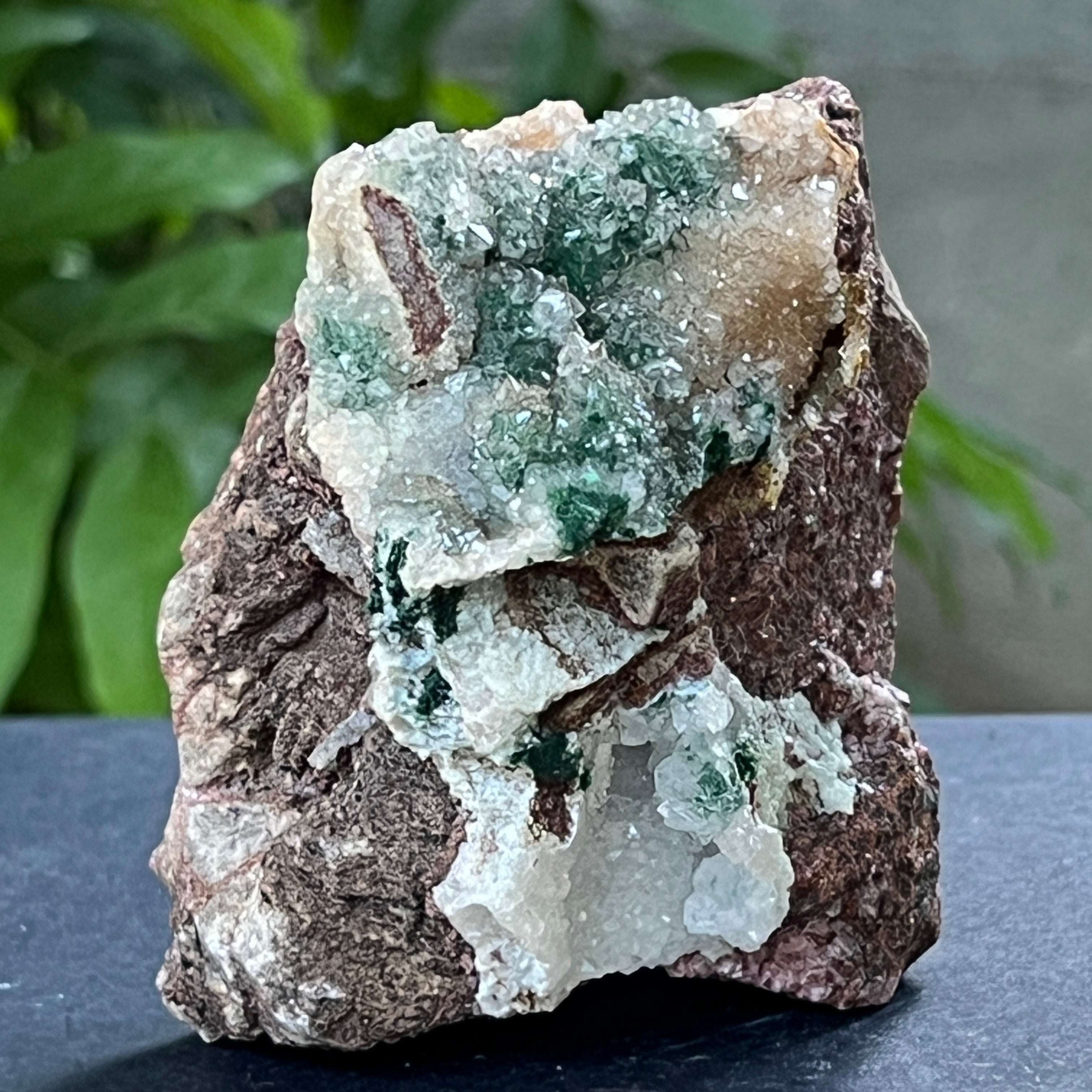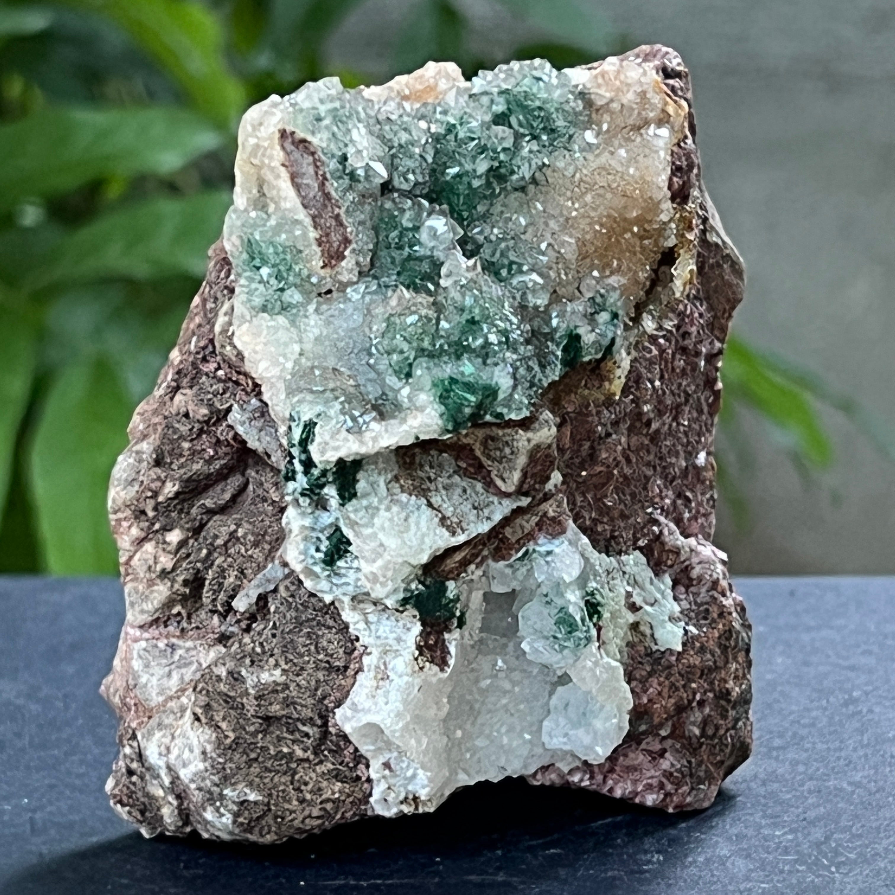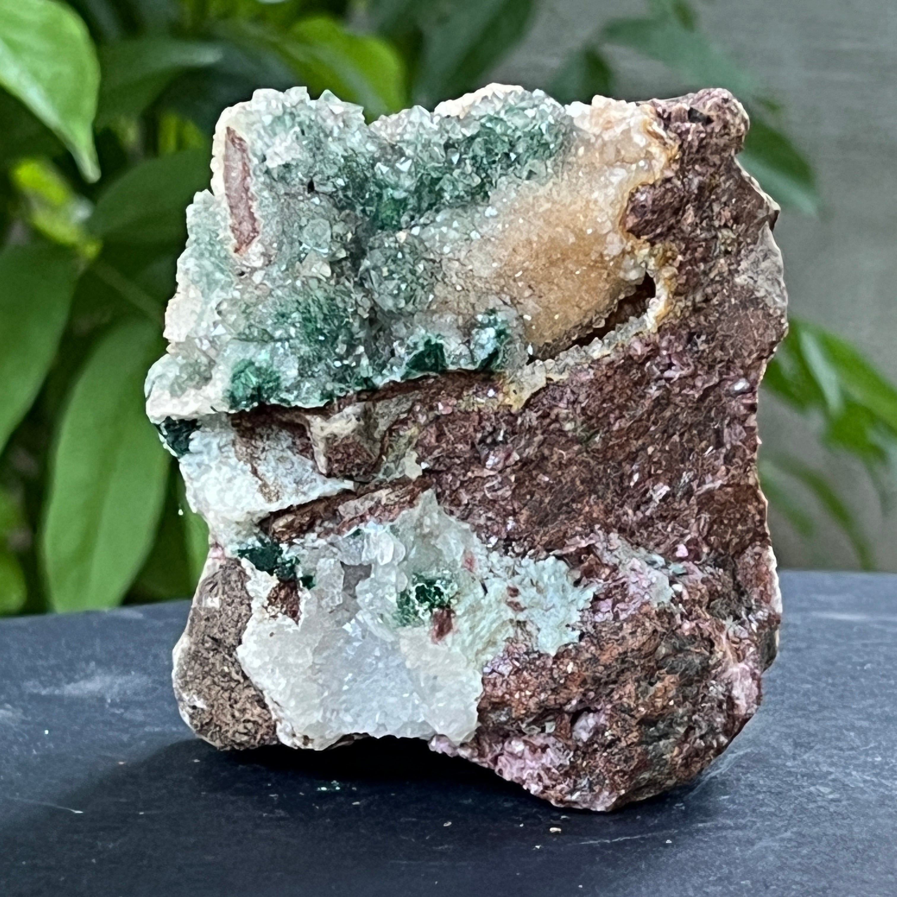 Egy ritka természetes alkimiai darab, ahol a dolomit finom fénye összefonódik a malachit intenzív zöldjével, mindez egy erős rézmátrixba gyökerezik. Ez az autentikus klaszter magában hordozza a föld lassú történetét – egy találkozást a nyugalom, az átalakulás és az életenergia között.