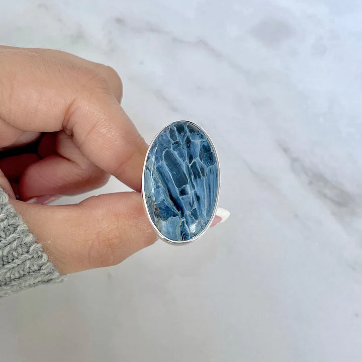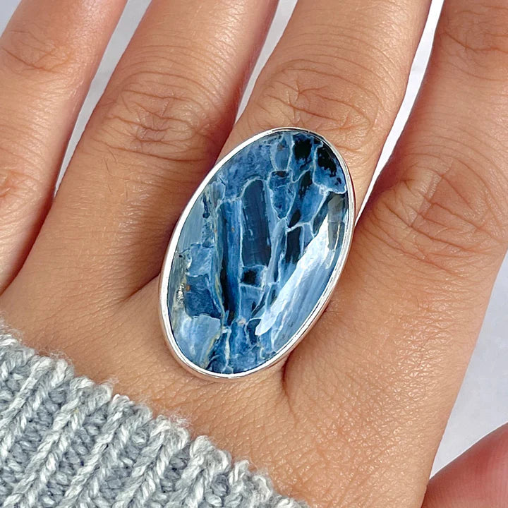 Ez a lenyűgöző gyűrű, készült 925 ezüst, cabochon díszíti természetes macskakő csepp alakú. A kő textúrája a kék, fekete és arany mély árnyalatait tárja fel, amelyek az éjszakai égbolton látott vihar örvénylésére emlékeztetnek.