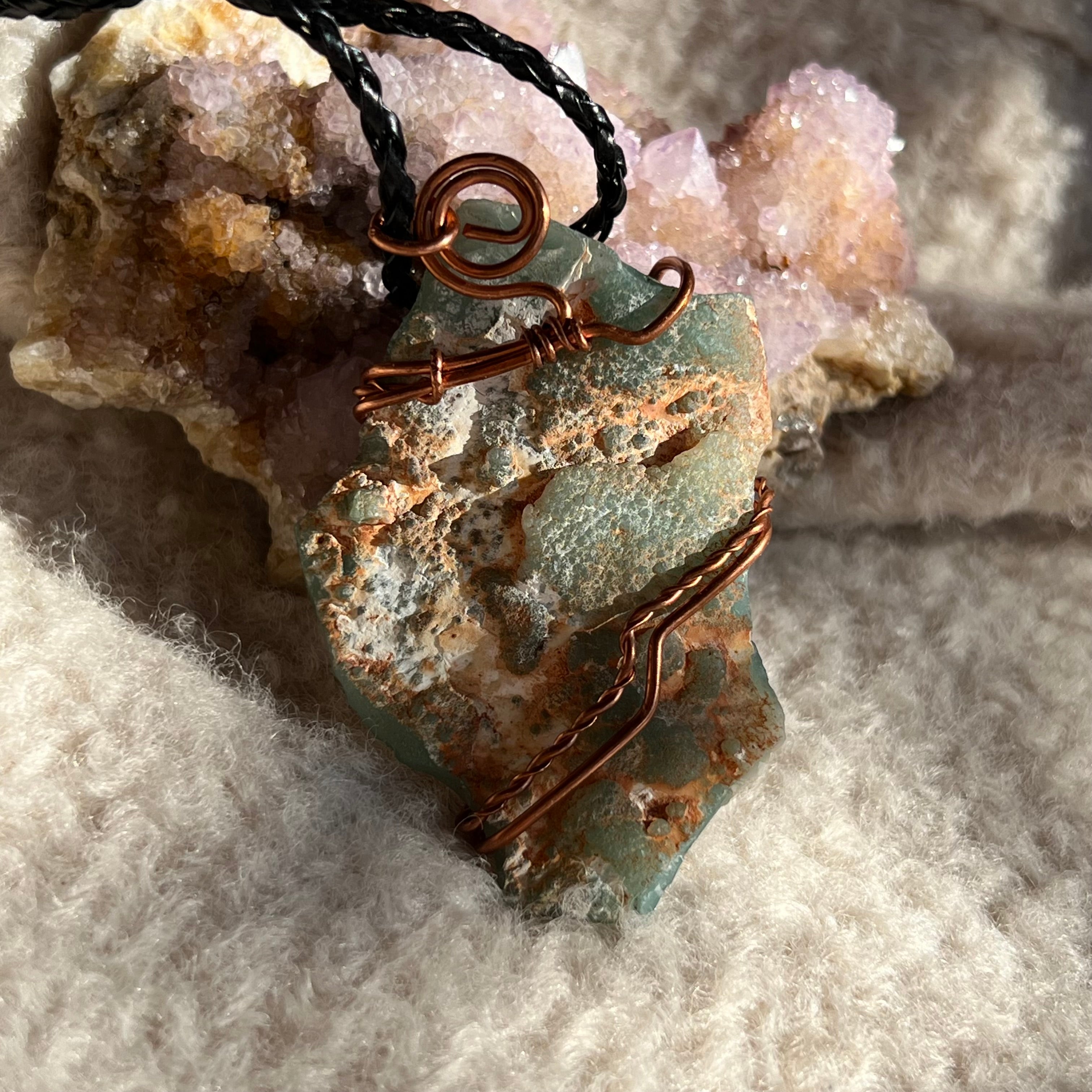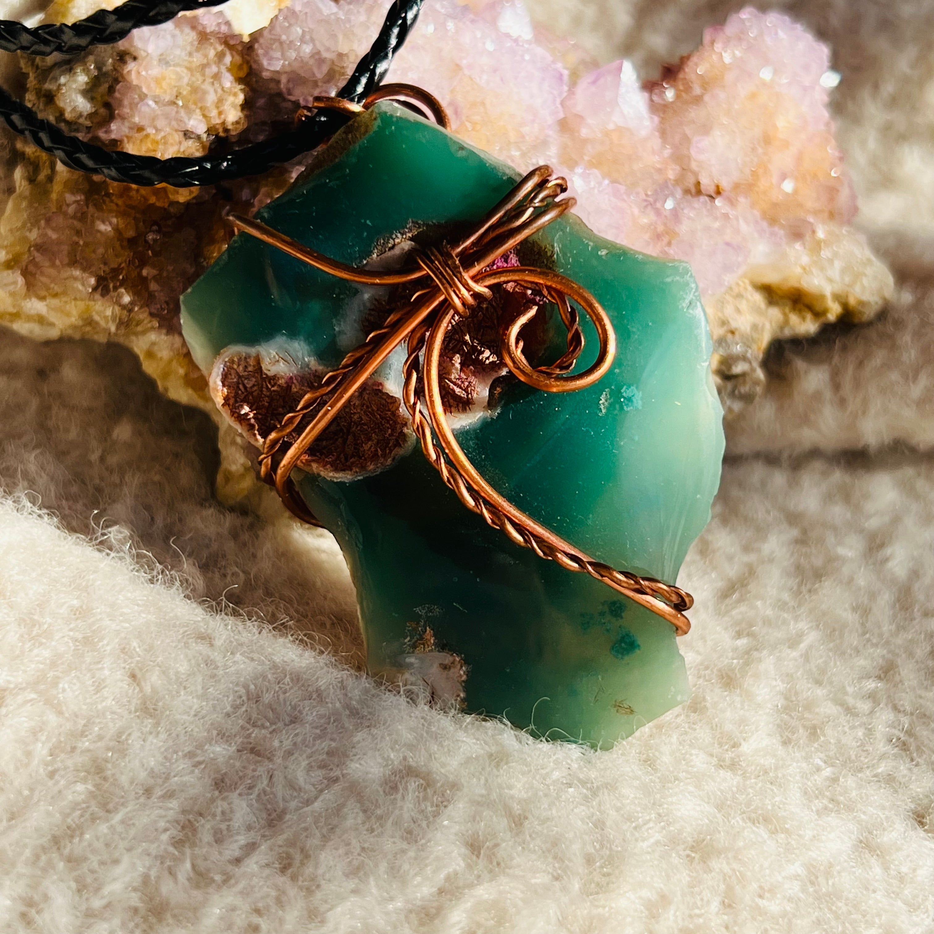 Kriszopráz medálos nyaklánc rézben, művészi dróttal, fonott fekete zsinórral, kézzel készített.