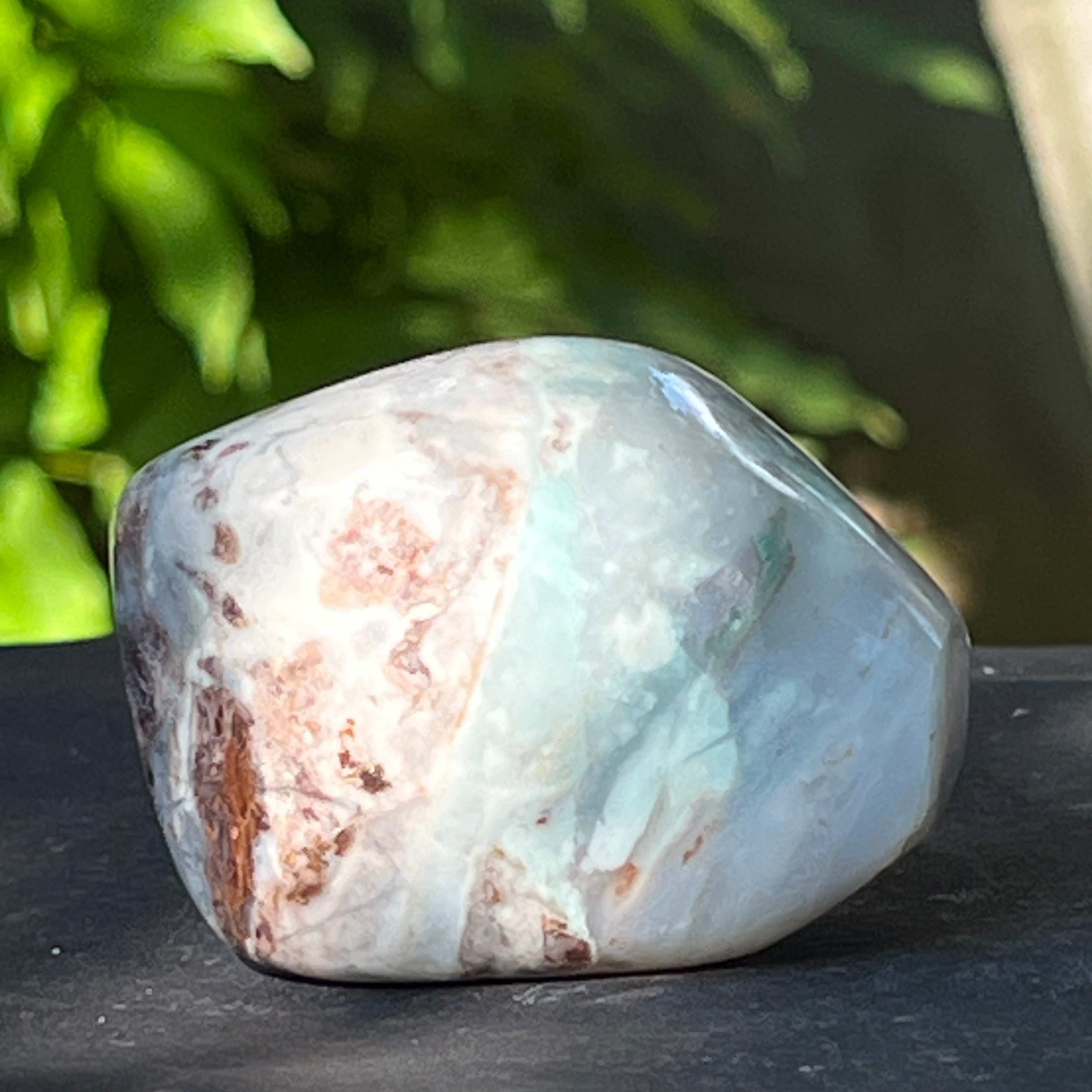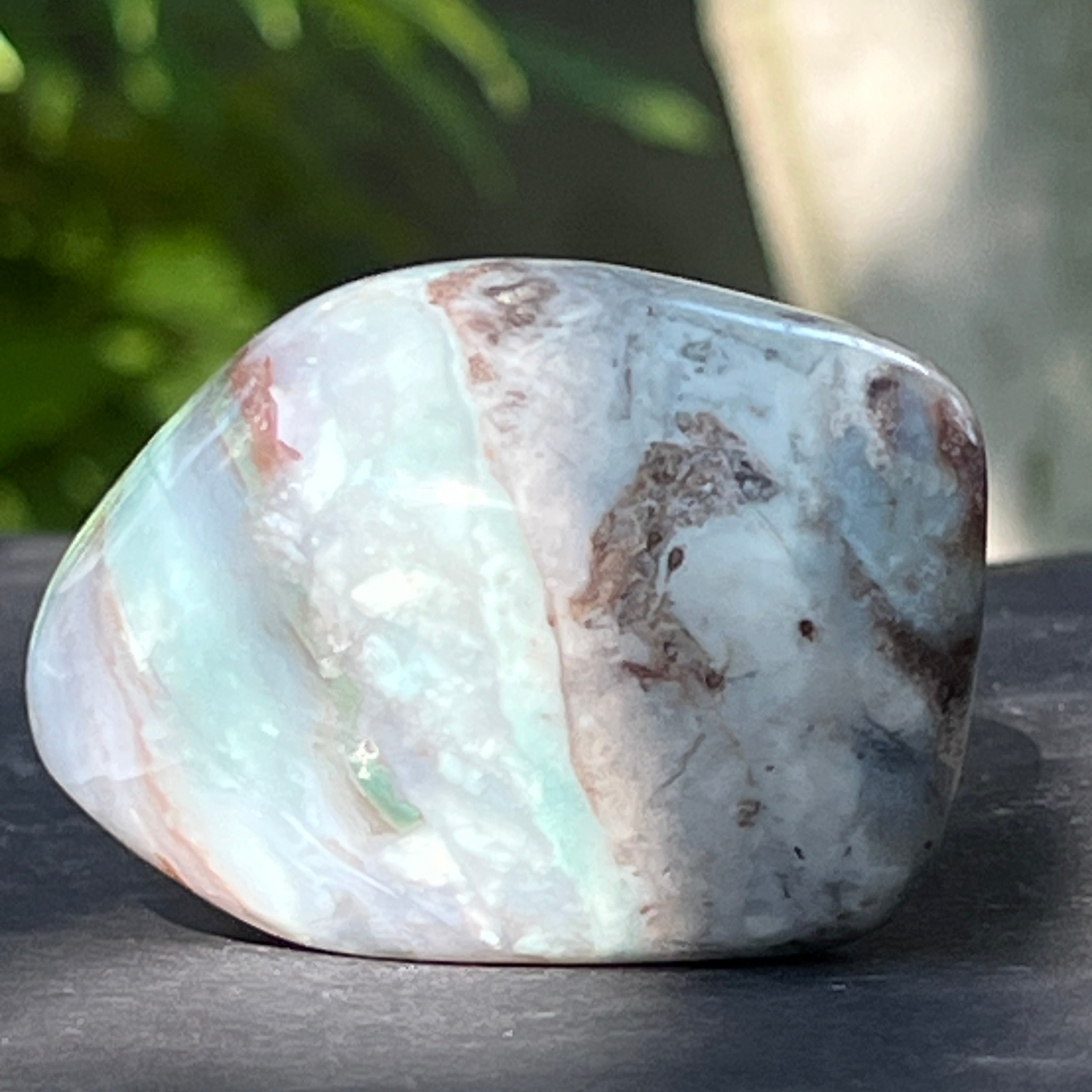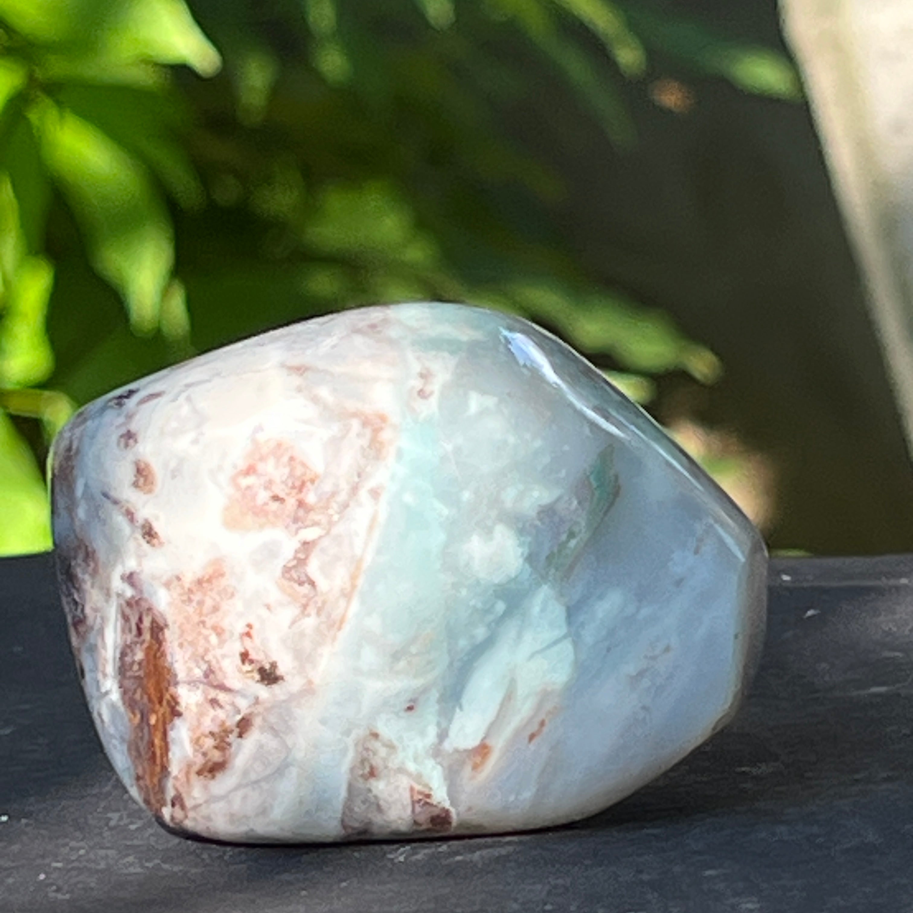 A textúrája élénk – tejfehér kalcedon erekkel, diszkrét kvarc repedésekkel és rozsdás mátrixfoltokkal – mind a lassú kialakulás jelei egy összetett, feszültségekkel teli geológiai környezetben.