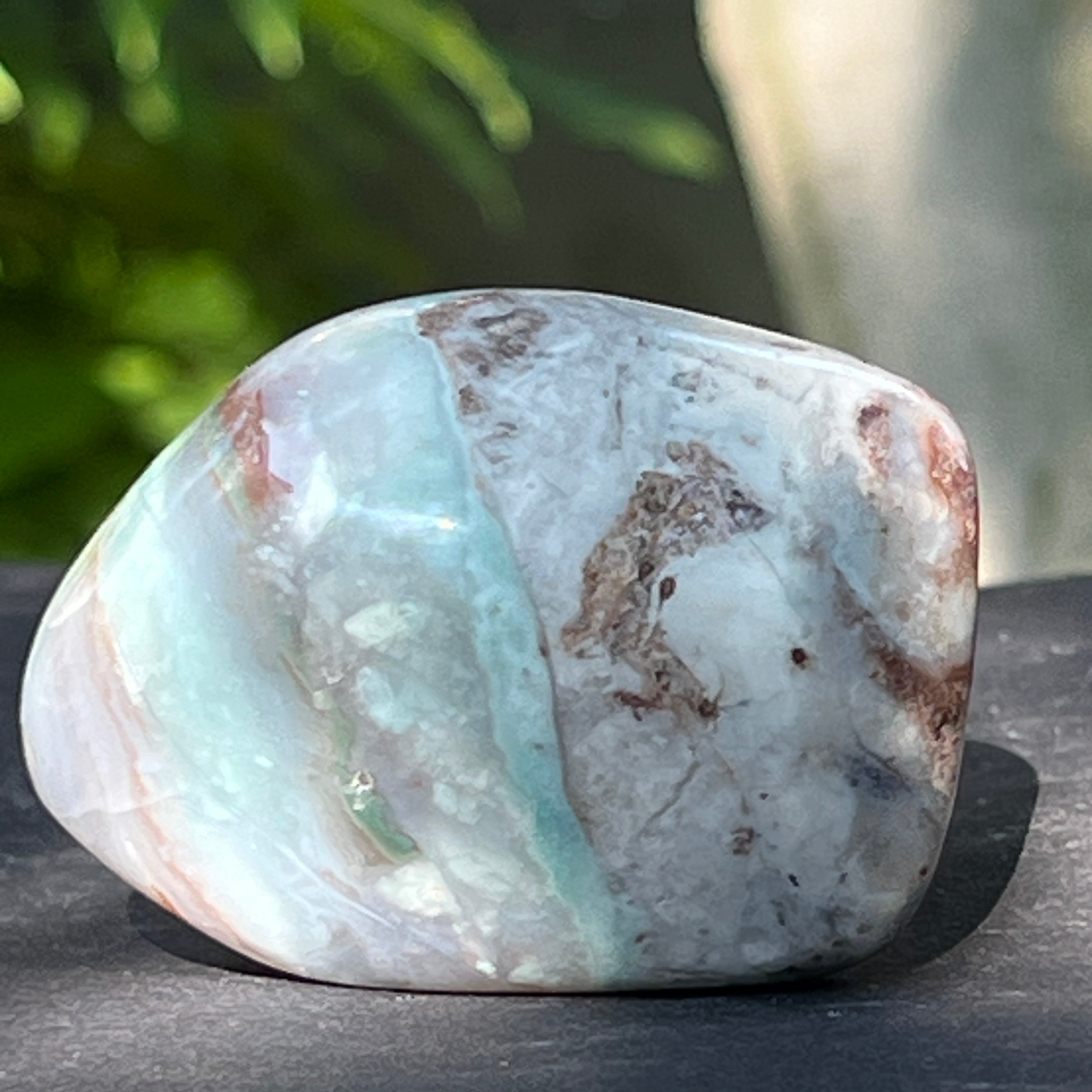 Ez egy természetes, sértetlen forma egy kromos csehszideritből – nehezen található ásvány, kizárólag Zimbabwe-ből származik, és élénk színéért értékelik, amely nem nikkelből ered (mint a krizopráz esetében), hanem a kristályszerkezetében mélyen lüktető krómból. Ebben a különleges változatban a kék és zöld beszúrások lenyűgöző színjátékot hoznak létre, ahol a fényáteresztő és az opak, az összetett és a légies között finom átmenetek figyelhetők meg.