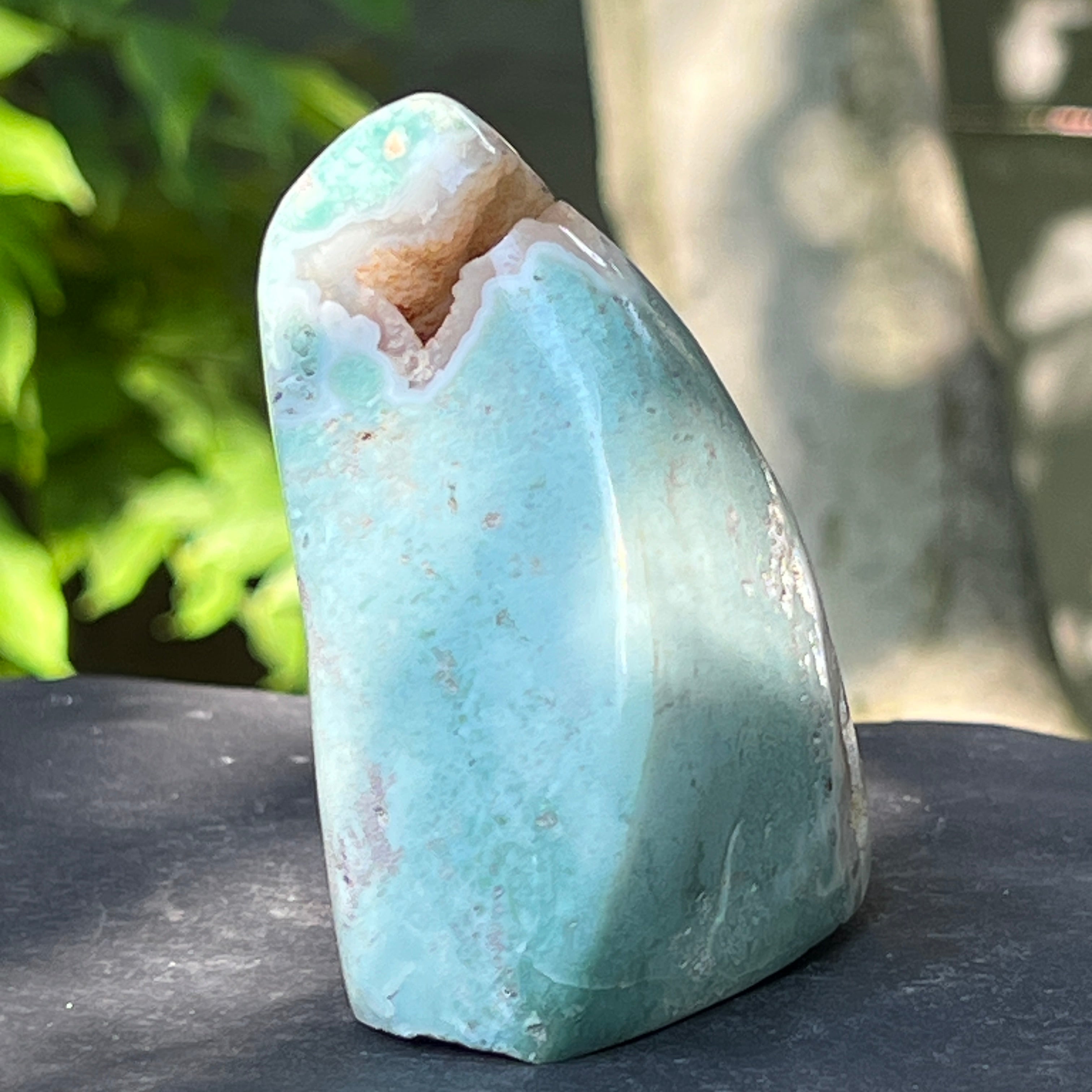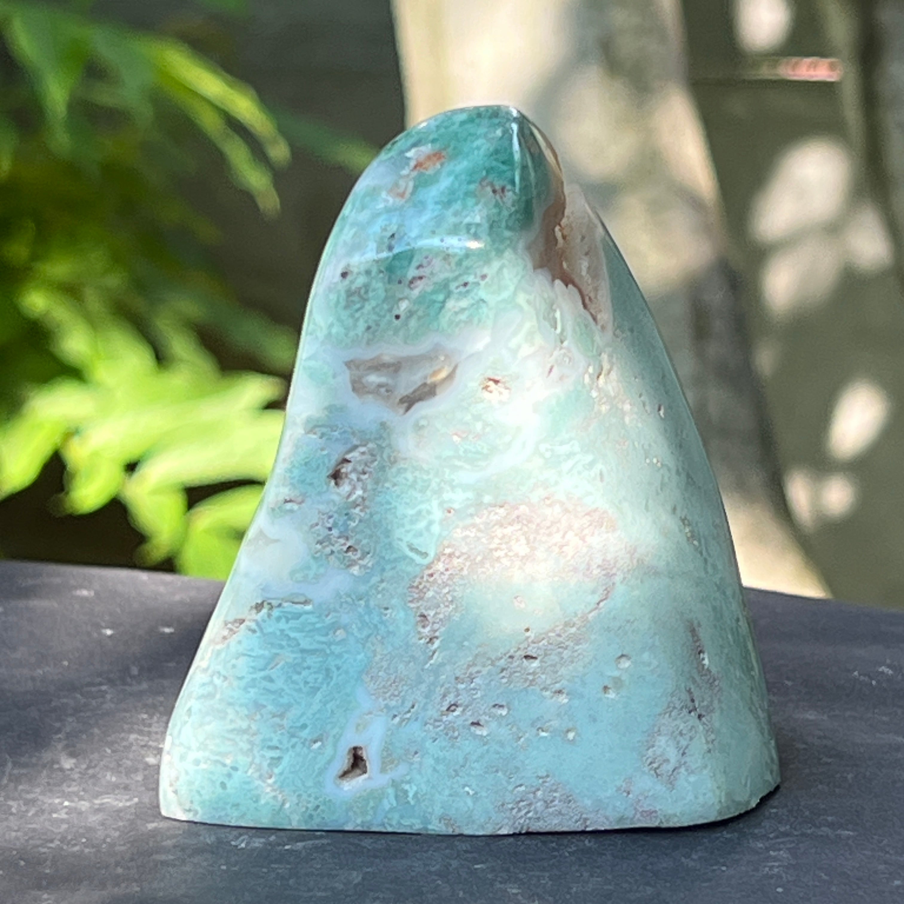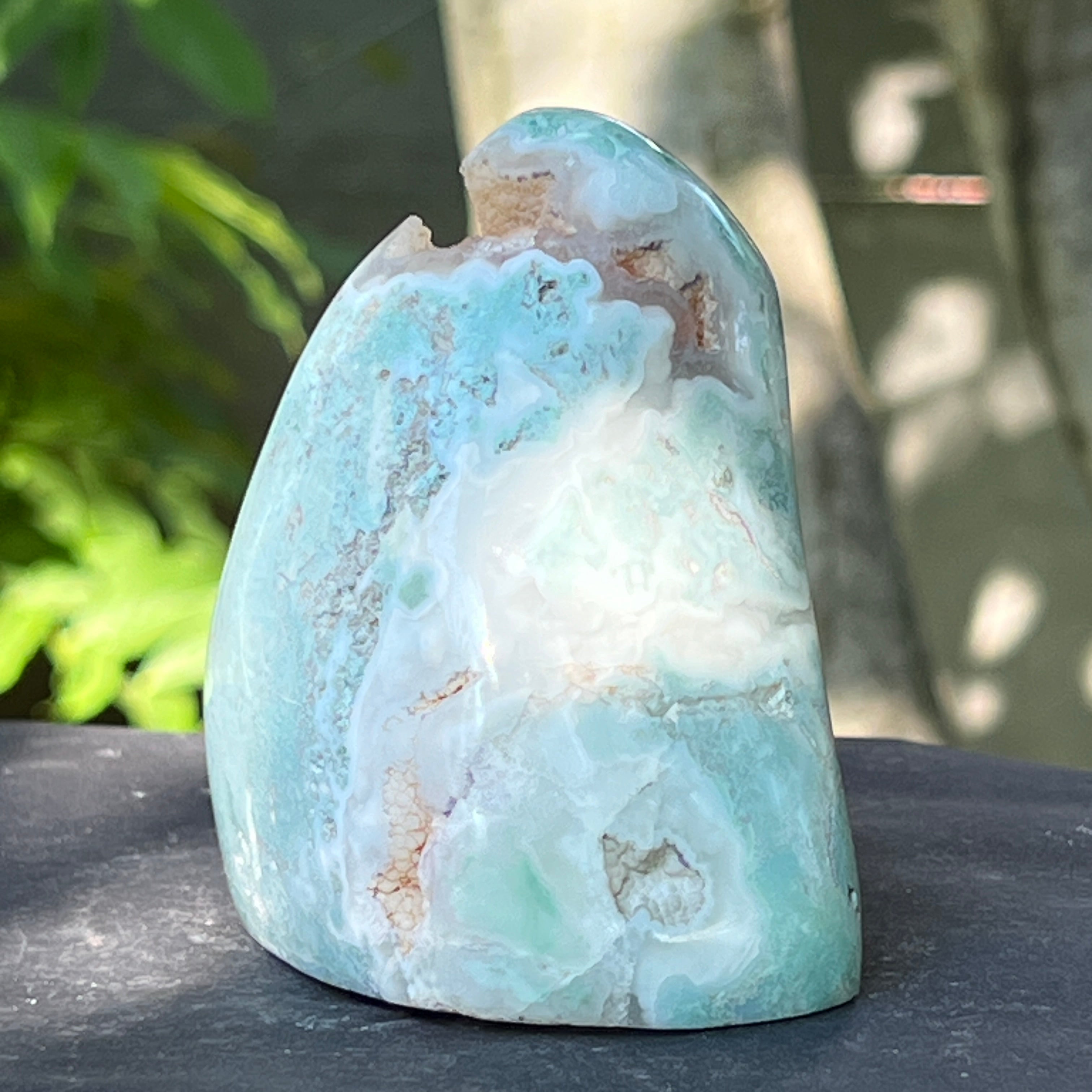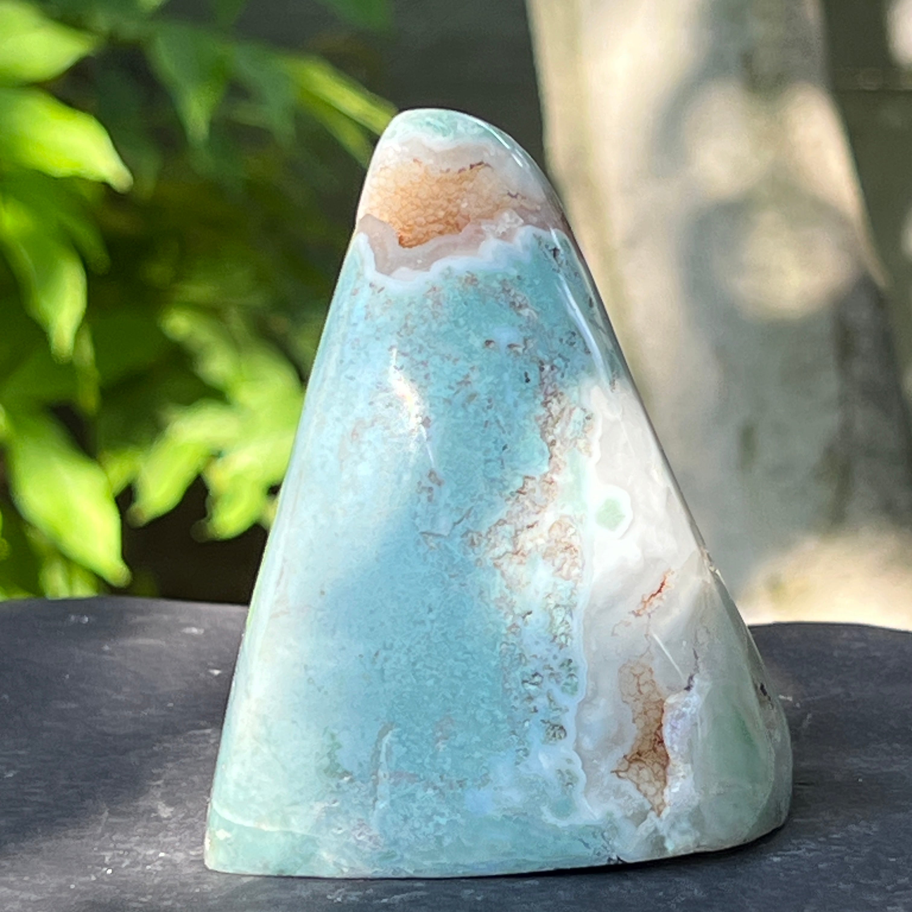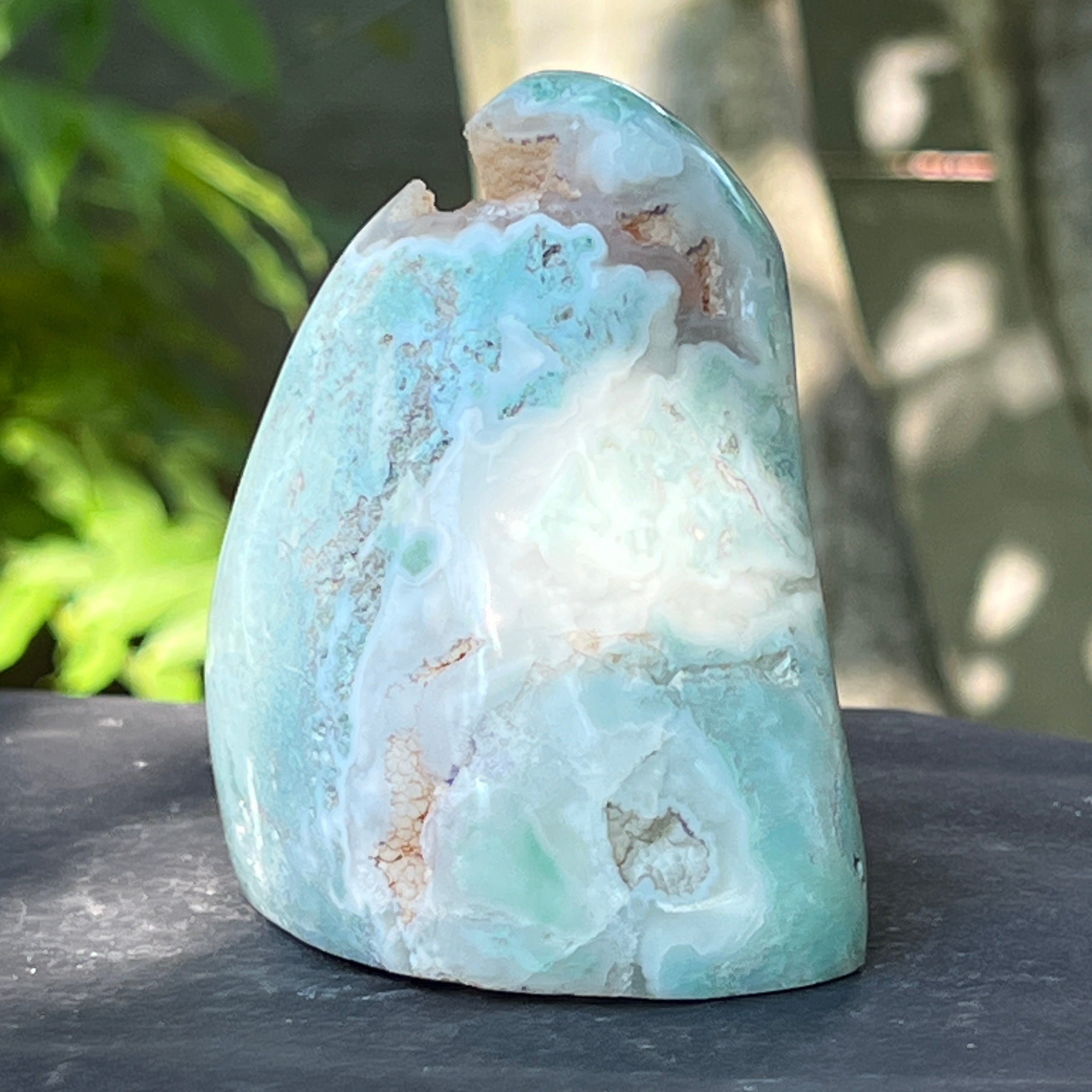 Ez egy természetes, érintetlen forma, egy krómot tartalmazó kalcedoné – nehezen található ásvány, kizárólag Zimbabwe-ből bányásszák, és élénk színéért értékelik, amely nem nikkelből származik (mint a krizopráz), hanem a kristályszerkezetében mélyen pulzáló krómból. Ebben a különleges változatban a kék és zöld beékelt részek a színek lenyűgöző játékát hozzák létre, sima átmenetekkel az áttetsző és az átlátszatlan, a sűrű és a könnyed között.