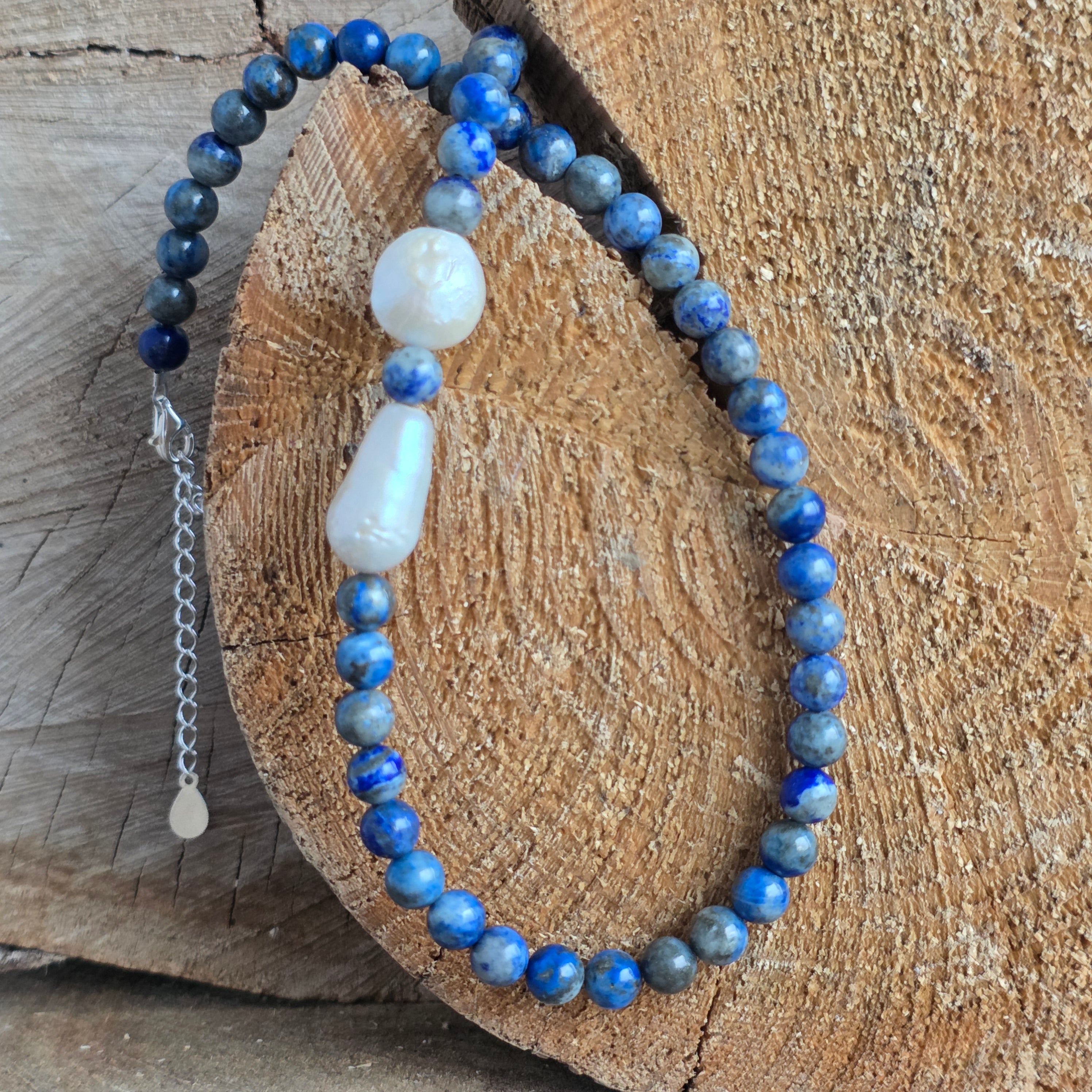 Készítve 6 mm-es természetes lapis lazuliból, amely mély kék árnyalataival és a pirit finom arany visszfényével világít, a nyakláncot kiegészítik two természetes gyöngy , amelyek eleganciát és egyensúlyt kölcsönöznek neki. A gyöngyöket gondosan helyezték el, hogy kiemeljék a lapisz természetes szépségét és kifinomult kontrasztot adjanak.