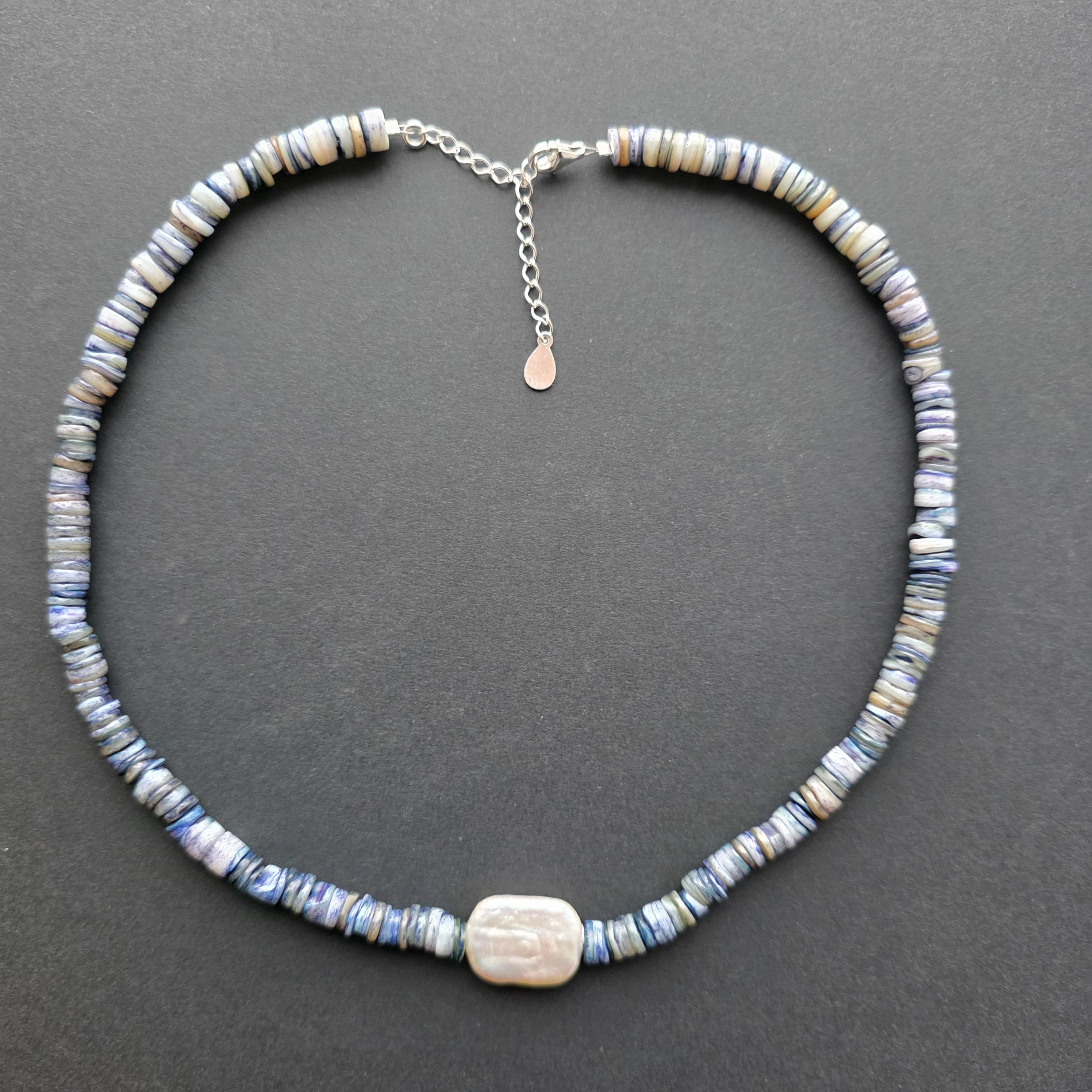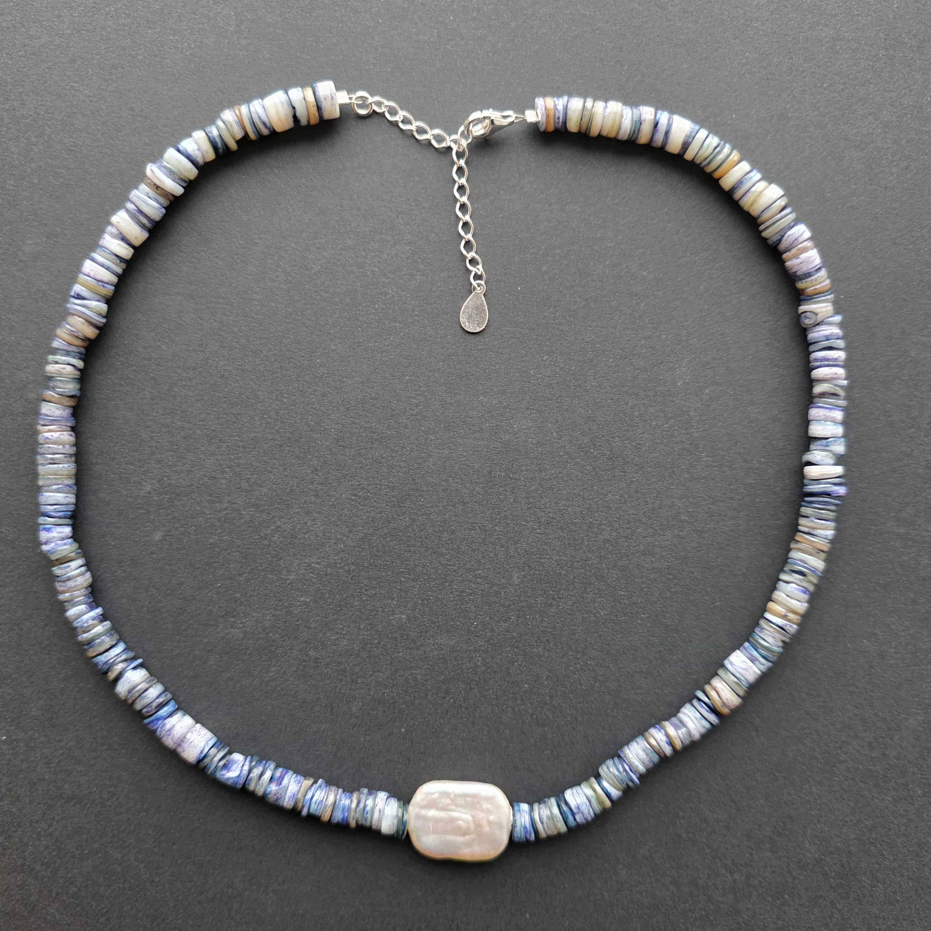 Design: finom lapis lazuli korongok középre helyezett természetes fehér gyönggyel, elegáns kontraszt a királykék és az anyaszerűen csillogó színek között