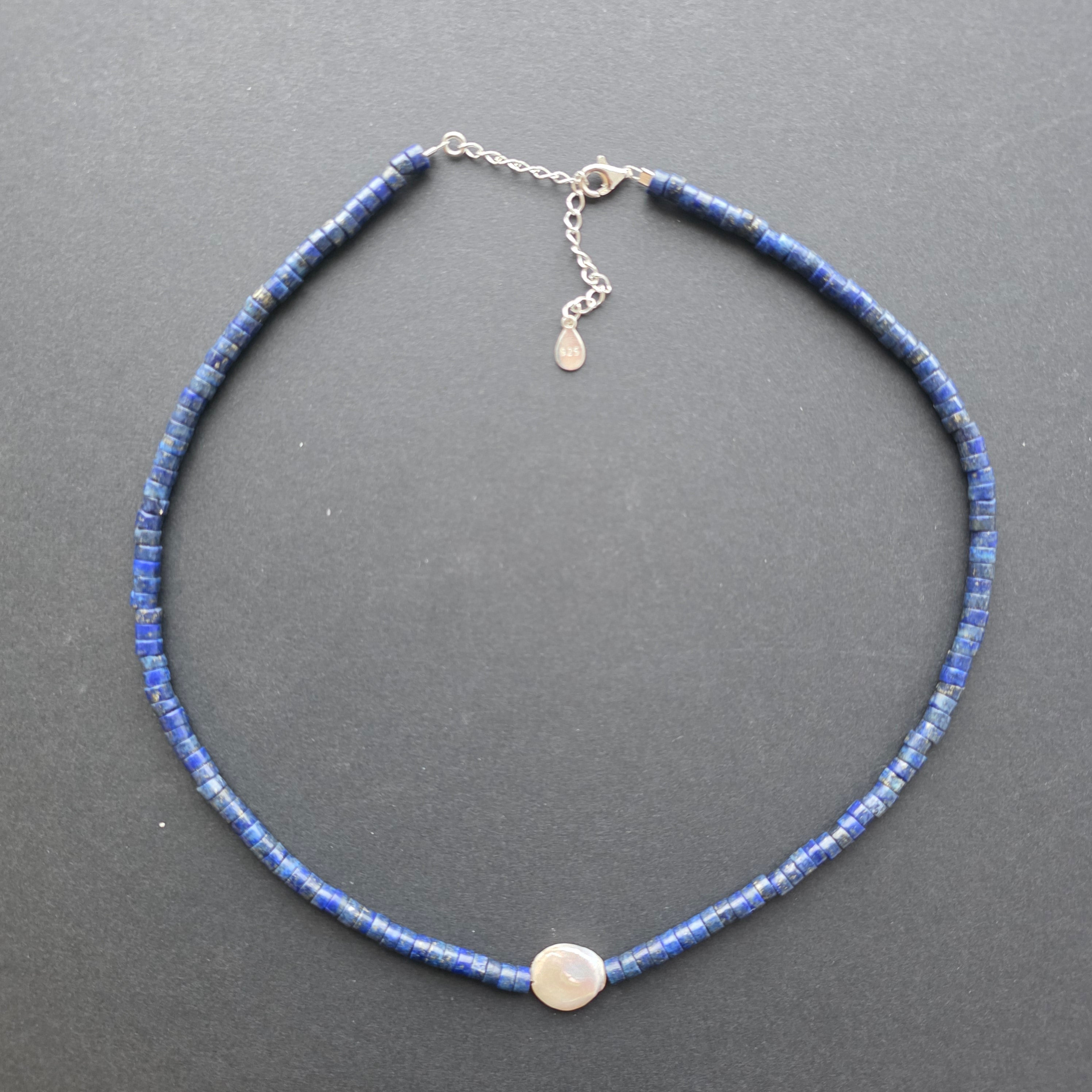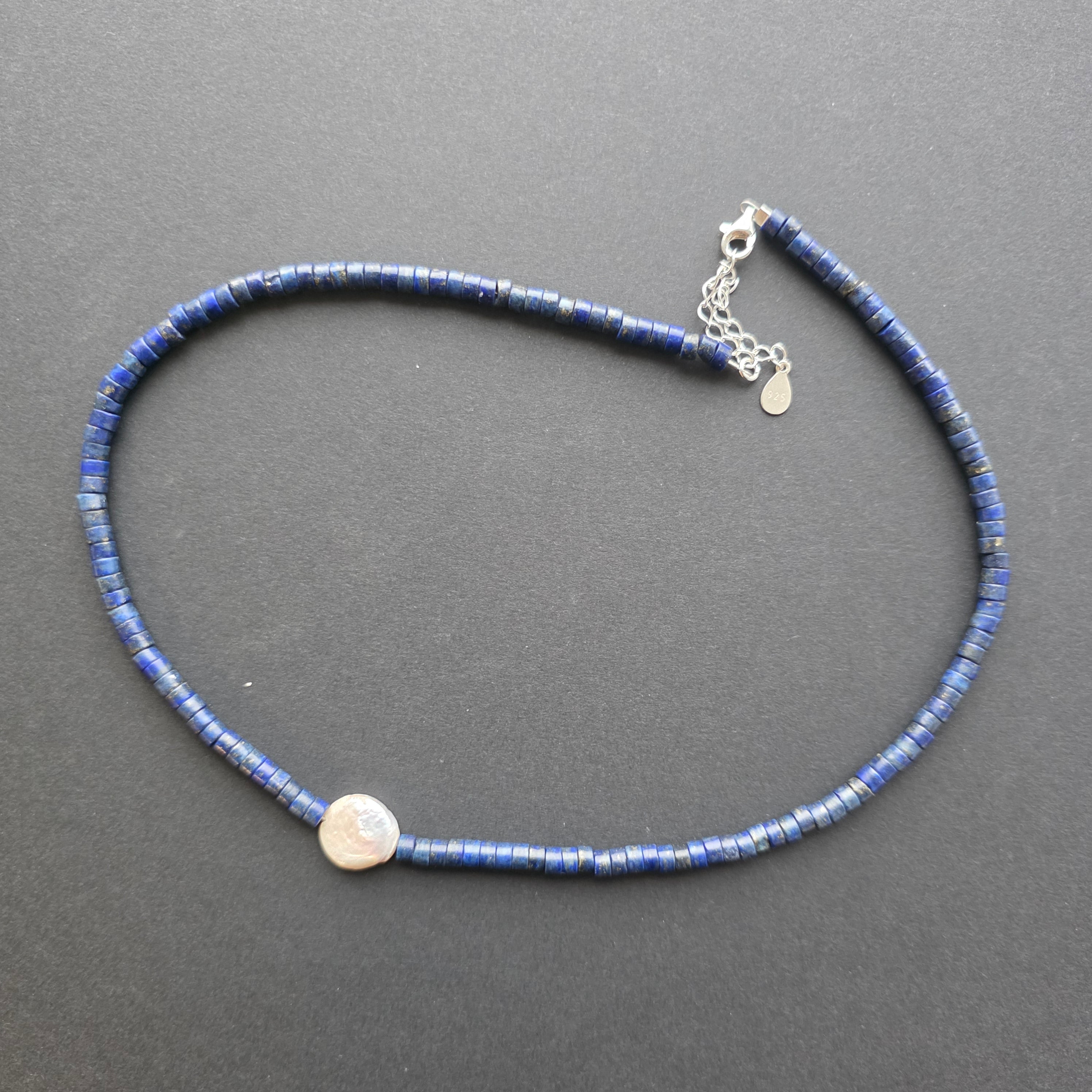 Olyan nyaklánc, amely az eget és a tengert hozza össze, tökéletes egyensúlyban a mélység és a tisztaság között. Természetes lapis lazuli, 4 mm-es korongokra vágva, intenzív kékben ragyog, arany pirit reflexekkel megszórva, az ókori Kelet csillagos éjszakáját idézve. A kompozíció közepén egy 1 cm-es természetes gyöngy nyugodt fénypontos kiemelést ad, mint a kék hullámokon lebegő fehér hab.