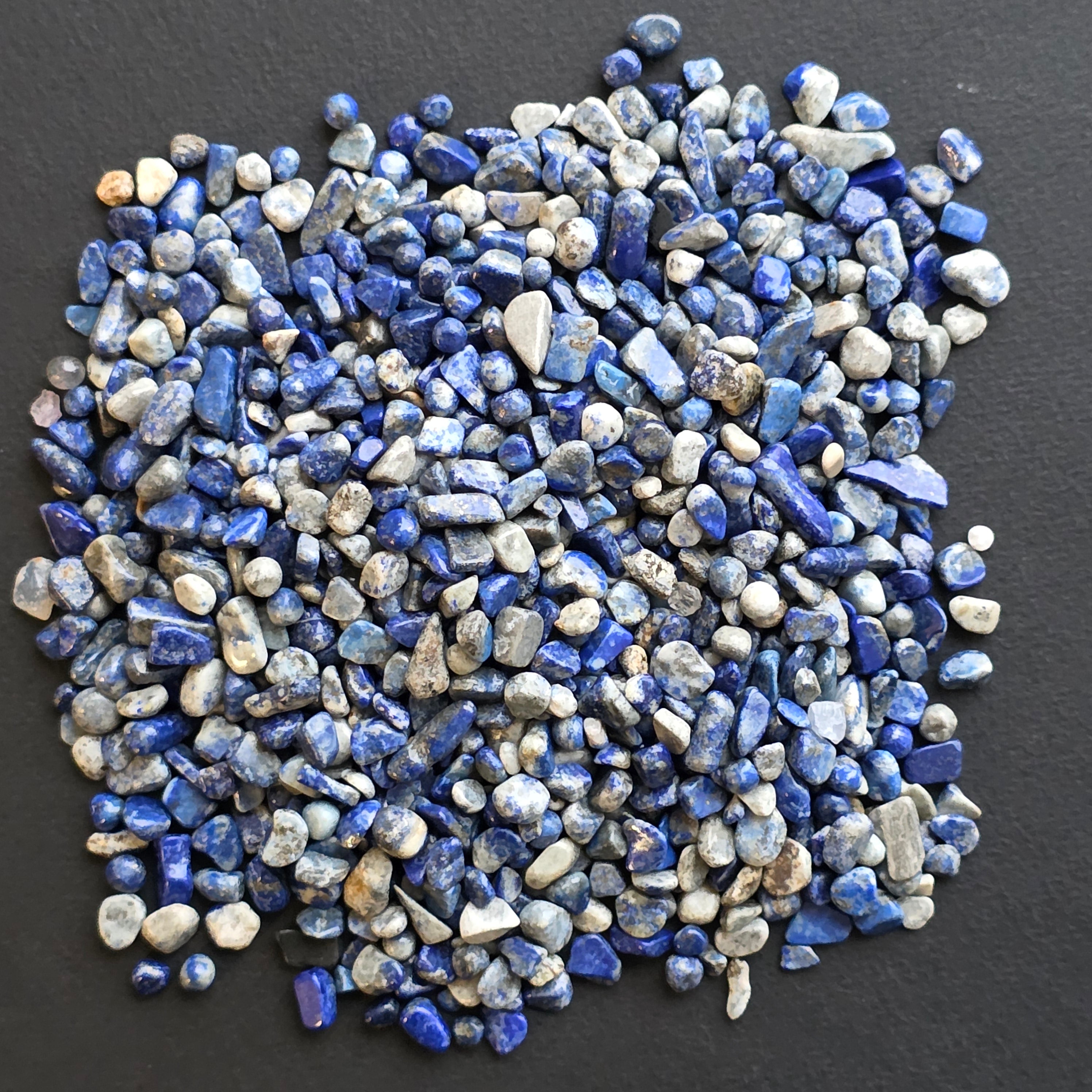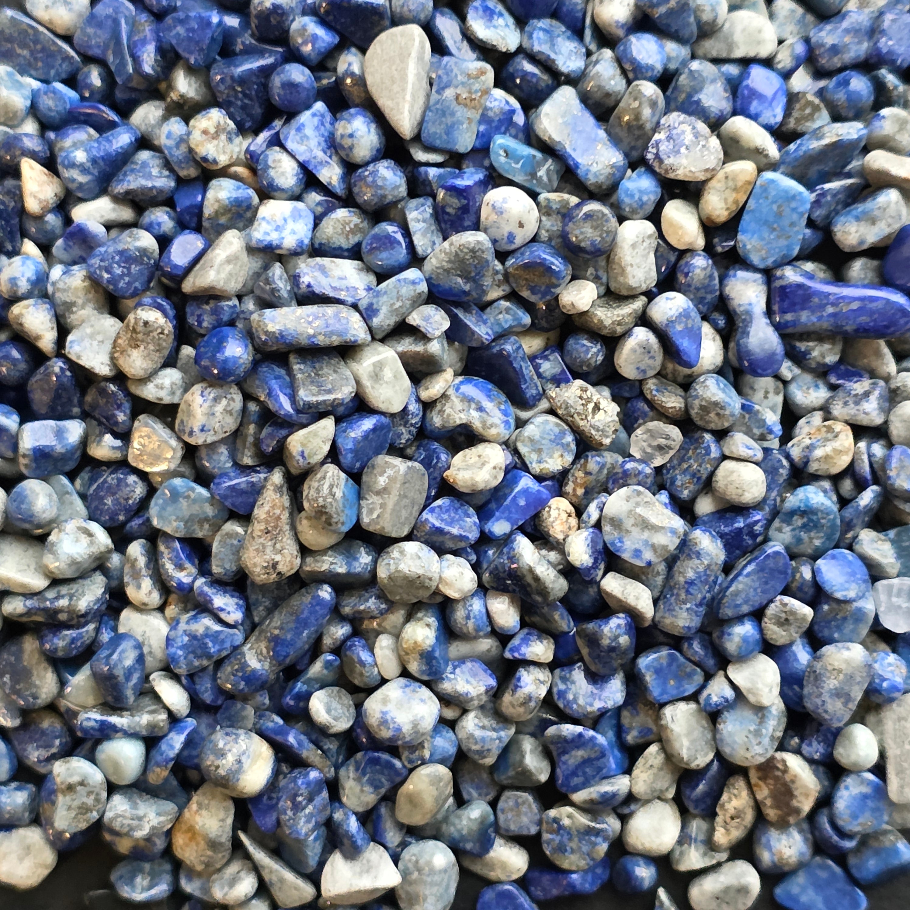 A Lápisz lazuli az ókor egyik legcsodáltabb köve, híres királyi, intenzív kék színéről, melyet apró pirit aranyszemcsék szórnak tele. Darált formában ezek a finom töredékek megőrzik a mélykék szín, a finom fehér kalcit erek és a diszkrét fémes csillogás természetes kombinációját, látványos és elegáns vizuális keveréket létrehozva.