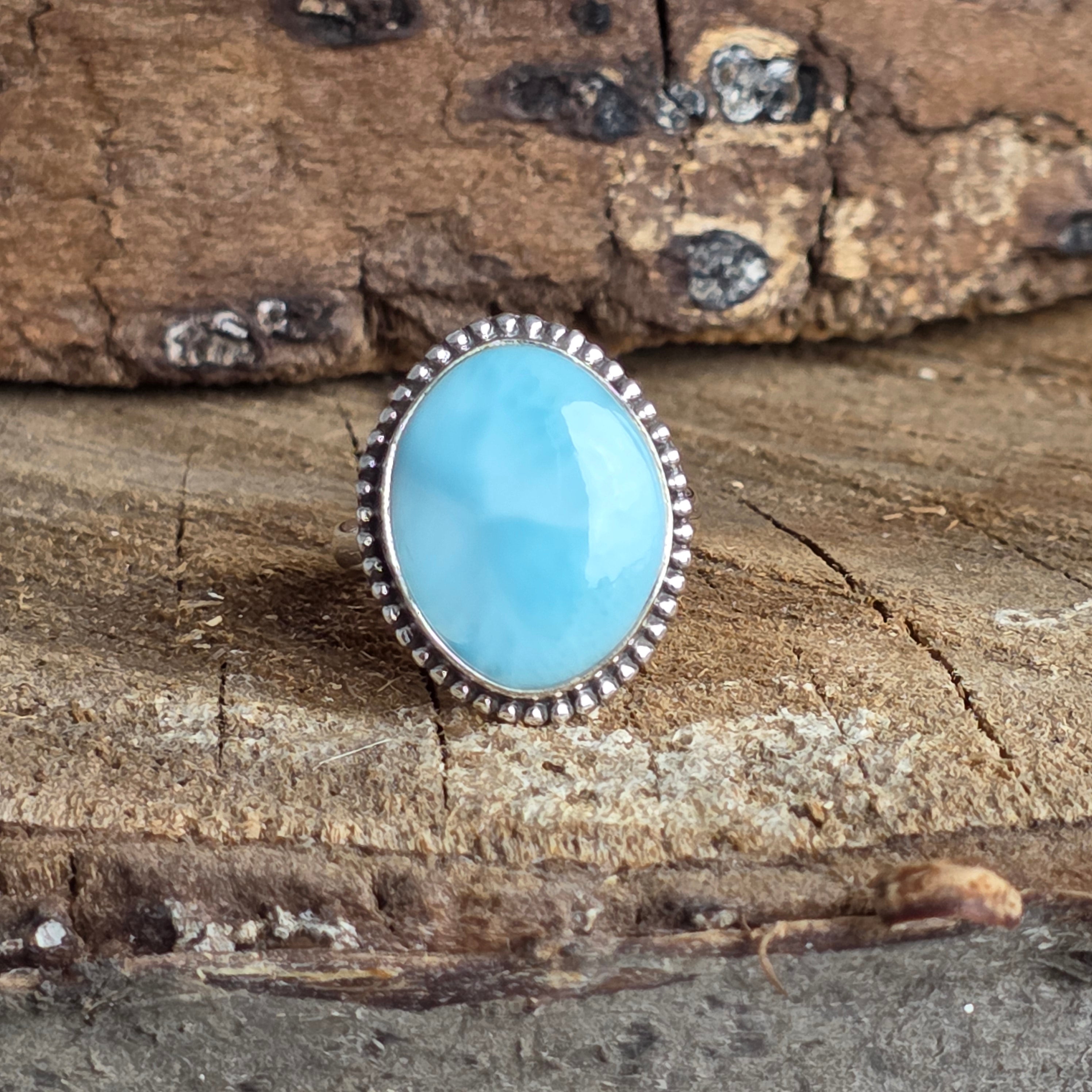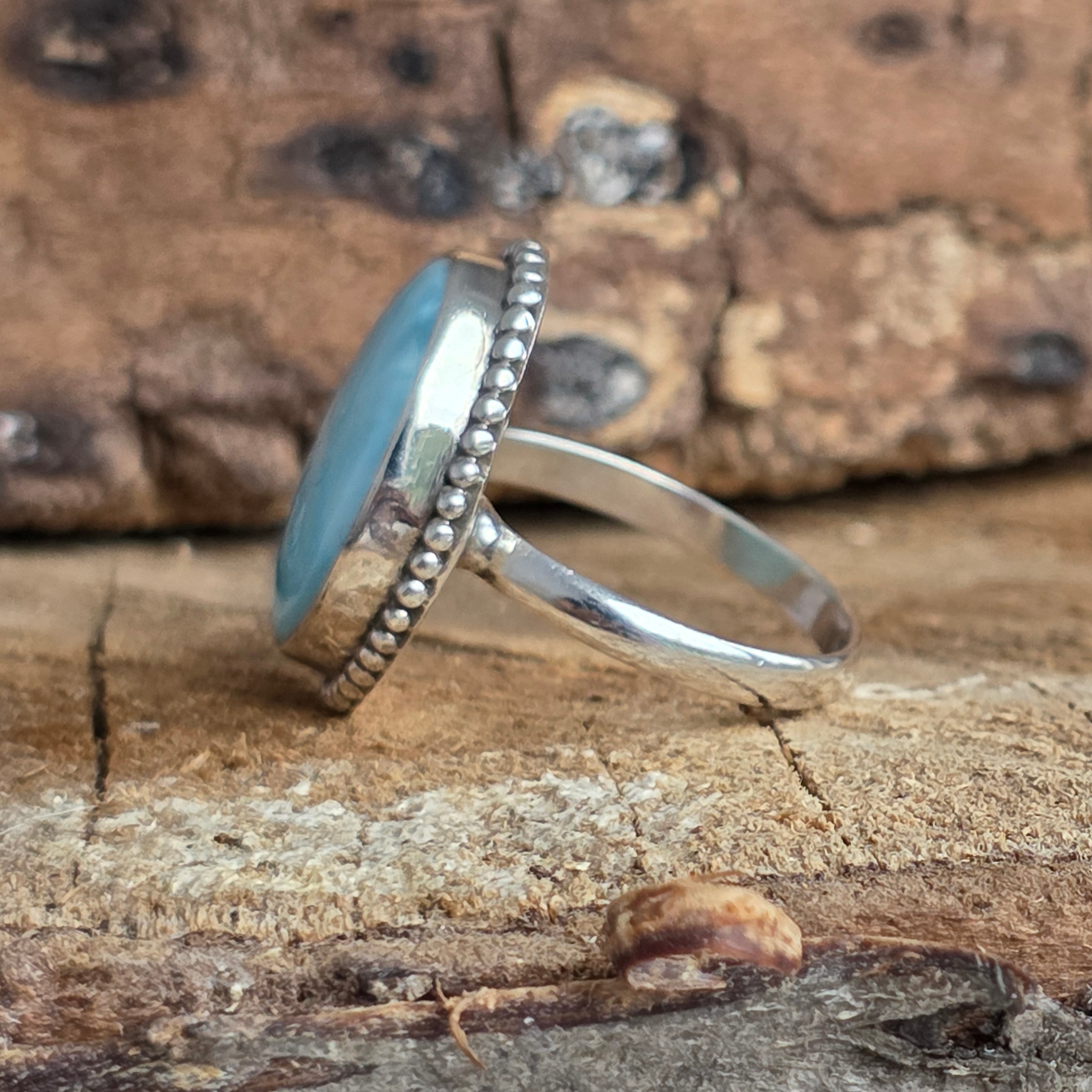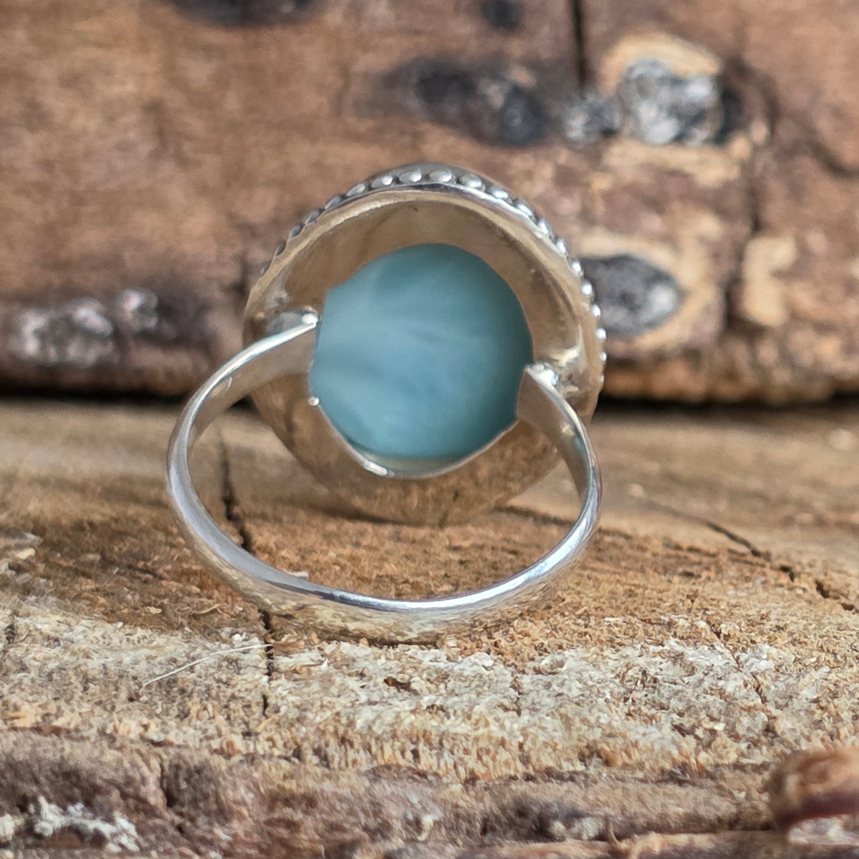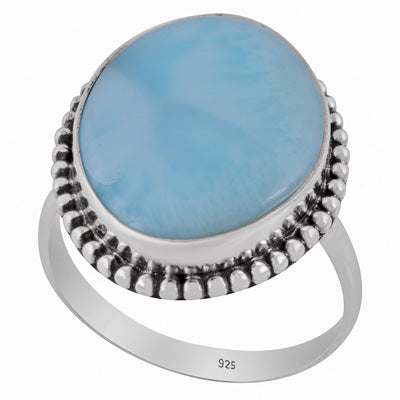 Egy elegáns 925-ös ezüst gyűrű természetes larimarral, karibi-tengeri kék árnyalatokban. A kézzel készített rawa work részletek mélységet és kifinomultságot adnak ennek az autentikus ékszernek.