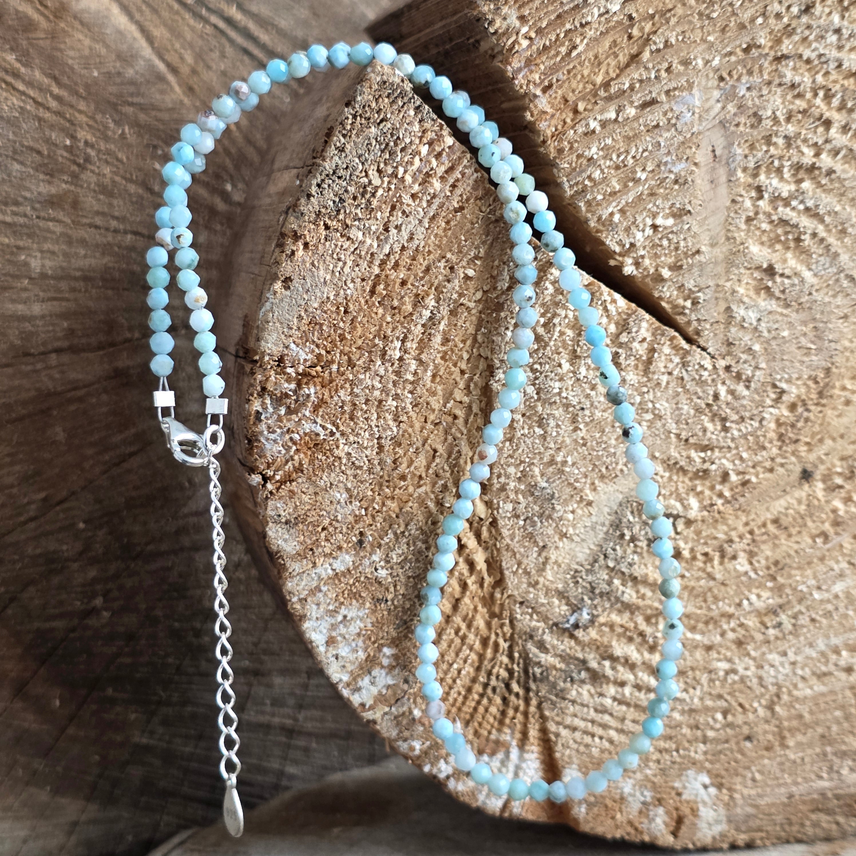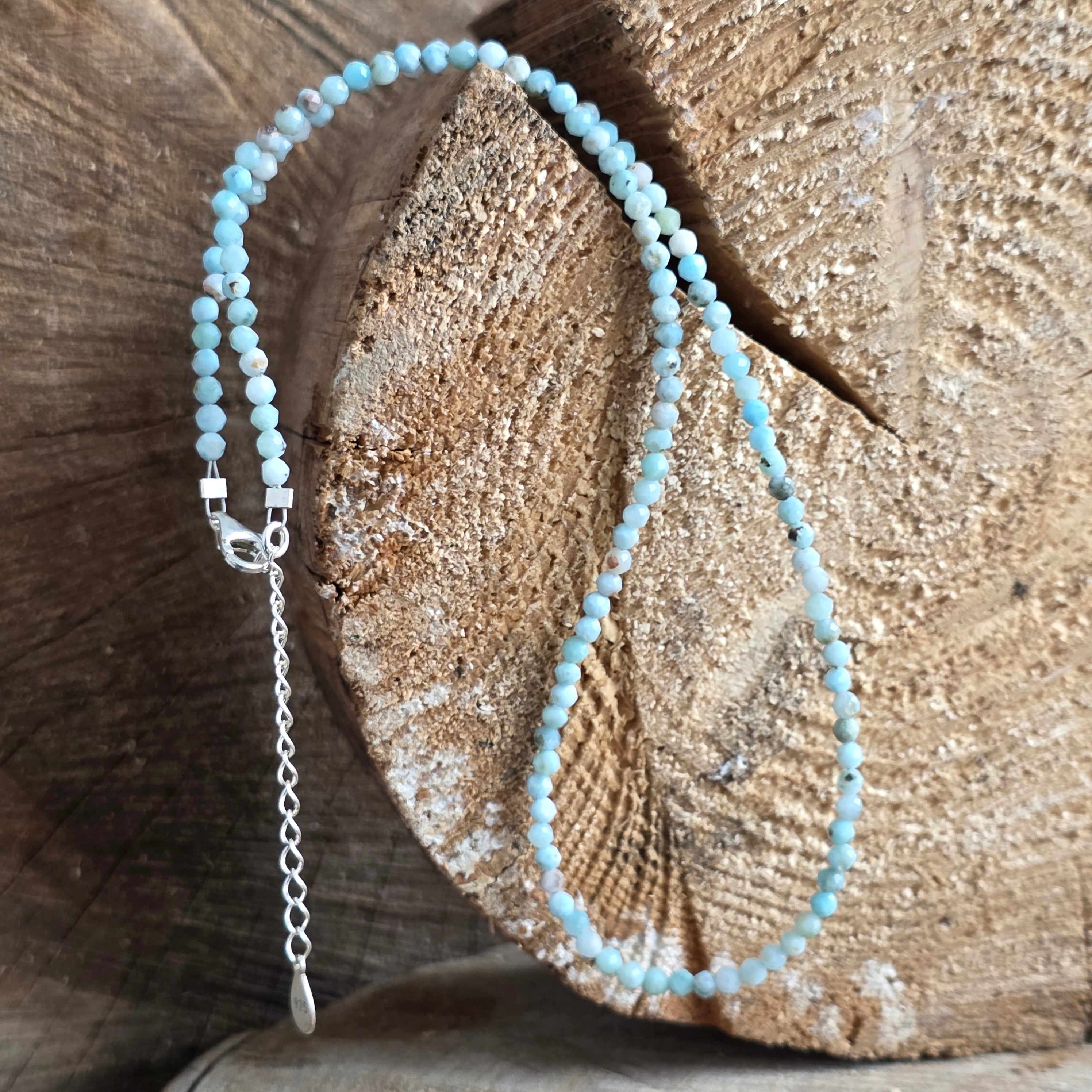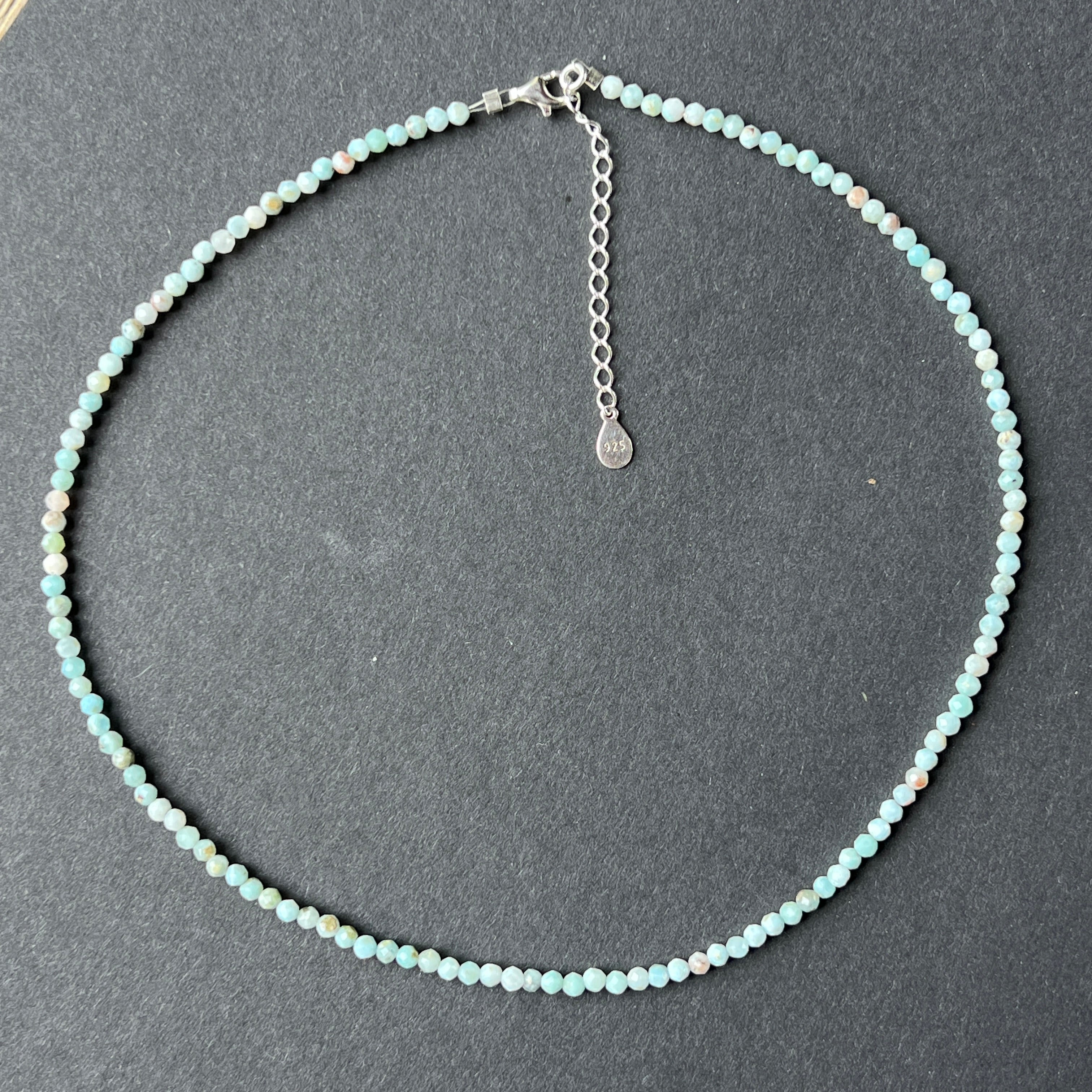 Egy nyaklánc, mint egy emlék az óceán mélyéből – gyengéd, világos és titokzatos, mint egy trópusi álom. A 3 mm-es csiszolt larimar gyöngyök áttetsző kék ég és tejfehér árnyalataiban tükrözik a fényt, mint a nyugodt vizek mozgó festménye.