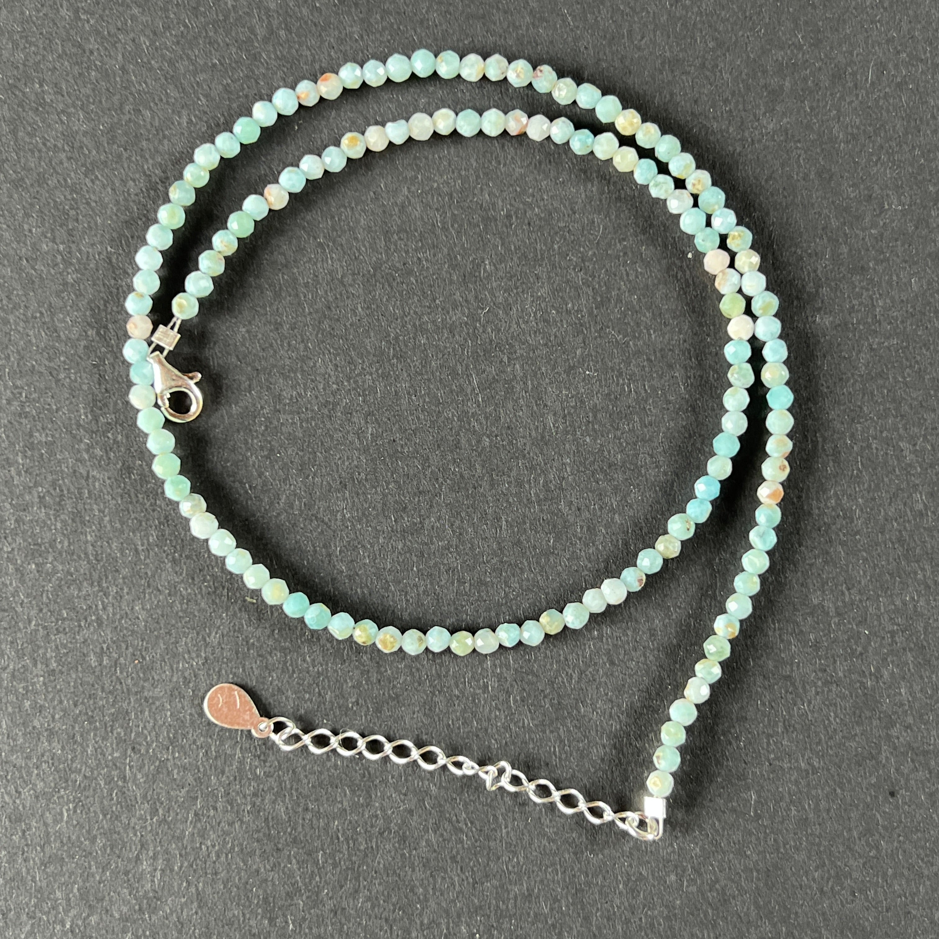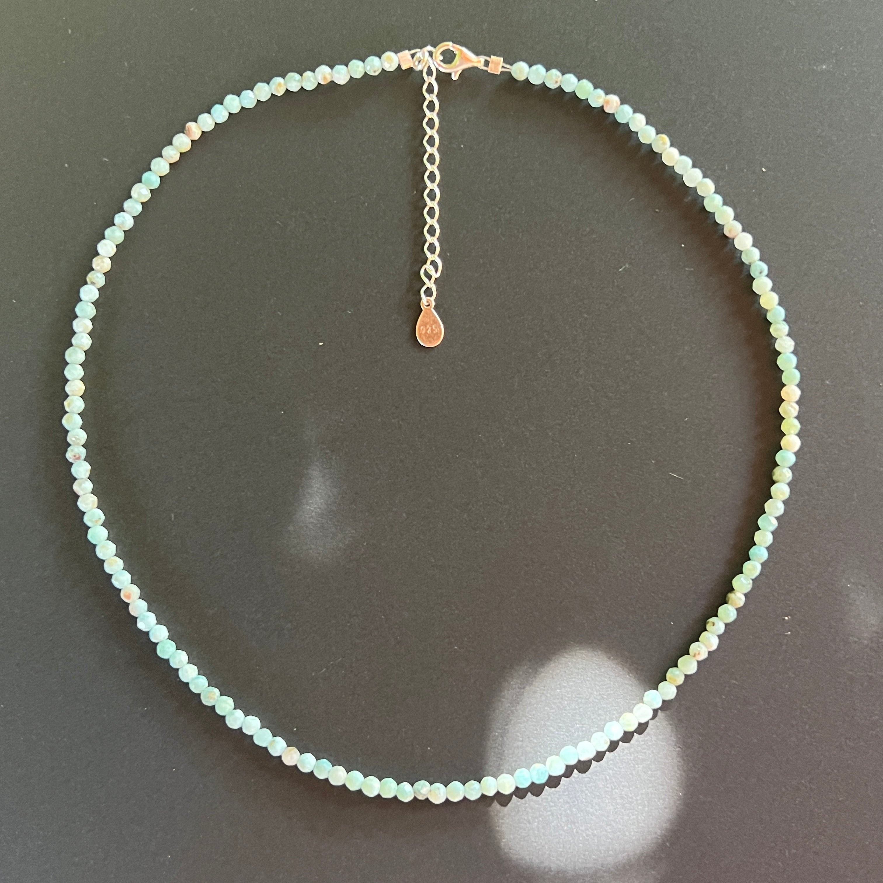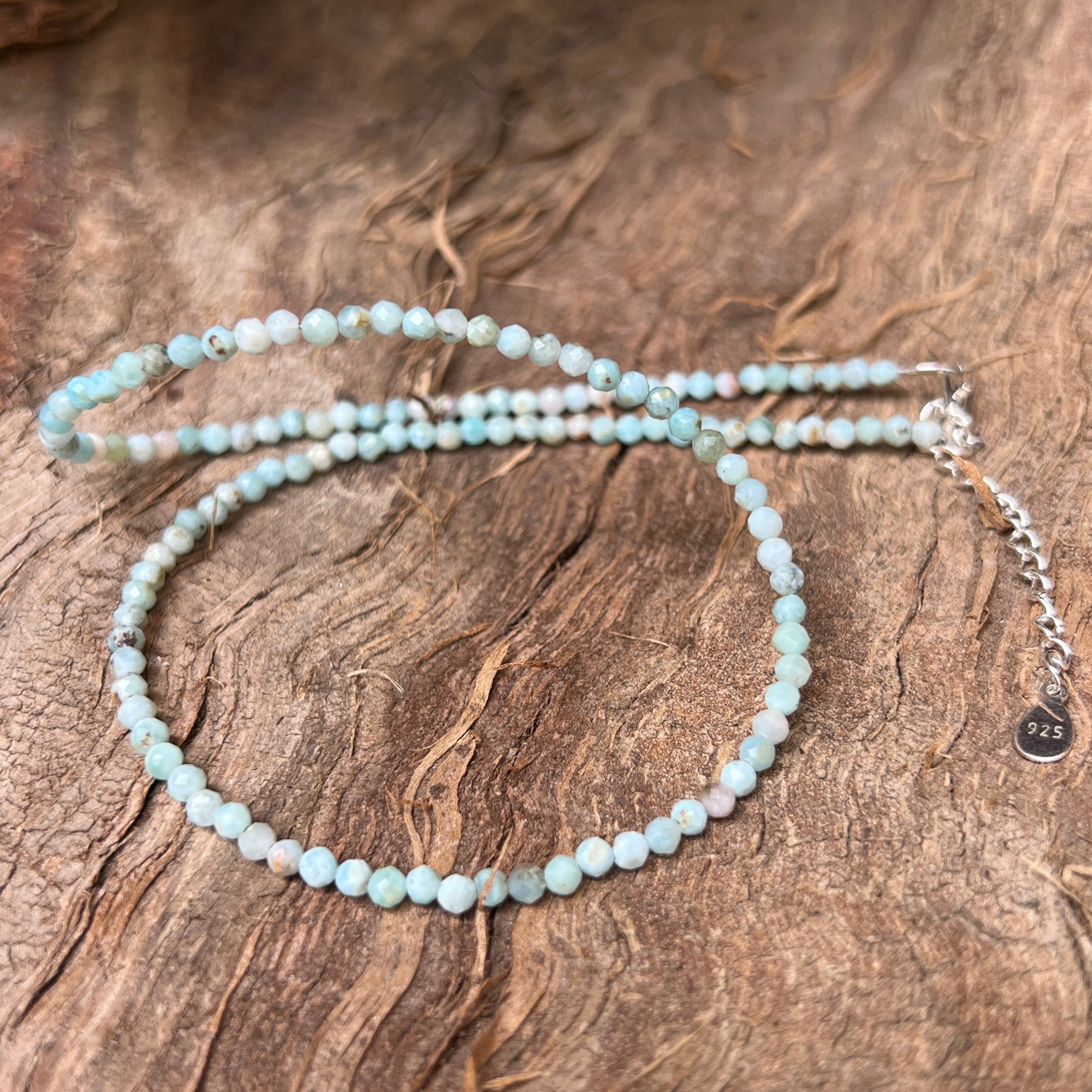 Egy nyaklánc, mint egy emlék az óceán mélyéből – gyengéd, világos és titokzatos, mint egy trópusi álom. A 3 mm-es csiszolt larimar gyöngyök áttetsző kék ég és tejfehér árnyalataiban tükrözik a fényt, mint a nyugodt vizek mozgó festménye.